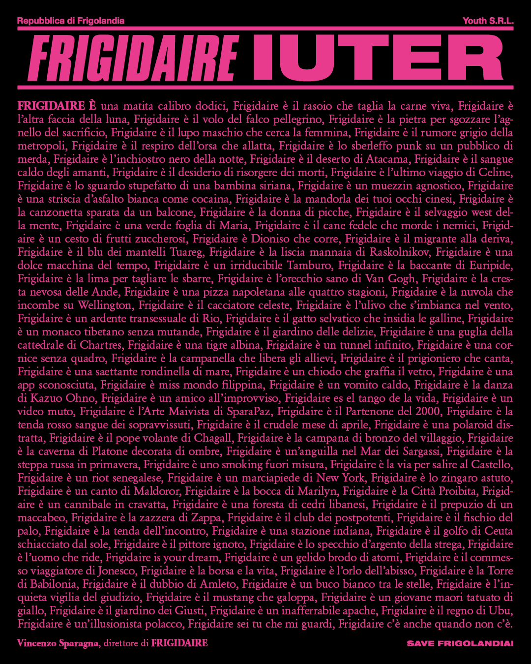 It was 1980 when Vincenzo Sparagna, former director of the satirical publication Il Male, decided to found a new magazine, which soon became revolutionary and totally avant-garde, a project carried out together with his collaborators, illustrators and graphic designers, Tanino Liberatore, Andrea Pazienza, Stefano Tamburini, and Filippo Scozzari. Thus was born the magazine Frigidaire. Over the decades, Frigidaire wrote the history of illustration with the dystopian comics RanXerox by Liberatore and Tamburini, also adapted for the United States and Japan, as well as giving space to journalistic inquiries, columns, comics, music and more. Sparagna also founded in 2006 a town of 3000 inhabitants, Giano dell'Umbria, in the province of Perugia, in an abandoned former ballila colony, and renamed the Republic of Frigolandia.