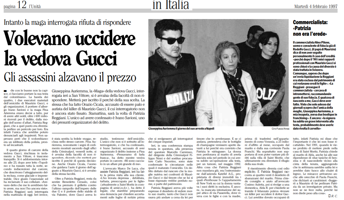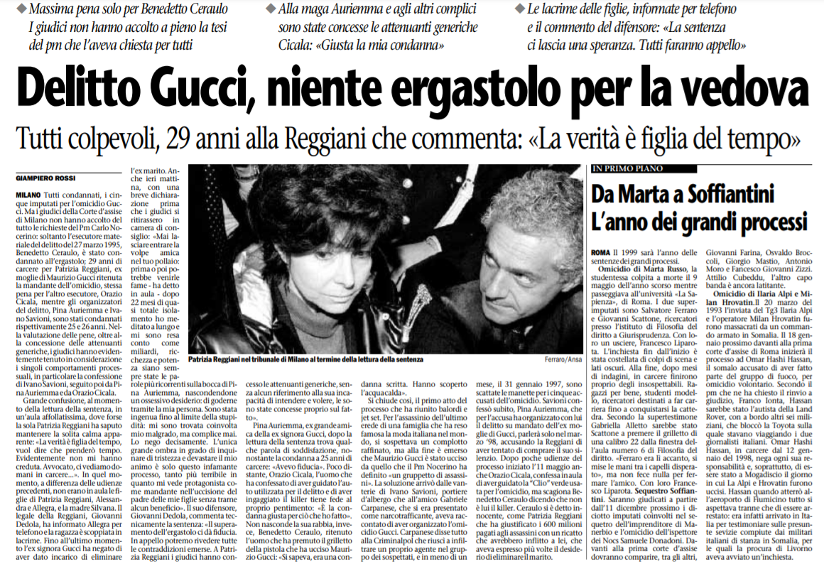 Patrizia and Pina Auriemma were separated by a few cells when the trial began on May 11, 1997. A process that will prove seemingly easy, given the enormity of overwhelming evidence that all the accomplices, Patrizia in the first place, have left behind – but that the widow Gucci will make it a kind of ordeal trying in every way to cloud the waters. First offering two billion to Pina Auriemma to take full responsibility, then trying to exonerate herself with the insanity defense because of the "psychic disorders" caused to her by the tumor operation of 1991, finally presenting her own version of the facts using a ruse that, in retrospect, suggests a fairly accurate plan: before the murder, at the time when she had paid the advance of 150 million by getting herself a kind of receipt, Patrizia had left a closed envelope in the hands of the notary with that document and a note written on it that, if anything ever happened to her, the investigators should investigate Pina Auriemma who was the real perpetrator of the murder. According to Reggiani's version, rejected by the judges, Auriemma had Maurizio killed independently and then blackmailed Patrizia by implicating her in the crime of things done.