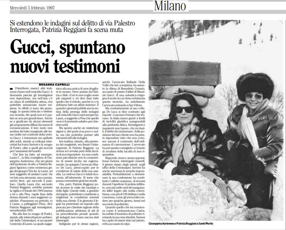 In the hours following the murder of Maurizio Gucci, Patrizia Reggiani began to be besieged by journalists. She receives them in the salon of her penthouse in San Babila, disheveld, and humbly dressed. She refuses to make statements, saying that everything she knows will be published in the memoir she is writing (and will never be published) although she then, on the phone, tells a member of the press who asked her how she felt: «From a human standpoint, I'm sorry. From a personal standpoint, I couldn't say the same». Three-quarters of an hour after Maurizio's death, Patrizia is in Corso Venezia 38 together with her daughters, the house in which Maurizio lived with his new partner, Paola Franchi. She arrives with the excuse that little Alessandra wants to take a sweater from her father as a last memory – all an excuse to check that furniture and valuables are still there.