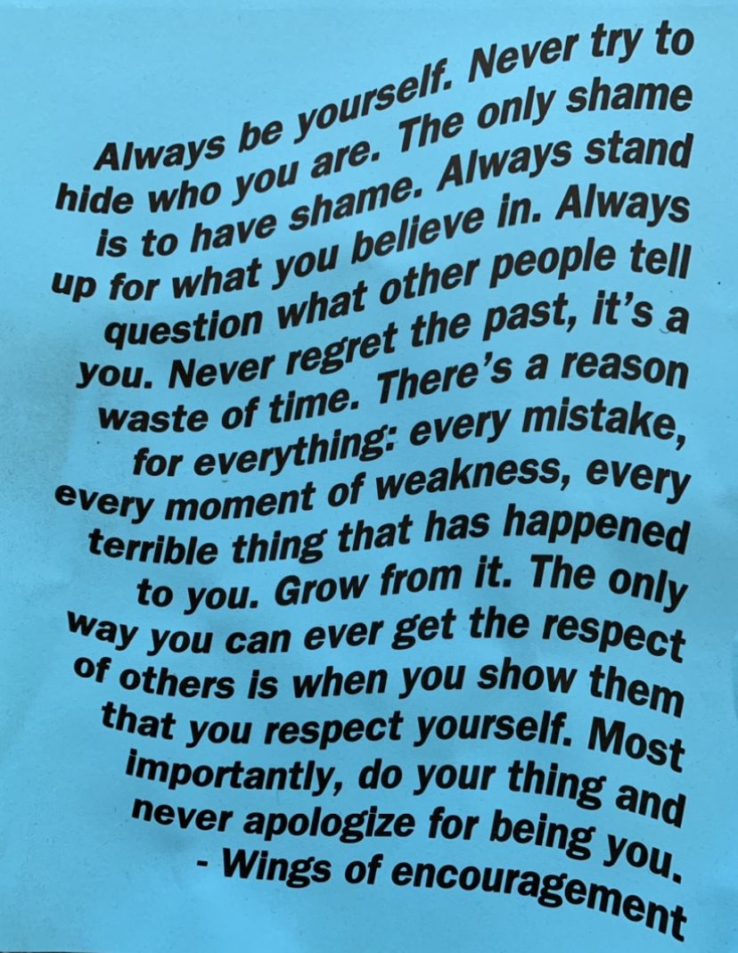 "Always be yourself. Never try to hide who you are. The only shame is to have shame. Always stand up for what you believe in. Always question what other people tell you. Never regret the past, it's a waste of time. There's a reason for everything: every mistake, every moment of weakness, every terrible thing that has happened to you. Grow from it. The only way you can ever get the respect of others is when you show them that you respect yourself. Most importantly, do your thing and never apologize for being you. - Wings of encouragement."