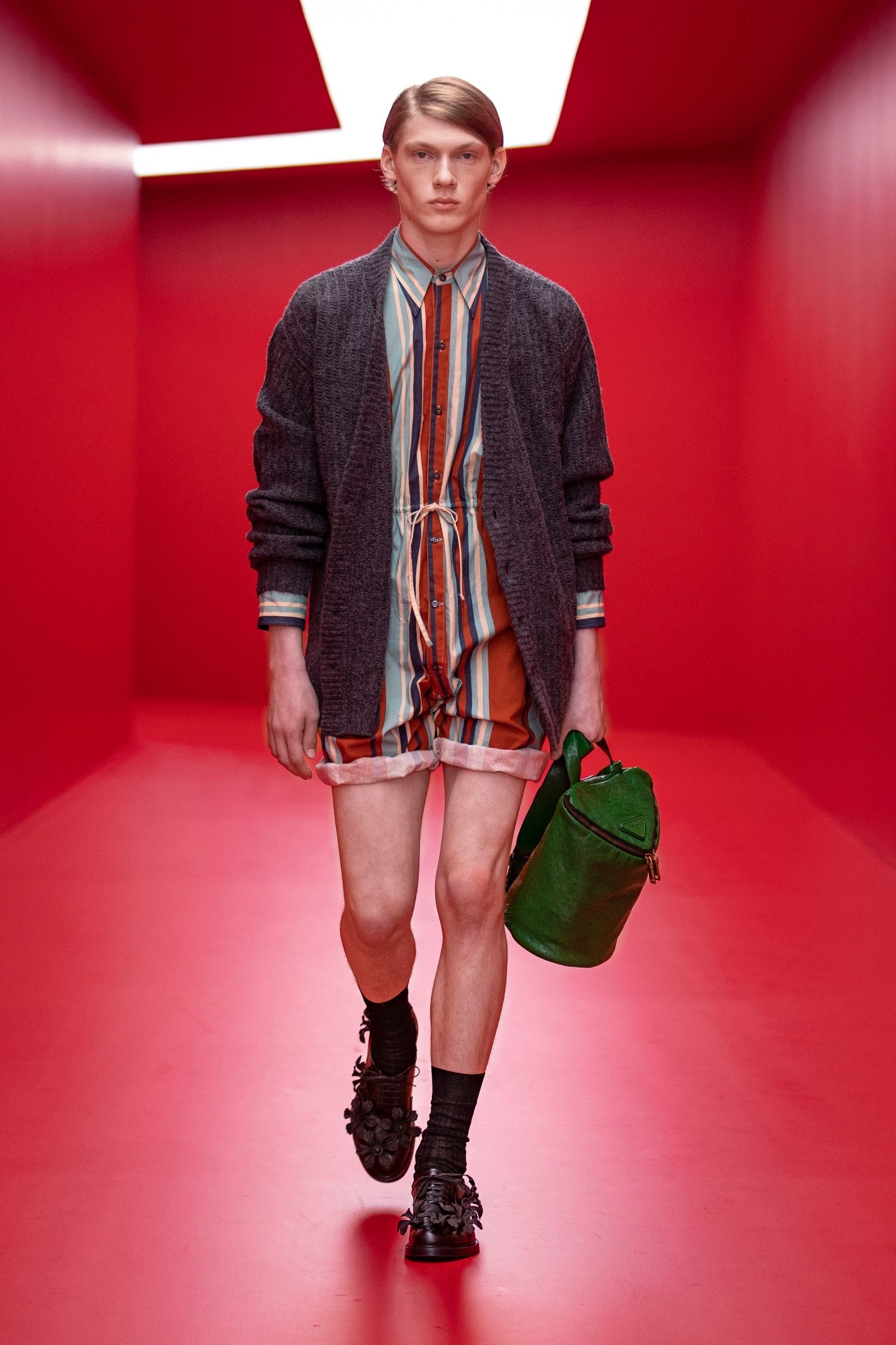 The collection was dominated by elementary shapes, right-angle necklines and very short trousers reminiscent of an haute and gender-bending version of the summer colonies' clothes from decades ago. Men's bucket hats and rompers were a direct quote to that vintage, a childish and candid world that was used by Miuccia and Raf to explore the fragile and vulnerable side of men's fashion, a side that questions the very rules of the genre using skirts over short shorts and wide necklines that expose the human body – emphasizing a kind of allusive vulnerability.