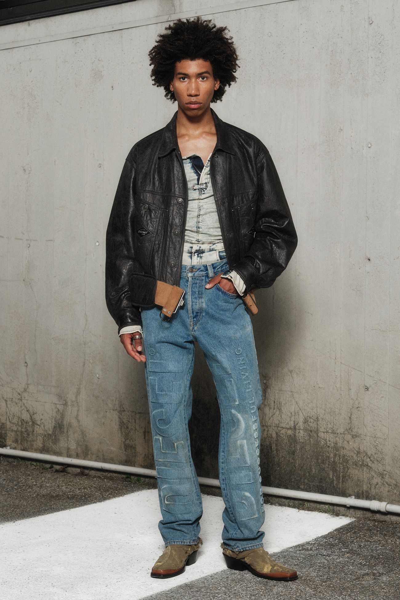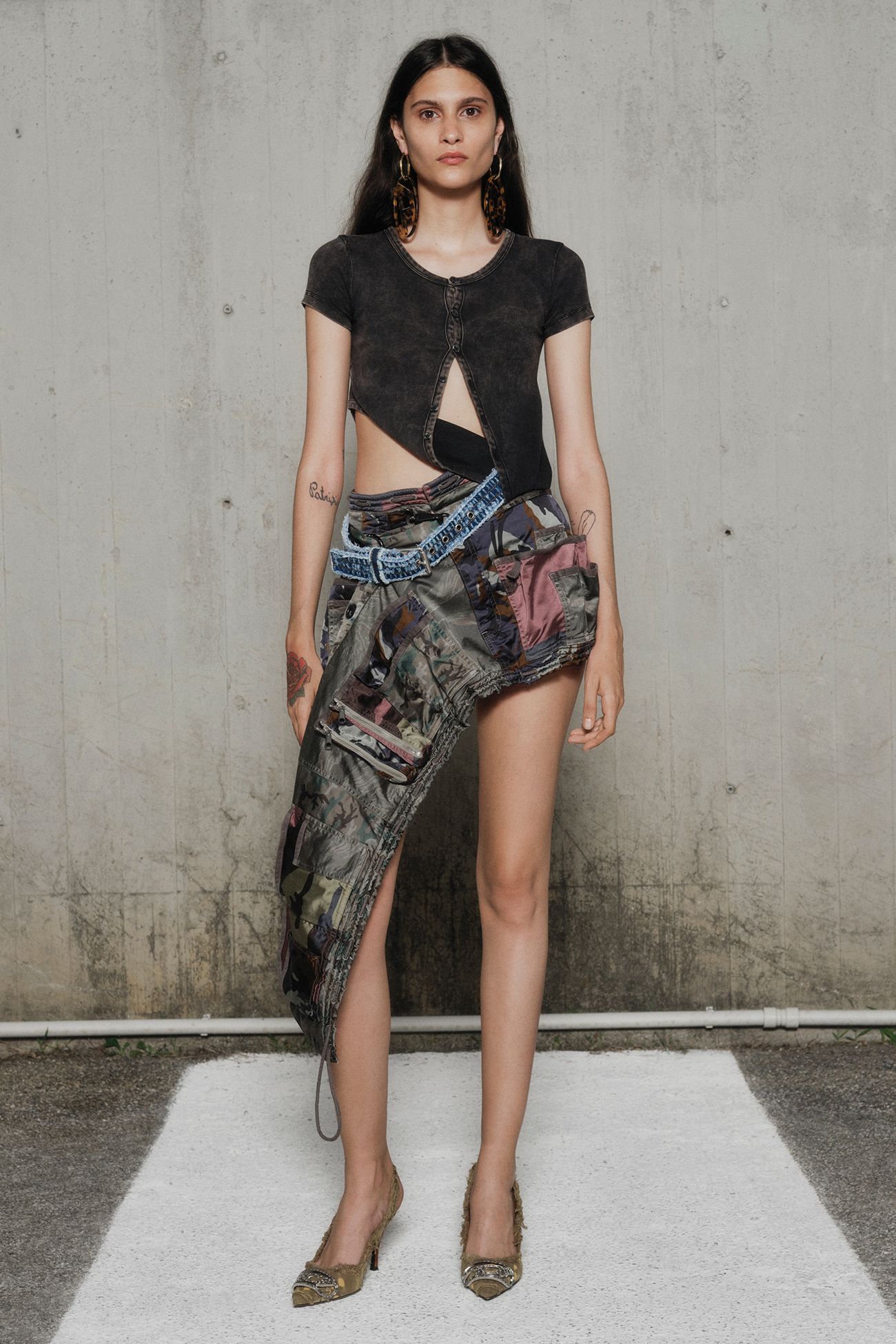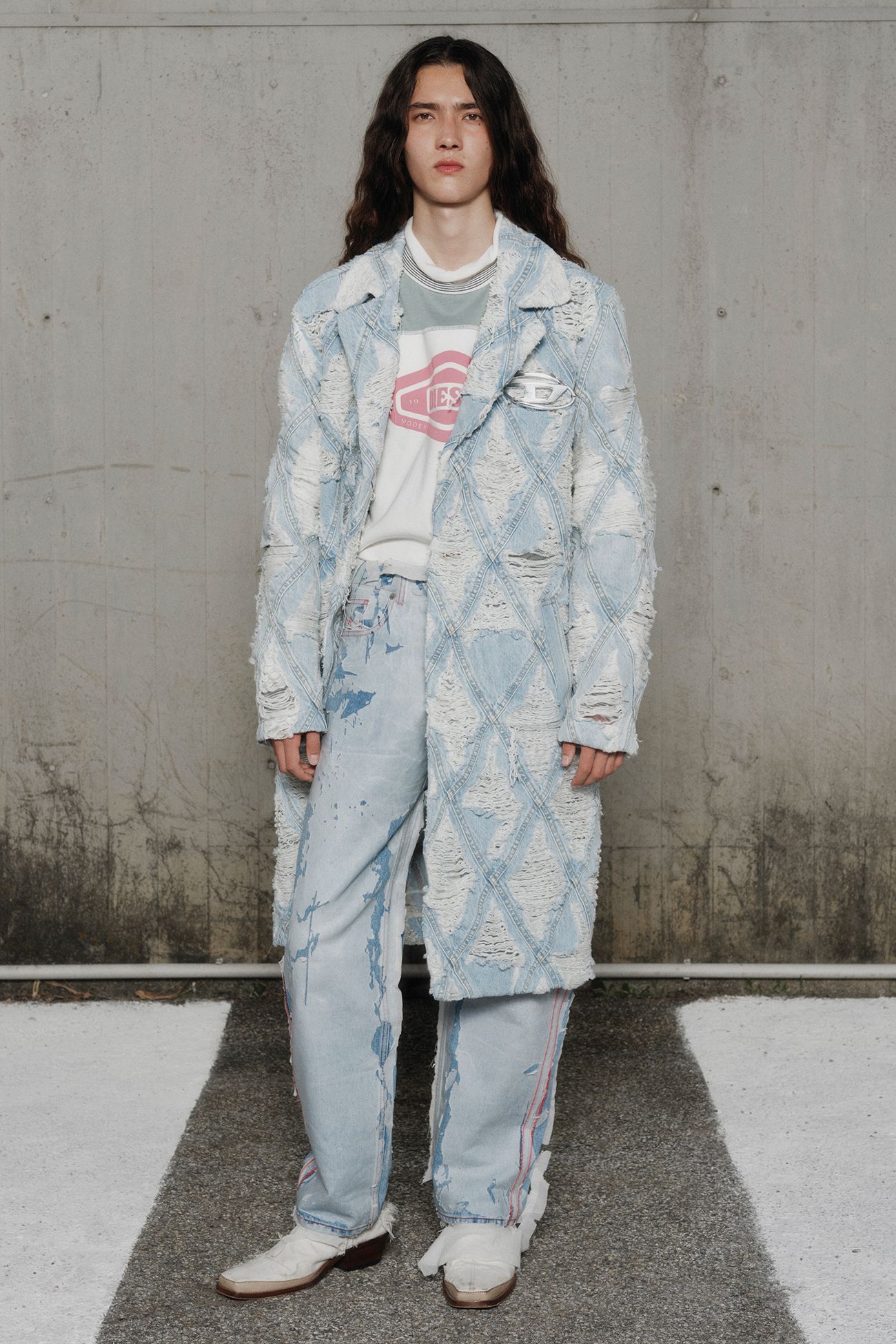 The leitmotiv of the collection is the intertwined straps that connect T-shirts, tops and dresses, forming a sort of backbone, a supporting structure that allows the construction of shapes or drapes. Among the most interesting items of the proposal stand out the five-pocket denim with integrated boots, in cowboy version or pointed ankle boots. The heritage chapter, often upcycled, contains regenerated stock Diesel denim. Martens wanted to retrace and tell the story of Diesel's rich heritage through blazers, shirts and trousers decorated with a trompe l'oeil effect print, or in jersey garments enriched with archive Diesel patches.