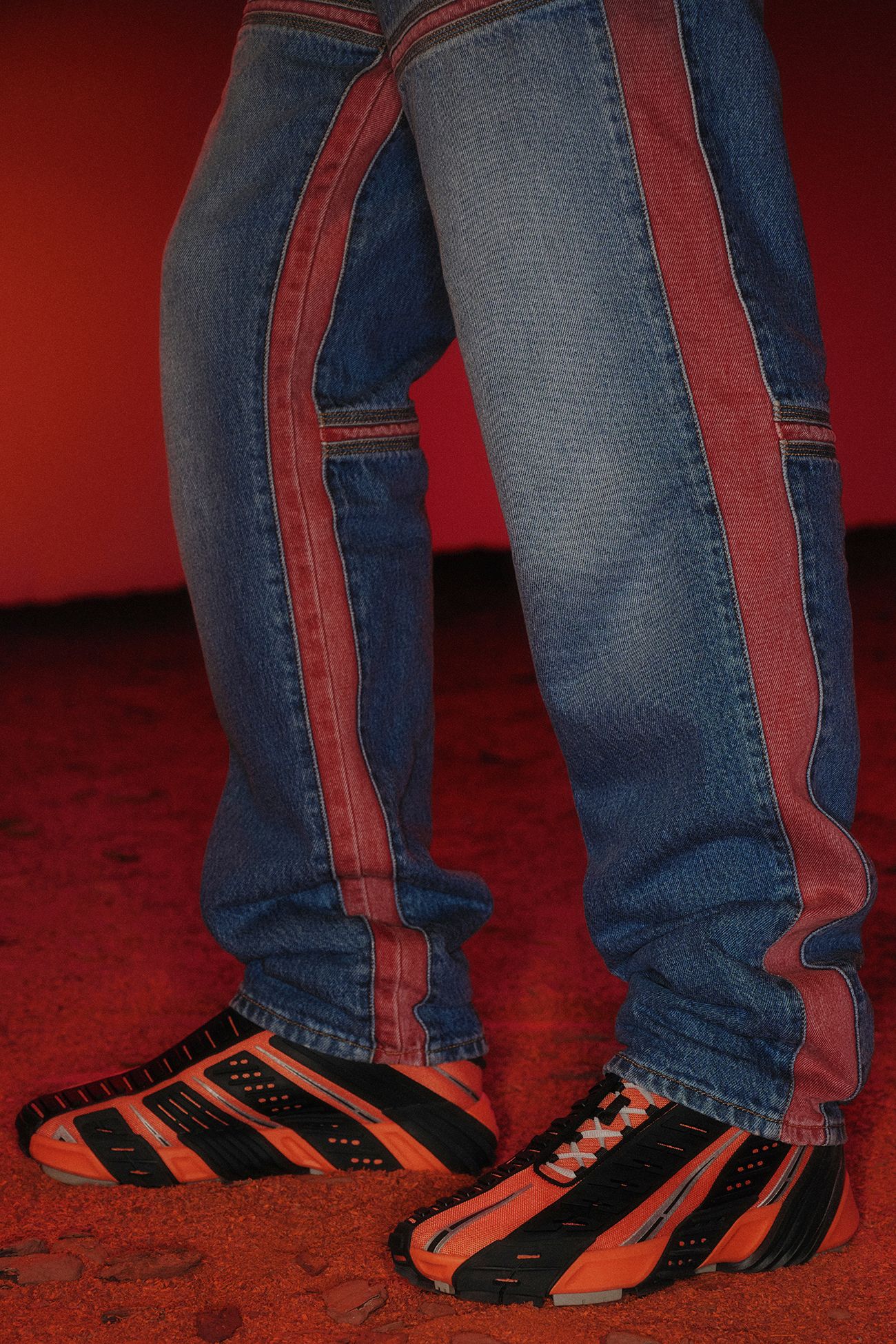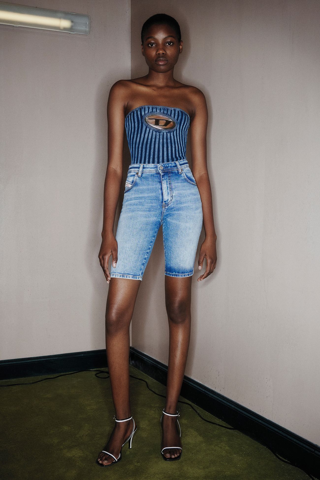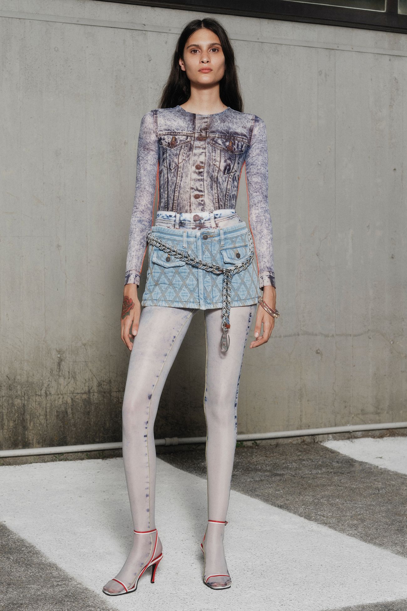 The leitmotiv of the collection is the intertwined straps that connect T-shirts, tops and dresses, forming a sort of backbone, a supporting structure that allows the construction of shapes or drapes. Among the most interesting items of the proposal stand out the five-pocket denim with integrated boots, in cowboy version or pointed ankle boots. The heritage chapter, often upcycled, contains regenerated stock Diesel denim. Martens wanted to retrace and tell the story of Diesel's rich heritage through blazers, shirts and trousers decorated with a trompe l'oeil effect print, or in jersey garments enriched with archive Diesel patches.