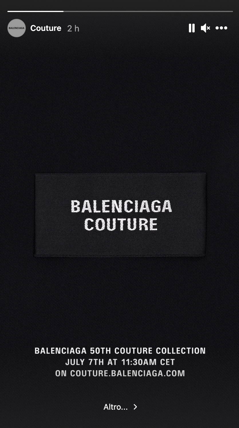 The Maison led by Demna Gvasalia, also part of the Kering Group doesn't seem to have such an ambitious and sophisticated strategy in mind. The total cleanliness of the profile seems in fact a simple prologue to what will be the most important event for the brand this year, the haute couture show, the first in 53 years. In fact, the only Story featured in the profile refers in fact to the high fashion show, which will take place on July 7.