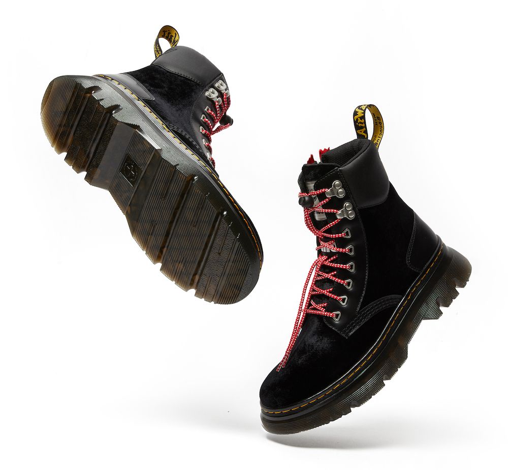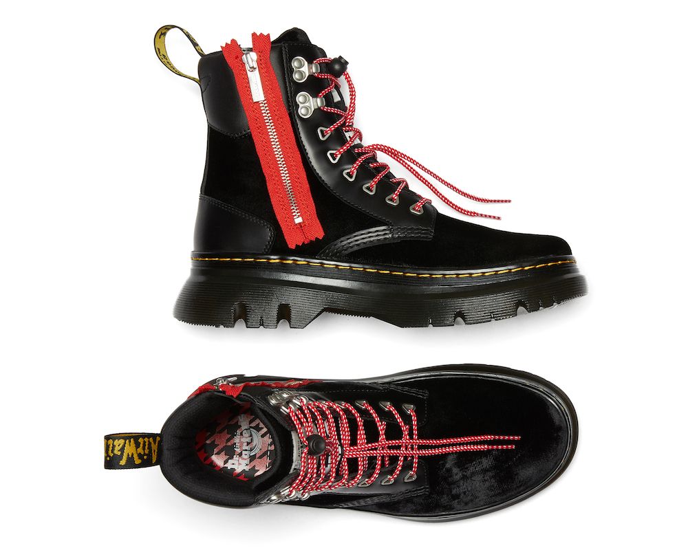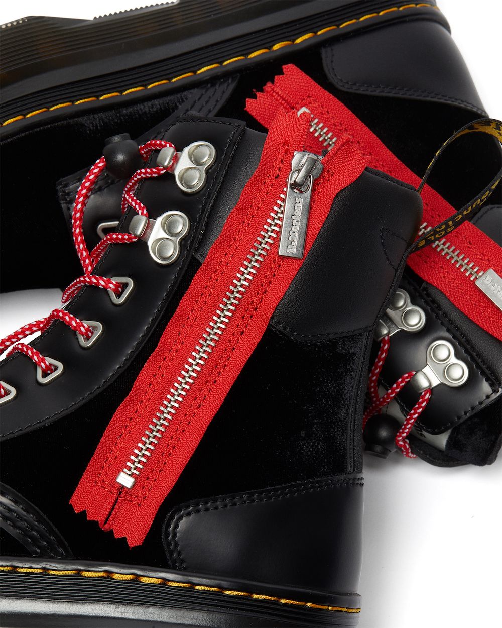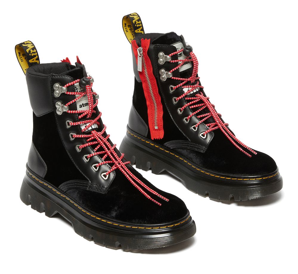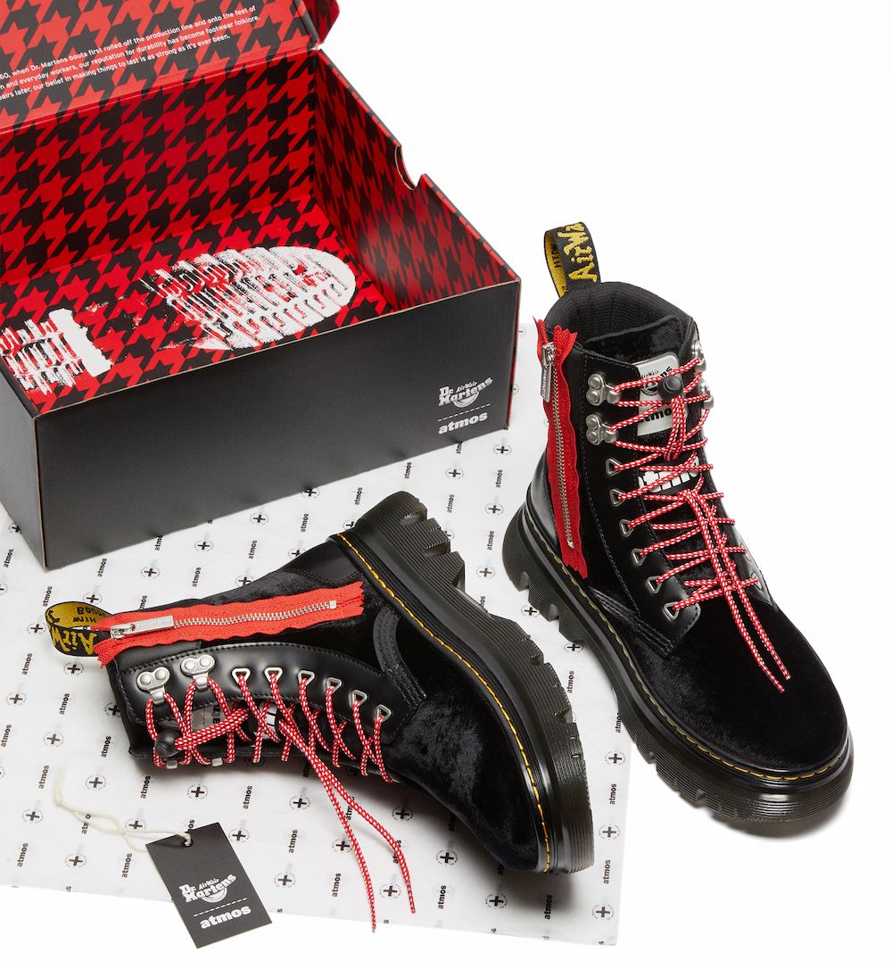 The leather boot is covered with velvet and ends with a pu padded collar, creating an eclectic union between classic Japanese streetwear and Dr. Martens' utilitarian design. On the tongue stands a dual-branded logo covered by a hook for the laces that bears the Atmos branding. The brushed silver eyelets and ski hooks are intertwined with a red and white lace, to complete the shoe the double-branded footbed in black and red hooth and the iconic yellow seam on a smoky Tarian sole.