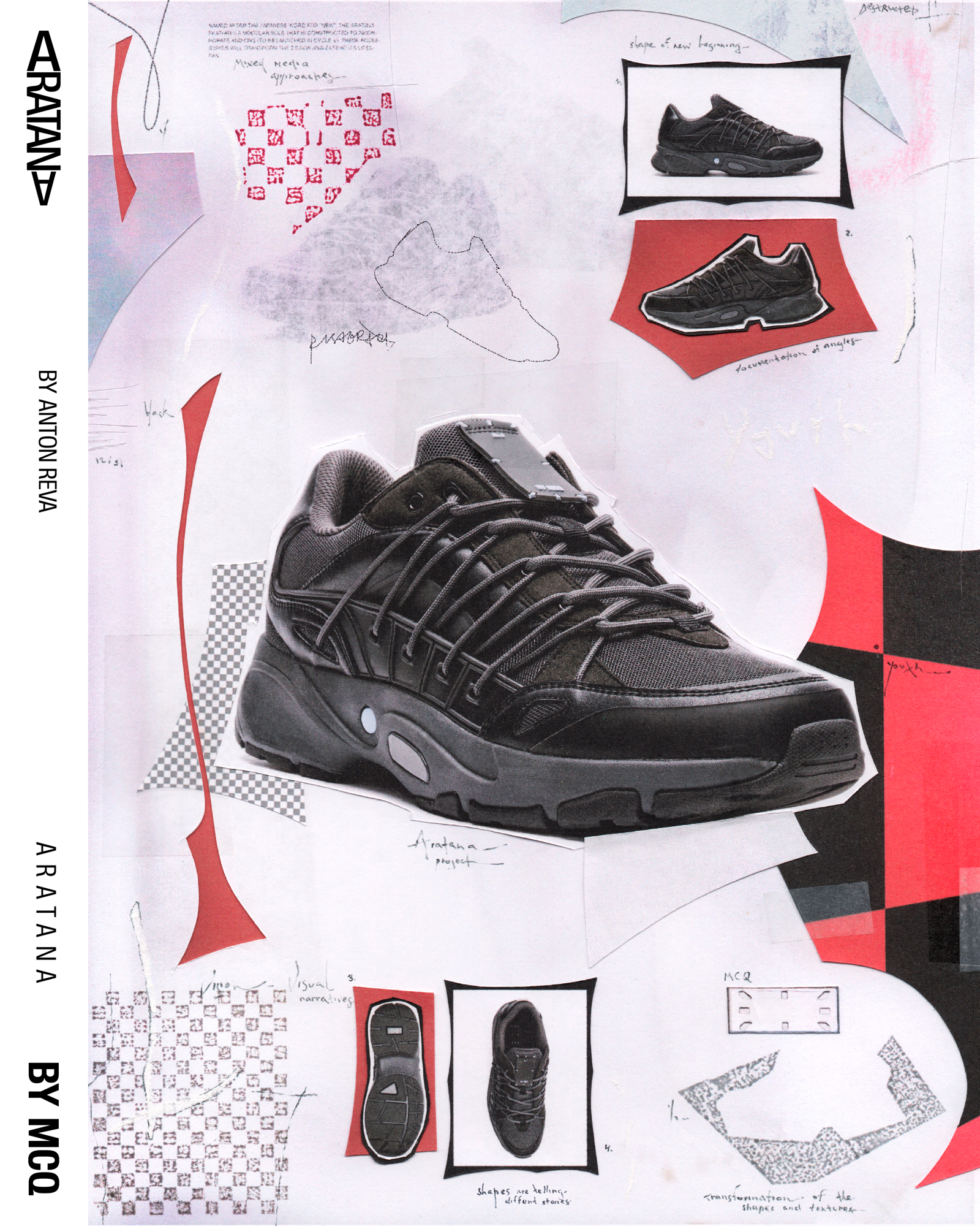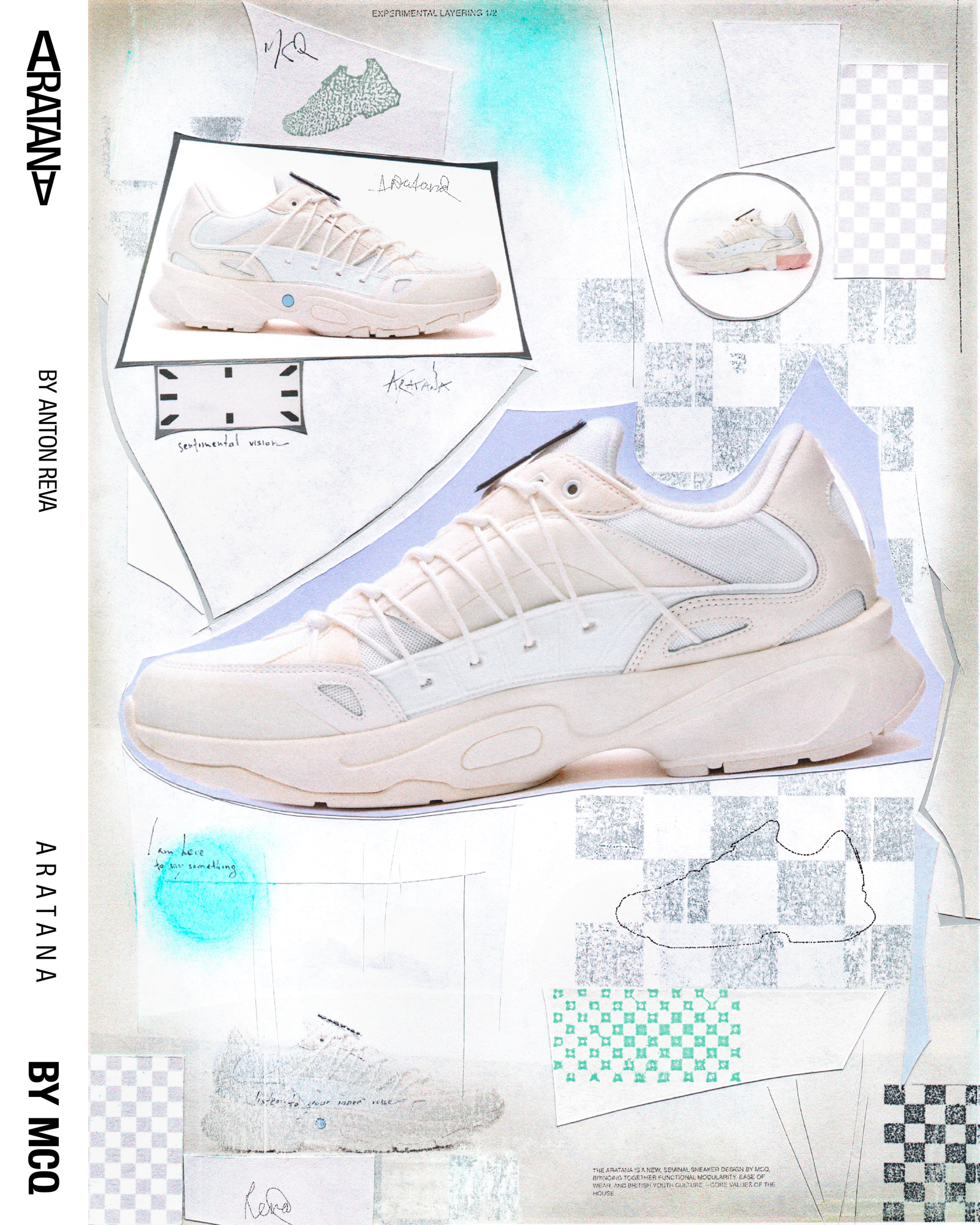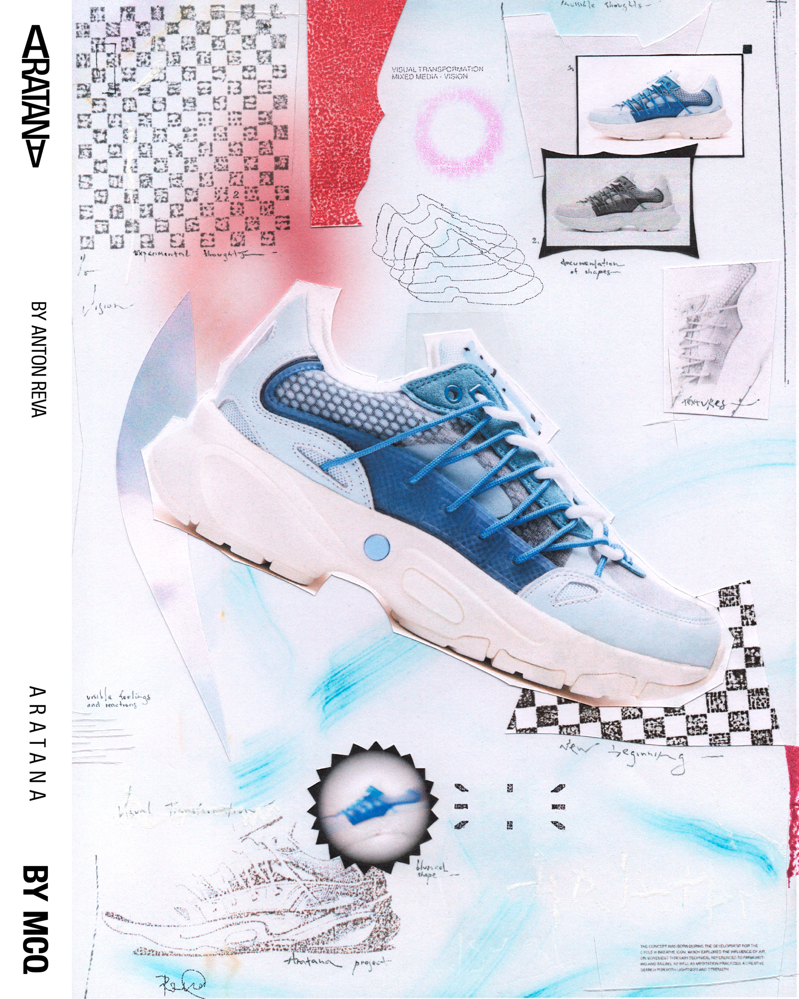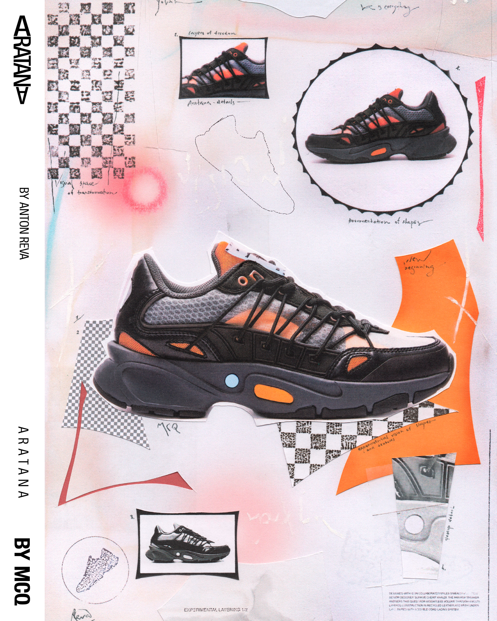 Designed by Myles O'Meally and Slimane Cherif Khaldi, the Aratana extrapolate the idea of the impact of air and aerodynamics on the movement and shape of a sneaker. A study passed through the analysis of the relationship of air with various elements, such as the parachute and the sail, and ended with the creation of a multilayer structure in microfibre suede and mesh capable of giving the shoe a shape that combines the trend of sneakers more chunky with the comfort and quality of MCQ.