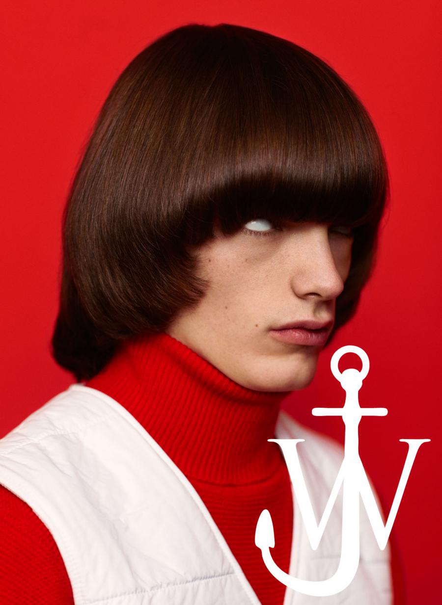 Inquietanti occhi rovesciati all’indietro ed educati caschetti anni 60. L’uomo vestito dall’intrigantissimo designer inglese è di quelli da far girare la testa (o storcere il naso, a seconda). Il personalissimo tributo di JW al periodo oscillante per antonomasia si traduce in una collezione che ritrova nell’oversize applicato a 360° il suo tratto più distintivo. Forme imponenti, maxi quadrettoni, galli giganti, ma anche decorazioni in corda di sapore quasi marinaresco, copricapi degni di un ipotetico palombaro che abbia perso la retta via e si sia improvvisamente ritrovato nell’atelier di uno stilista in cerca d’ispirazione.