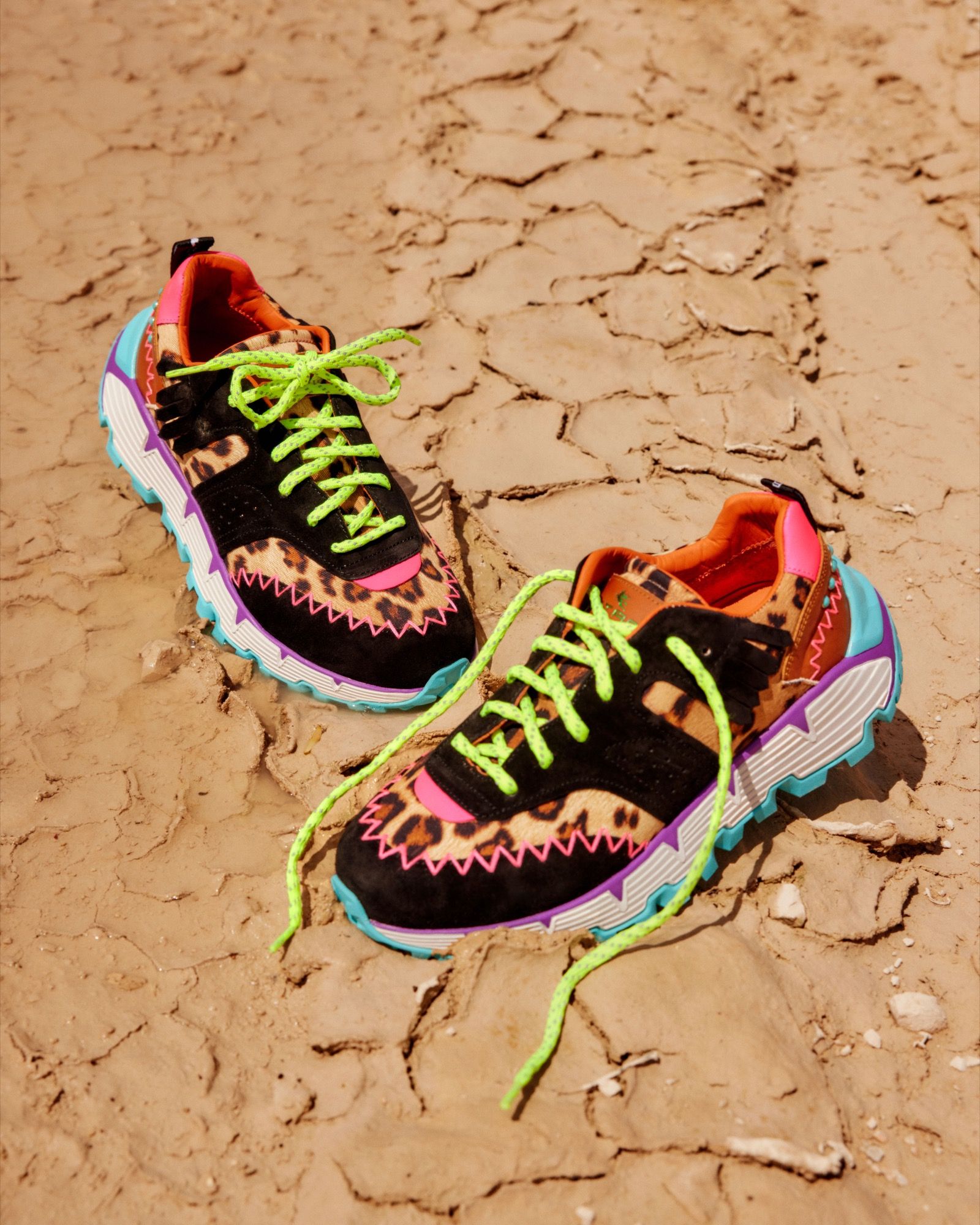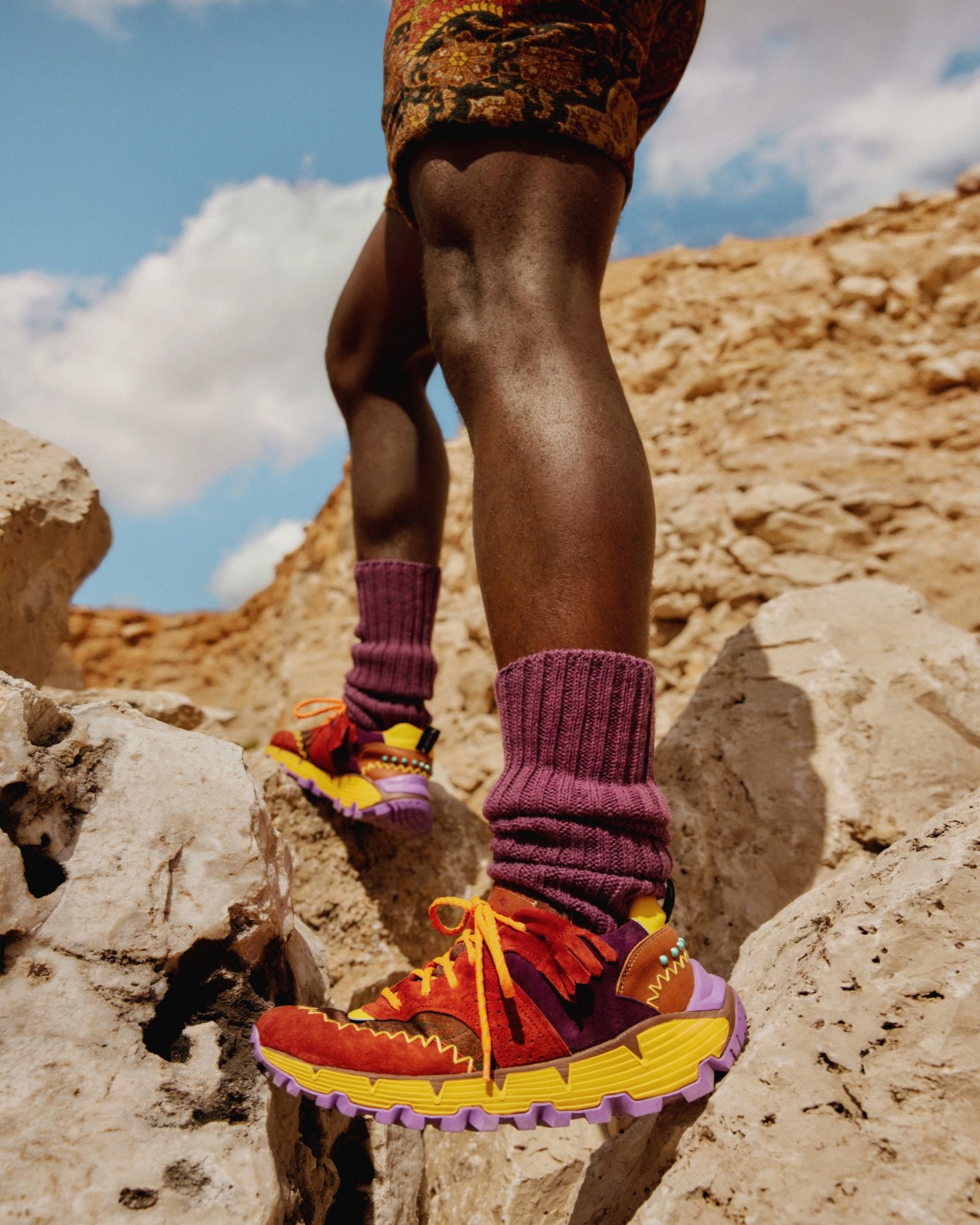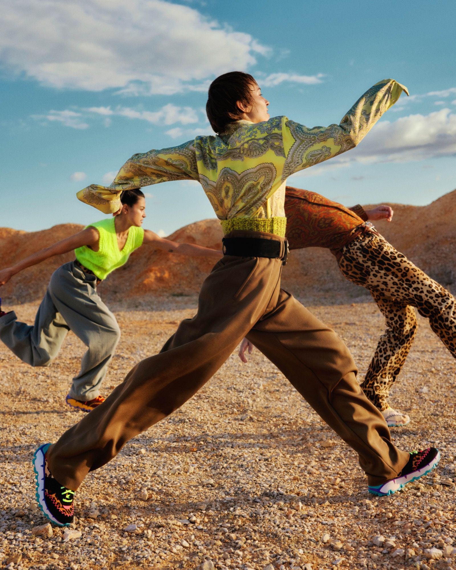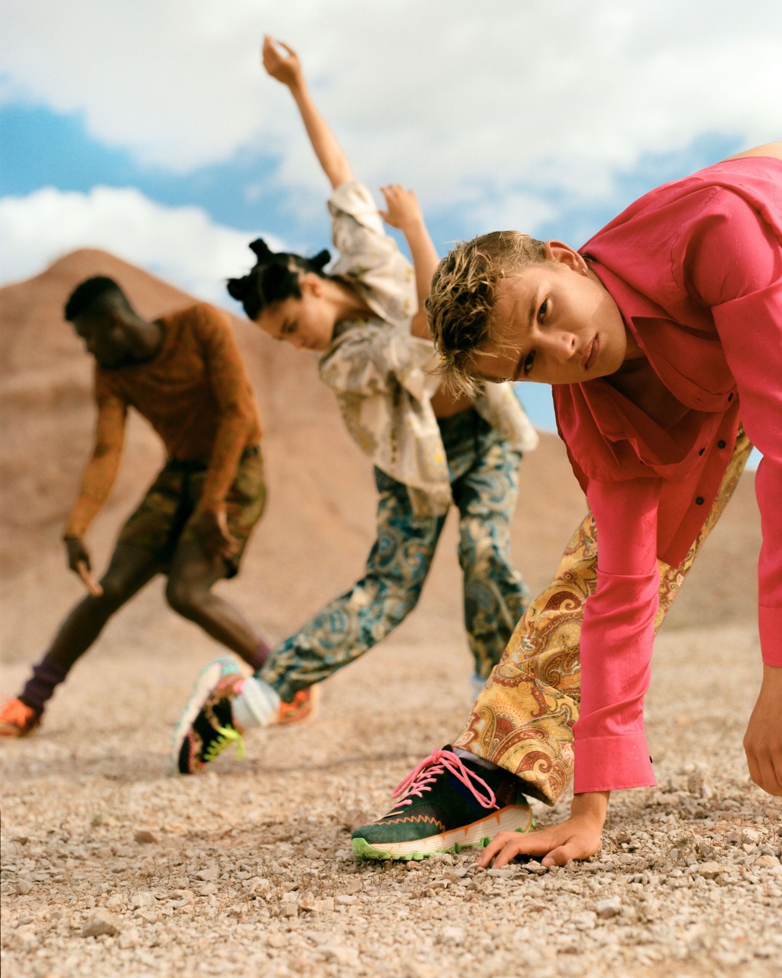 Characterized by a mix of suede, Paisley and jaquard, the sneaker is embellished with some characteristic details, such as fringes, neon laces and studs, in addition to the ETRO logo embroidery on the tongue. The rubber midsole, created with Vibram, gives the shoe a chunky look that enhances its anatomical and dynamic lines. Furthermore, the EARTHBEATs are the protagonists of a campaign created by Francesco Sourigues and David Vivirido, directed by Mario Abadia and the shots by Jorge Perez Ortiz, in which the dancers of the Spanish company KOR'SIA are portrayed in a pristine landscape that represents the connection with the planet evoked by the name of the sneaker.