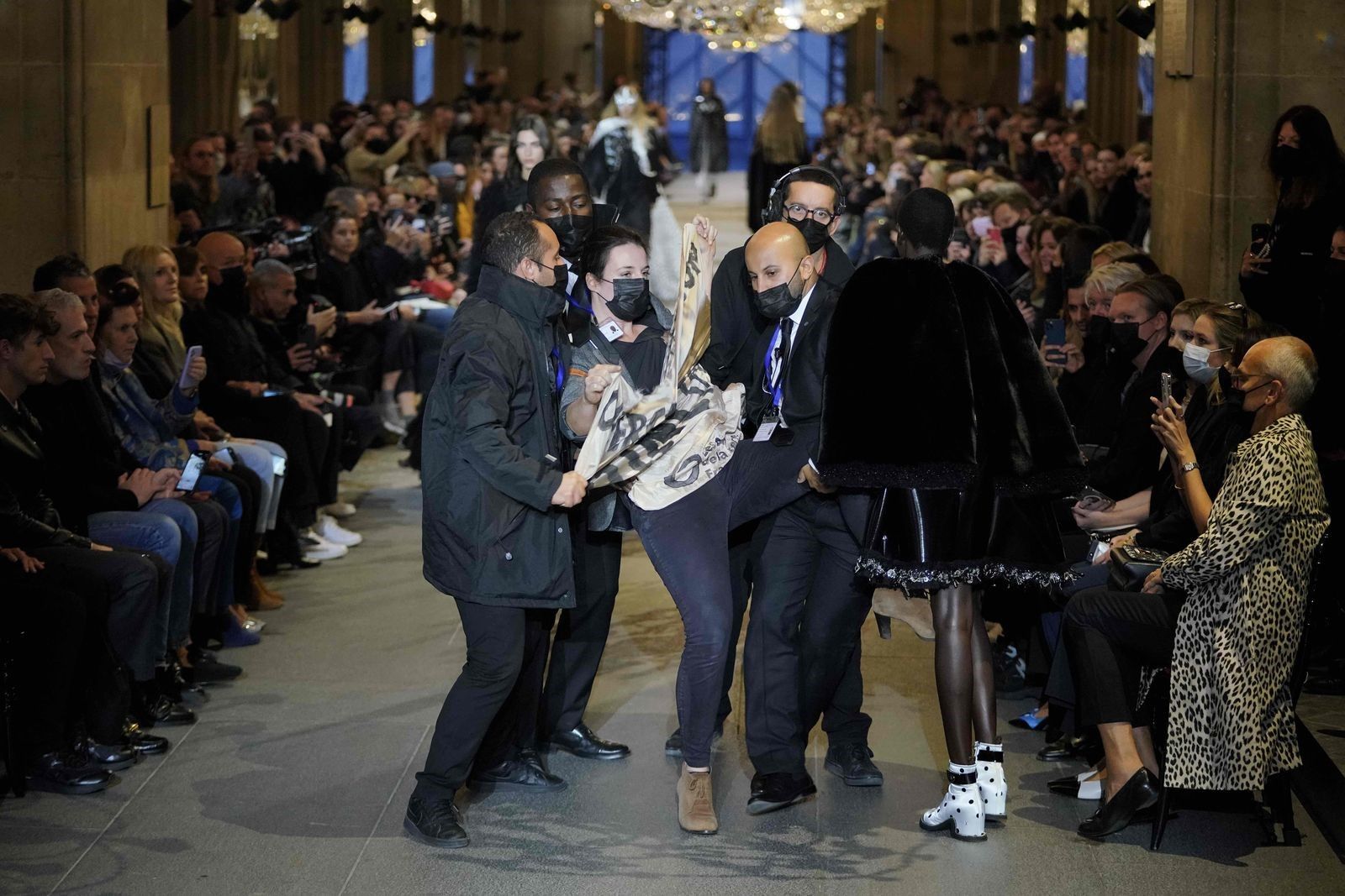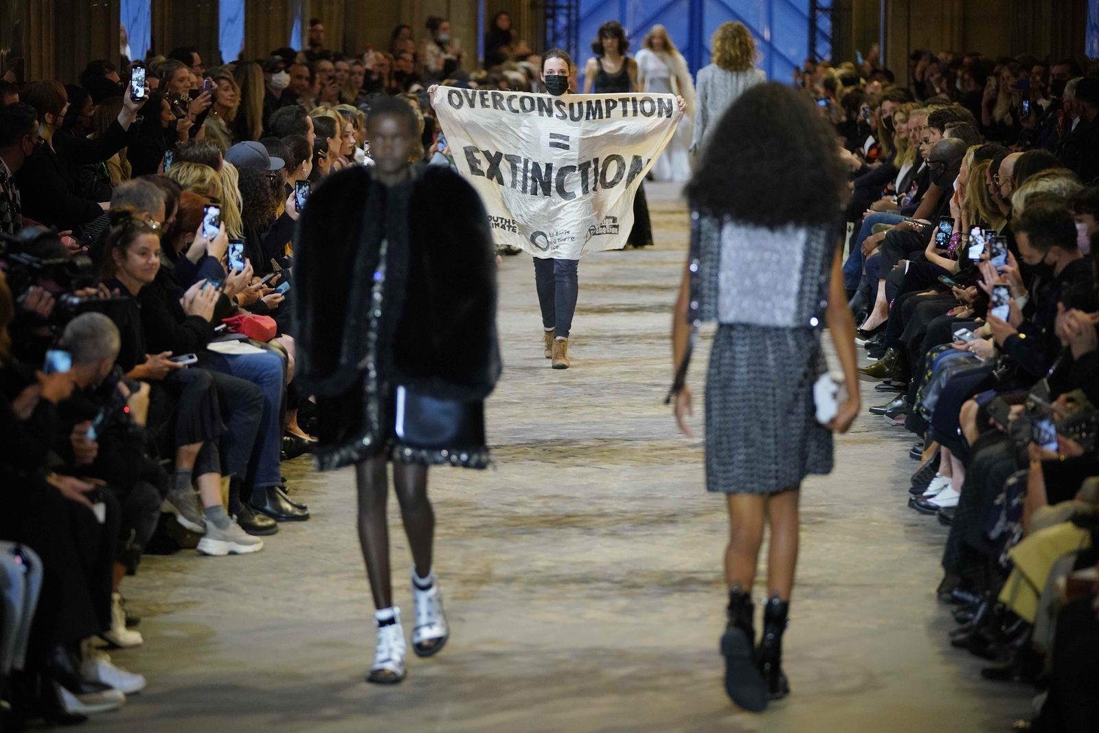 The protest against climate change at the Louis Vuitton show “Overconsumption = Extinction”
