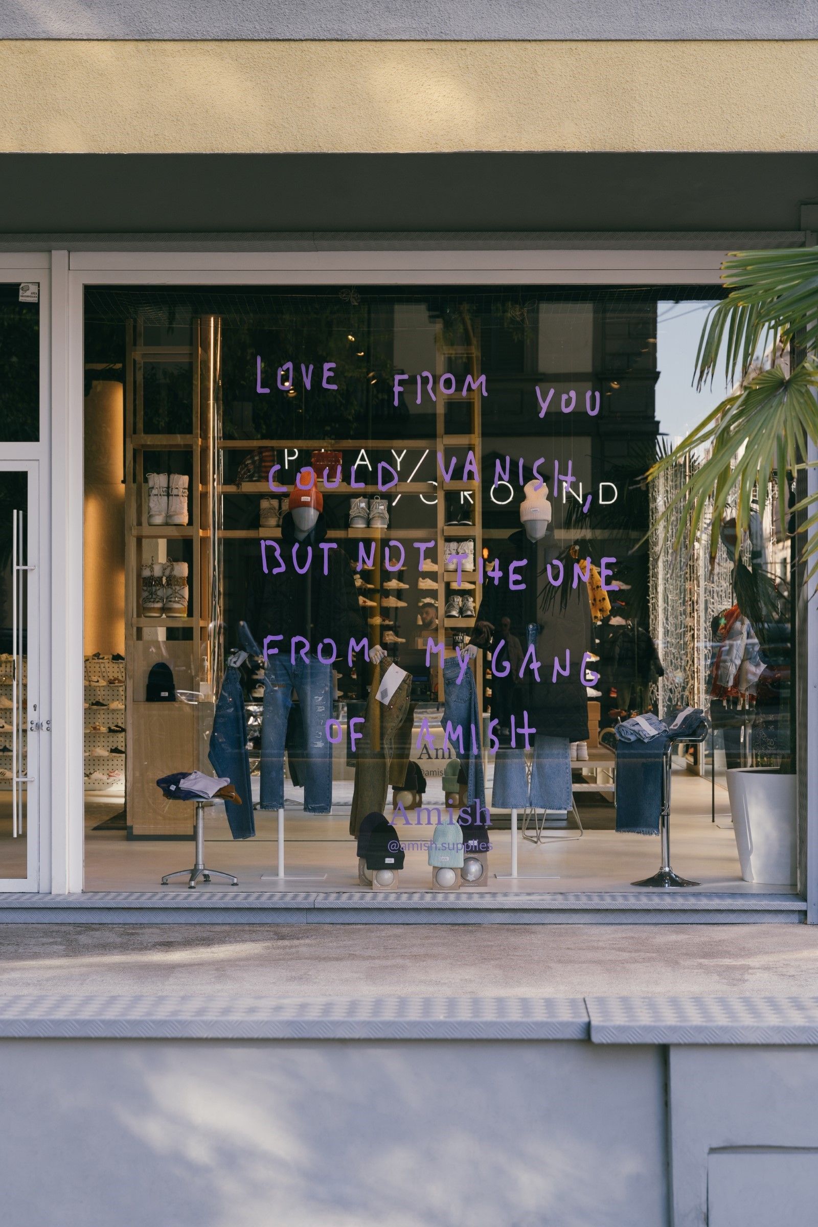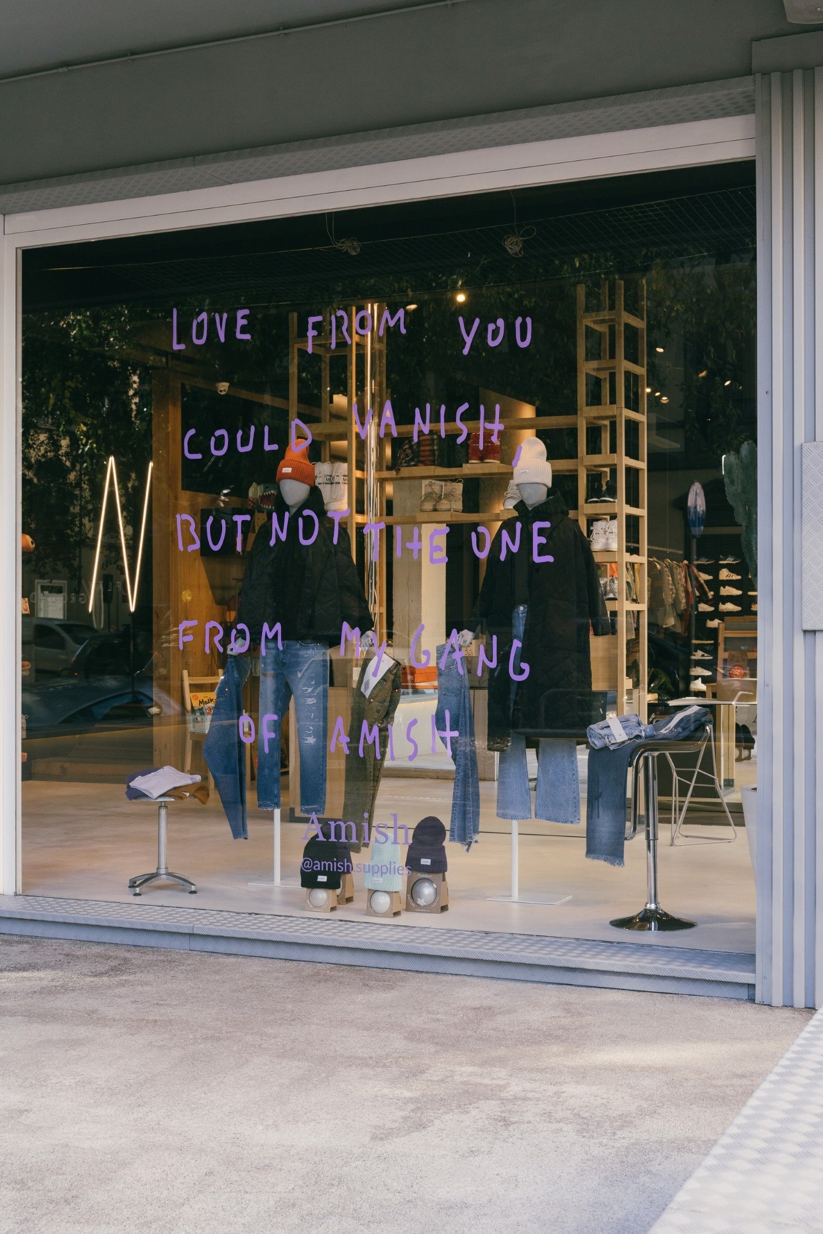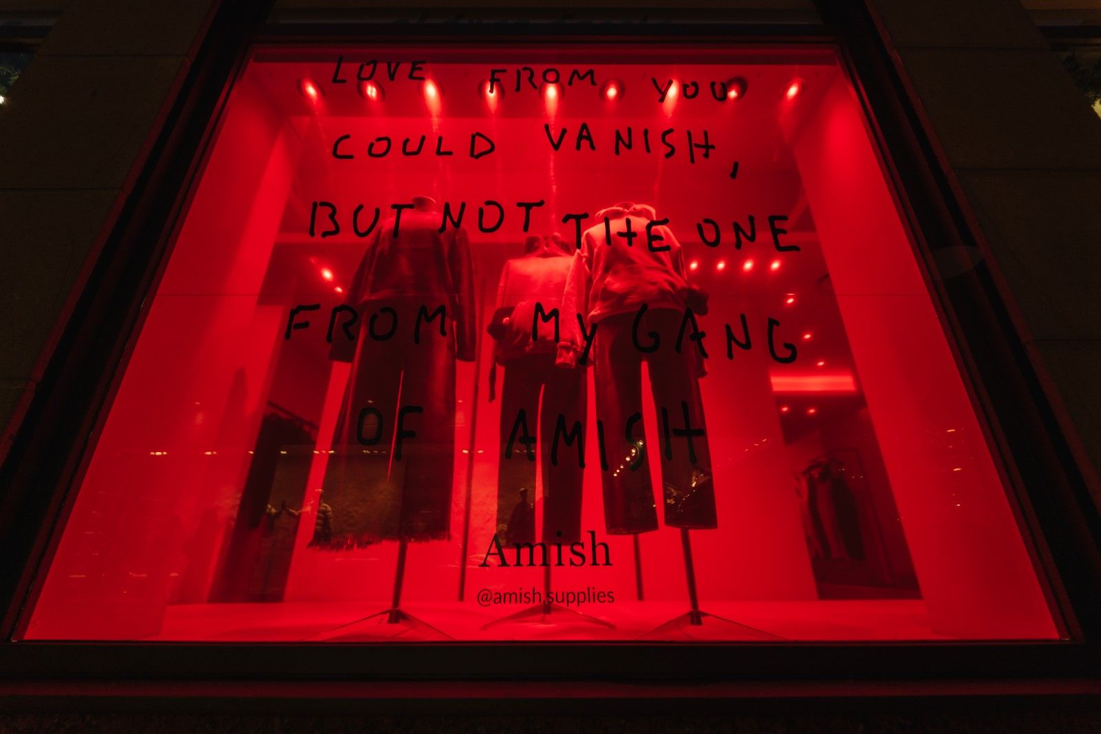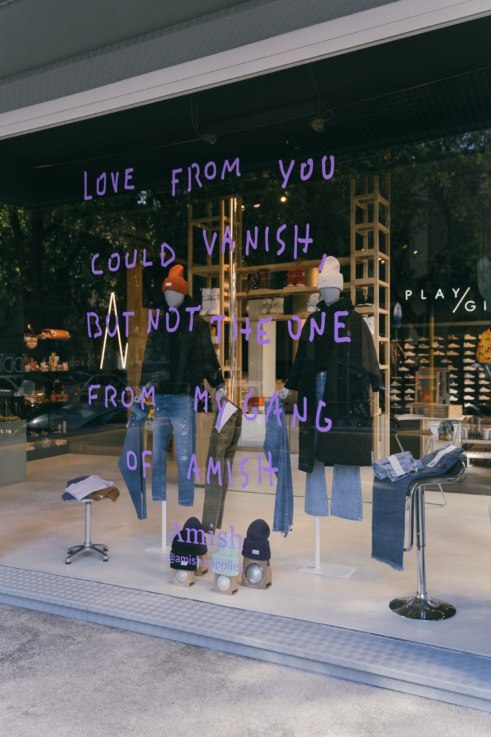 «Love from you could vanish, but not the one from my gang of Amish». This is what the windows of Al Duca D'Aosta in Mestre and Treviso say; of Lungolivigno in Livigno, Tessabit in Como and Playground in Florence – all historic Italian multi-brand boutiques that this year have dedicated one of their windows to Amish, an Italian brand part of the Florentine group Sevenbell, whose light-hearted Hippie Rock garments have recently appeared in the street styles of Paris Fashion Week. An aesthetic that is reflected in the visual installations created for the brand by Pietro Terzini, a multidisciplinary visual artist based in Milan who tells the world of fashion and love according to the Millennial generation through the ironic use of lettering, street art and digital manipulation.