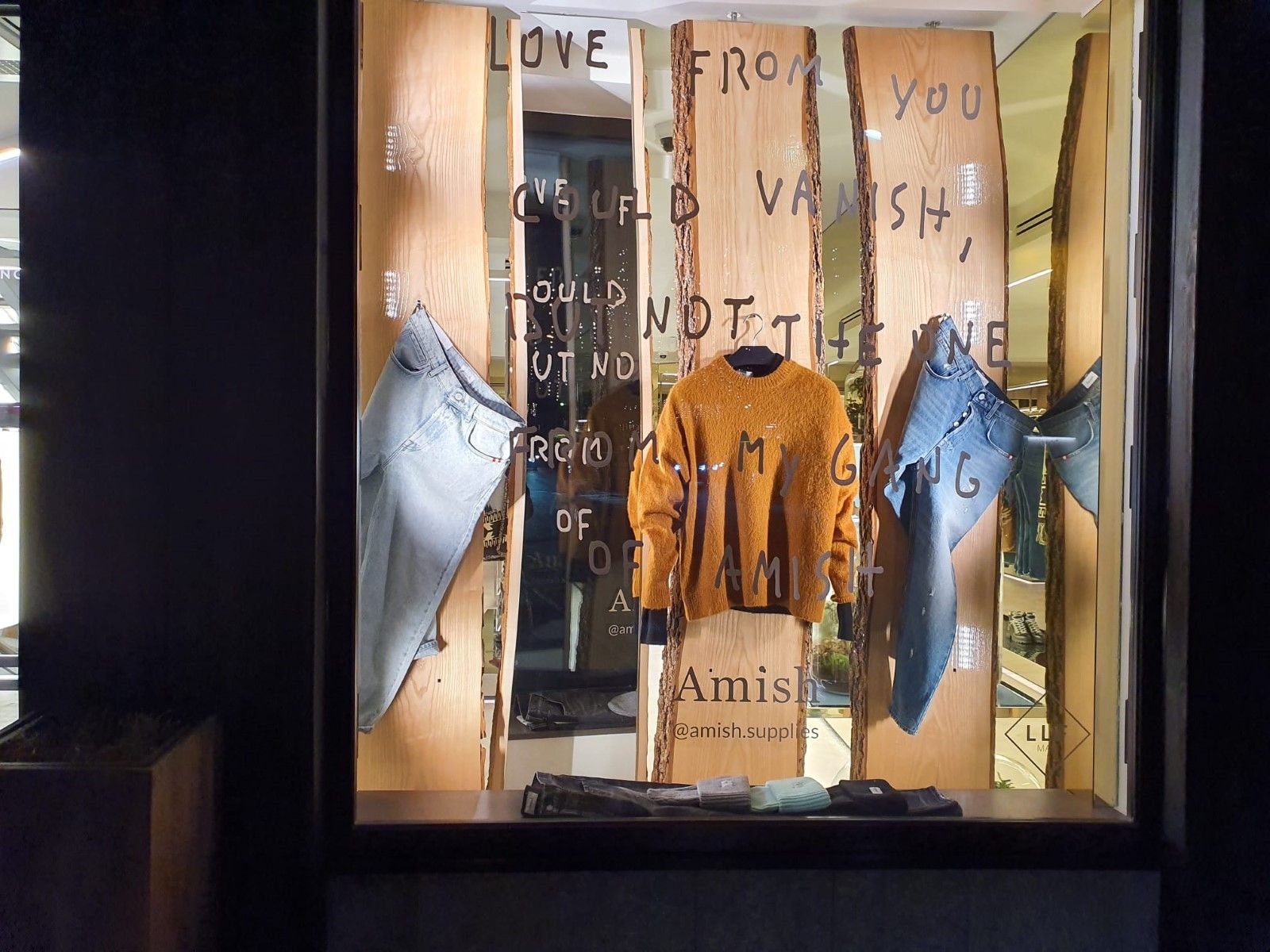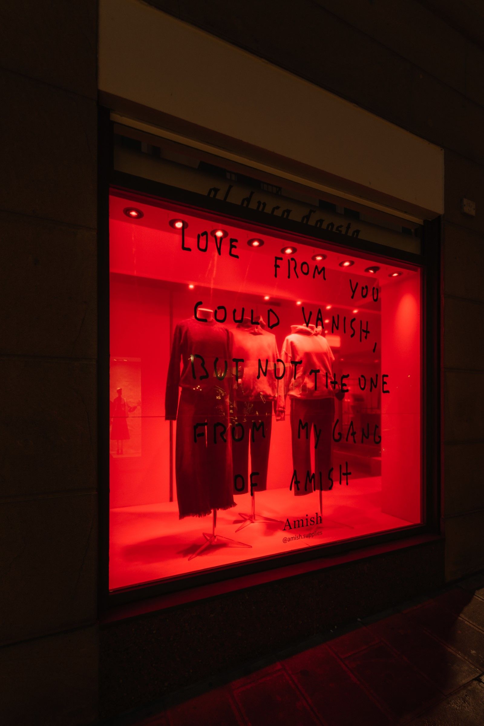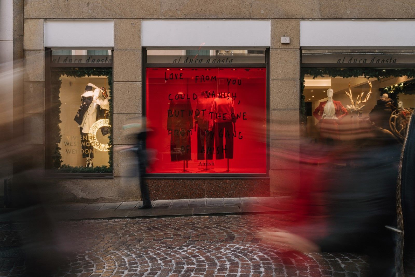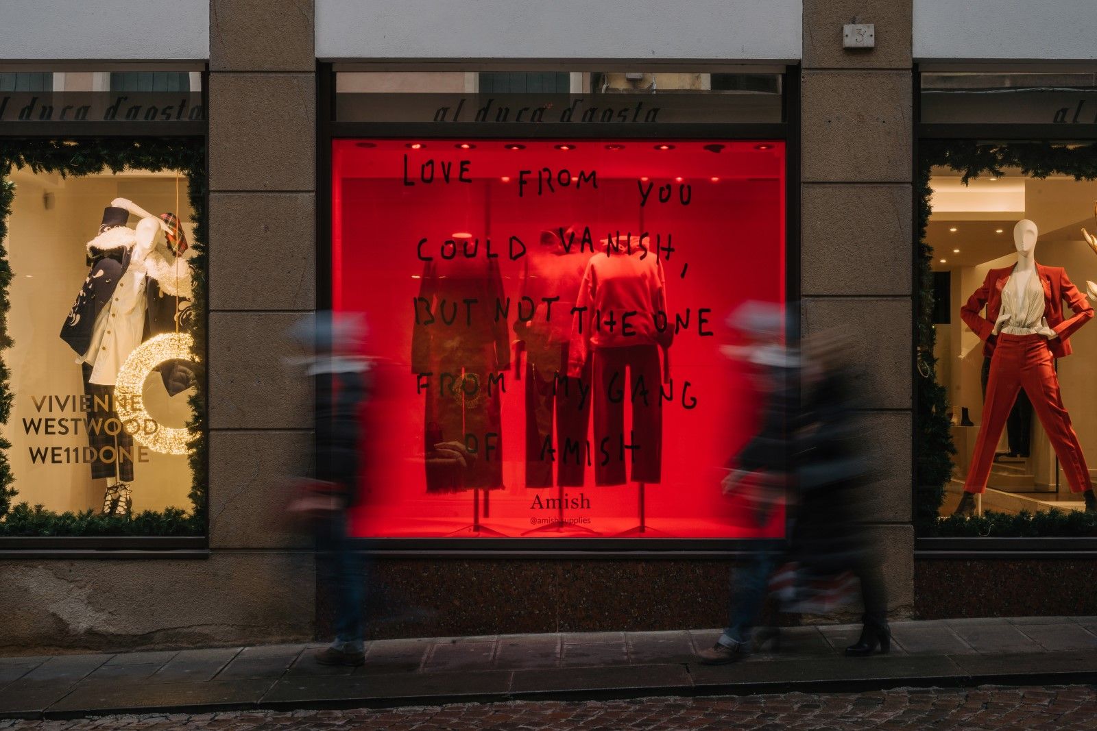 «Love from you could vanish, but not the one from my gang of Amish». This is what the windows of Al Duca D'Aosta in Mestre and Treviso say; of Lungolivigno in Livigno, Tessabit in Como and Playground in Florence – all historic Italian multi-brand boutiques that this year have dedicated one of their windows to Amish, an Italian brand part of the Florentine group Sevenbell, whose light-hearted Hippie Rock garments have recently appeared in the street styles of Paris Fashion Week. An aesthetic that is reflected in the visual installations created for the brand by Pietro Terzini, a multidisciplinary visual artist based in Milan who tells the world of fashion and love according to the Millennial generation through the ironic use of lettering, street art and digital manipulation.