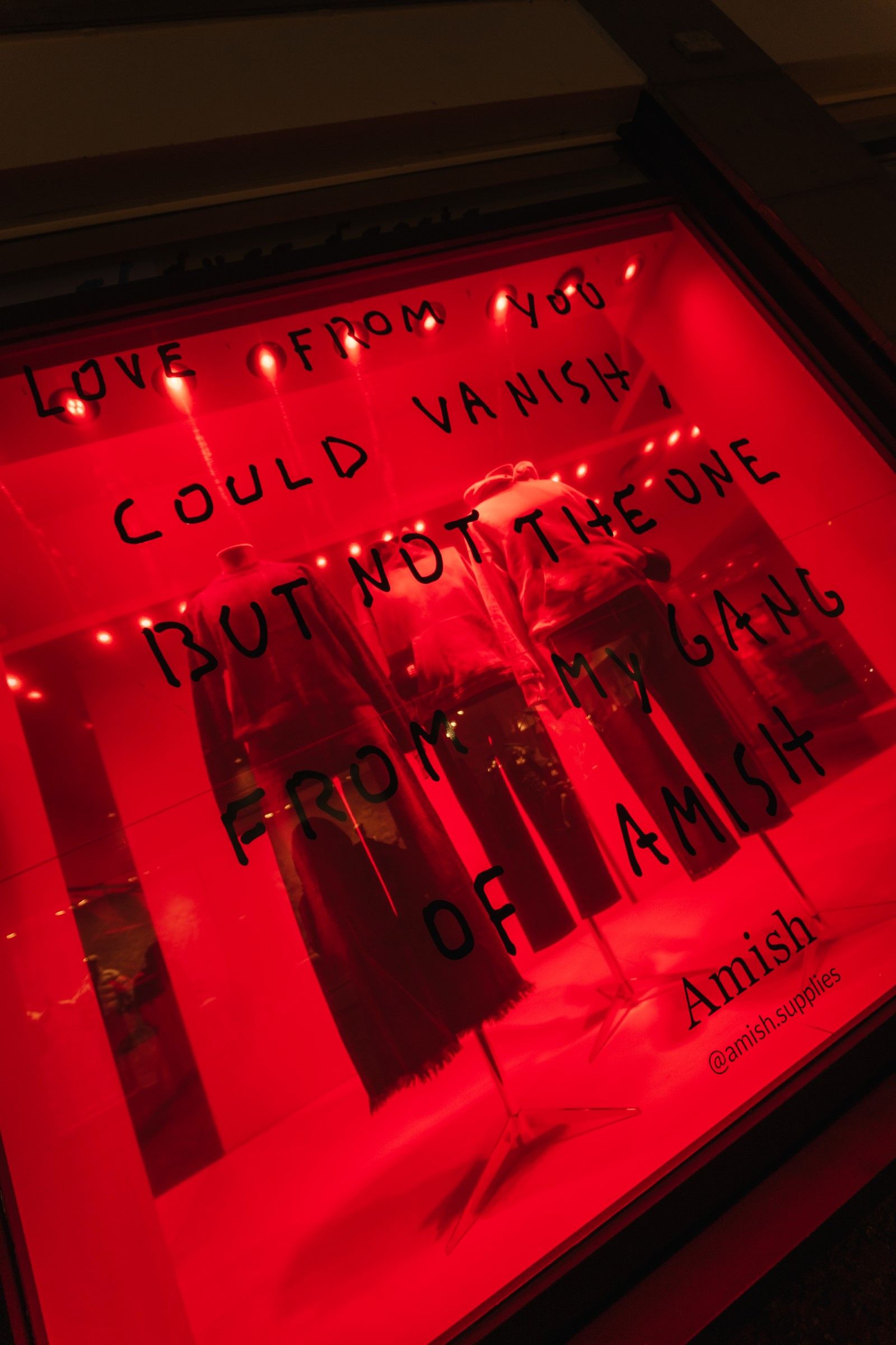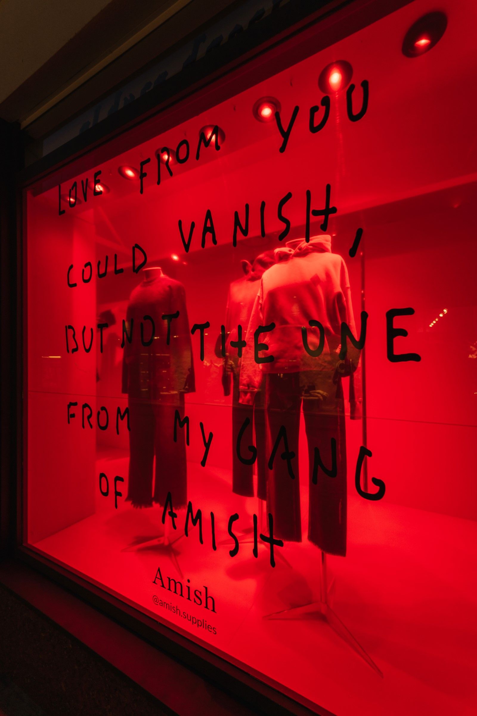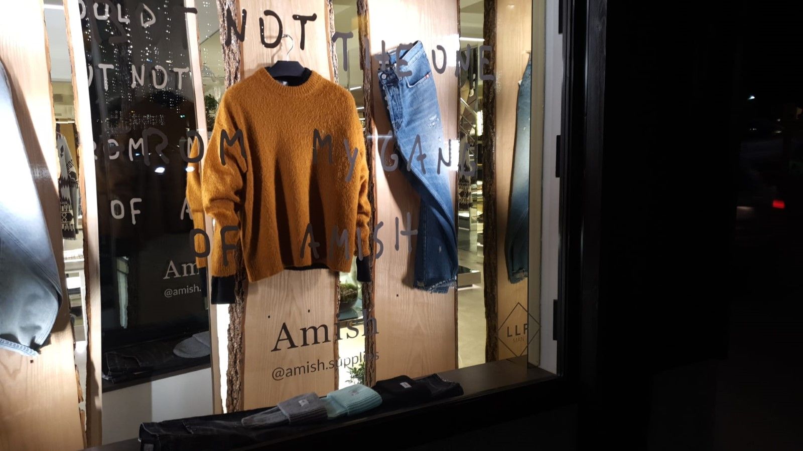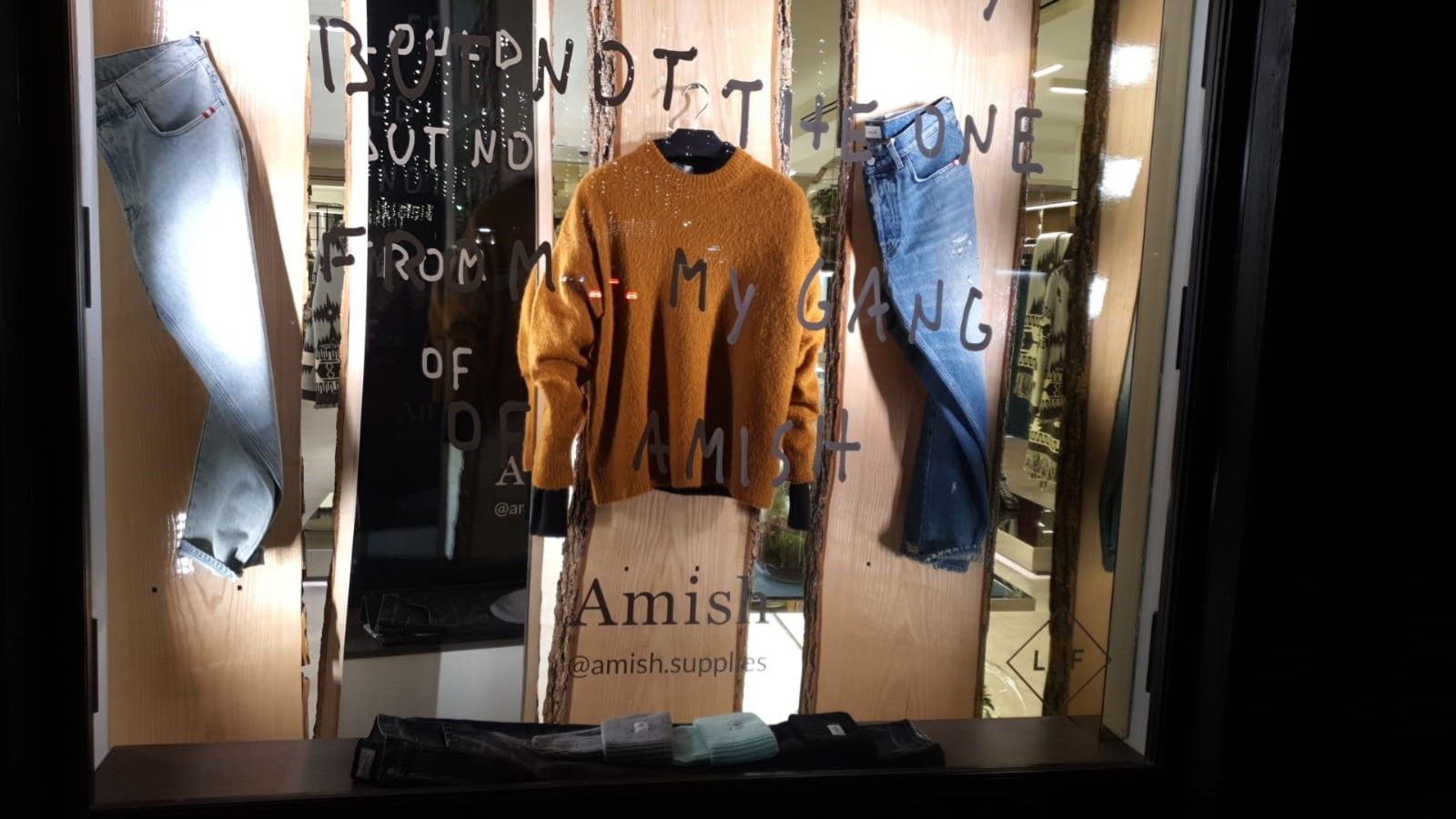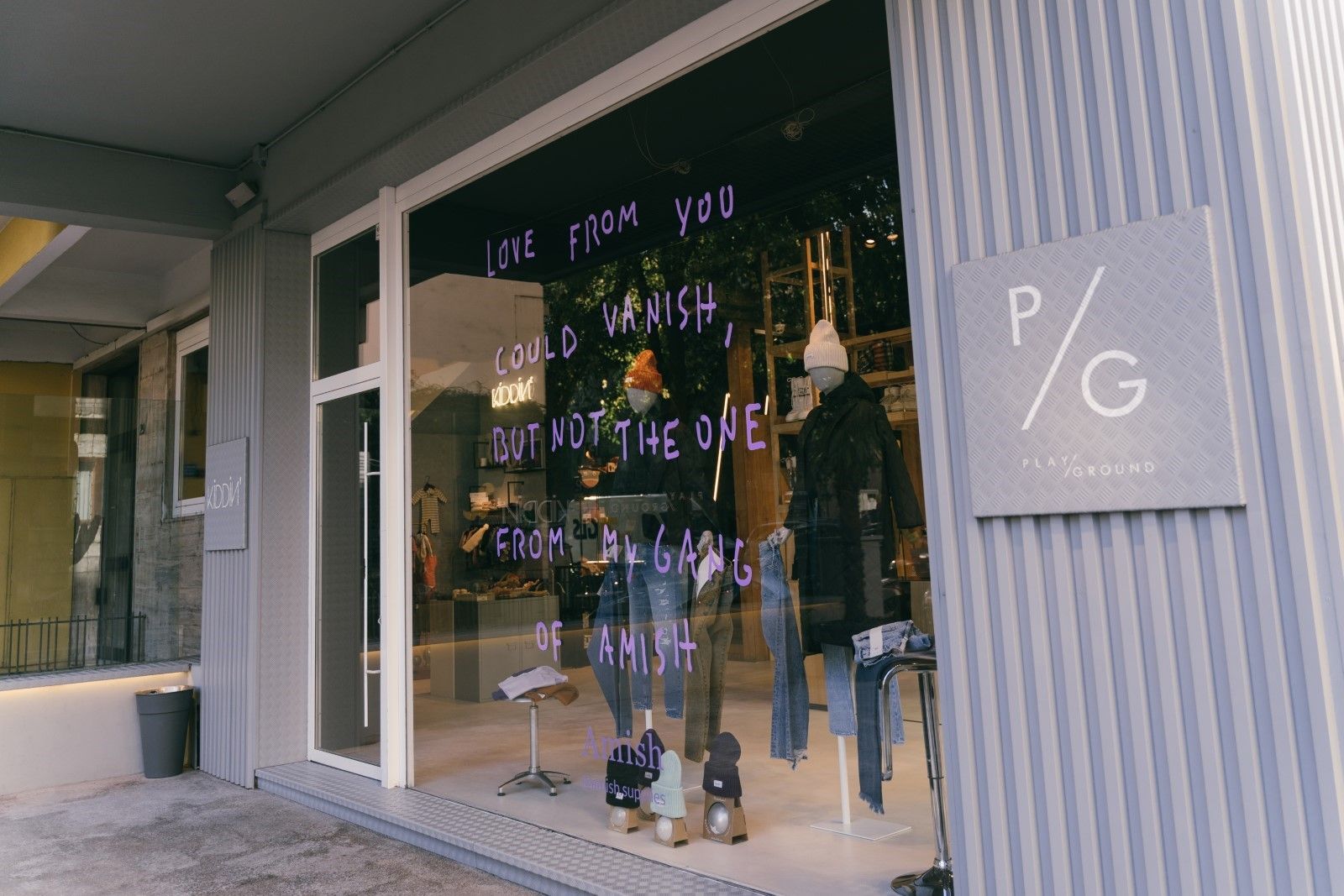 «Love from you could vanish, but not the one from my gang of Amish». This is what the windows of Al Duca D'Aosta in Mestre and Treviso say; of Lungolivigno in Livigno, Tessabit in Como and Playground in Florence – all historic Italian multi-brand boutiques that this year have dedicated one of their windows to Amish, an Italian brand part of the Florentine group Sevenbell, whose light-hearted Hippie Rock garments have recently appeared in the street styles of Paris Fashion Week. An aesthetic that is reflected in the visual installations created for the brand by Pietro Terzini, a multidisciplinary visual artist based in Milan who tells the world of fashion and love according to the Millennial generation through the ironic use of lettering, street art and digital manipulation.