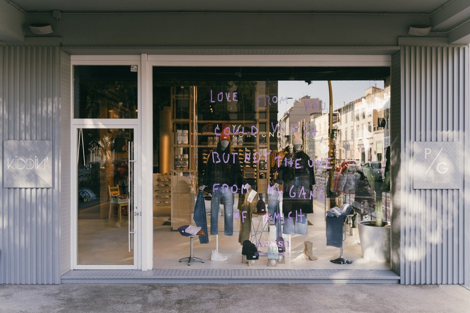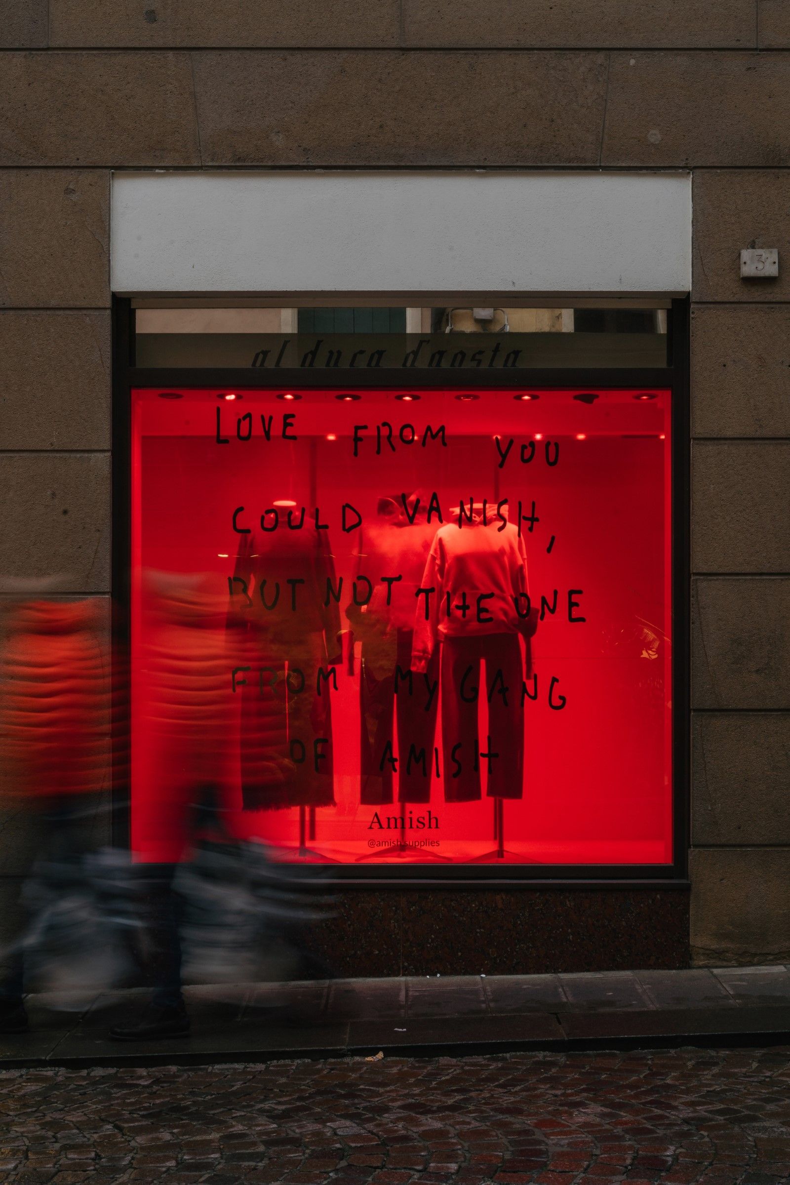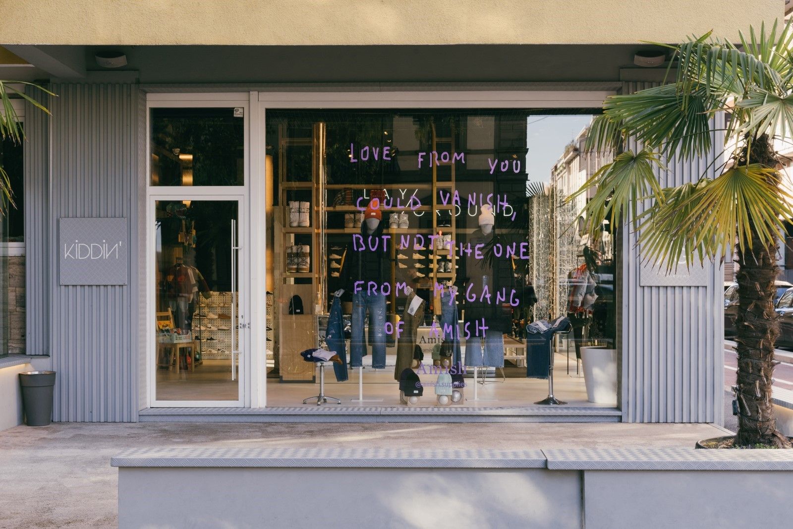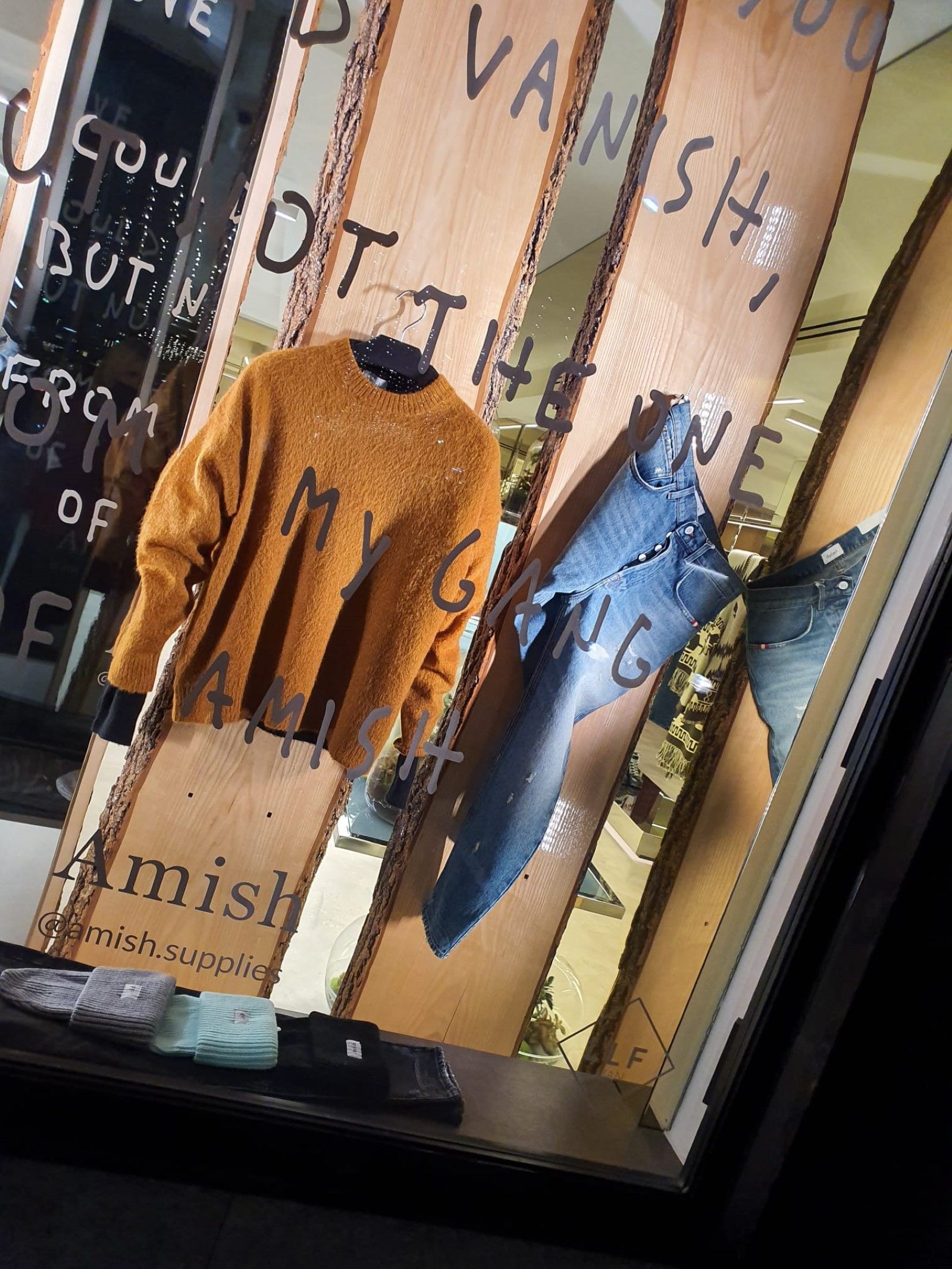 «Love from you could vanish, but not the one from my gang of Amish». This is what the windows of Al Duca D'Aosta in Mestre and Treviso say; of Lungolivigno in Livigno, Tessabit in Como and Playground in Florence – all historic Italian multi-brand boutiques that this year have dedicated one of their windows to Amish, an Italian brand part of the Florentine group Sevenbell, whose light-hearted Hippie Rock garments have recently appeared in the street styles of Paris Fashion Week. An aesthetic that is reflected in the visual installations created for the brand by Pietro Terzini, a multidisciplinary visual artist based in Milan who tells the world of fashion and love according to the Millennial generation through the ironic use of lettering, street art and digital manipulation.
