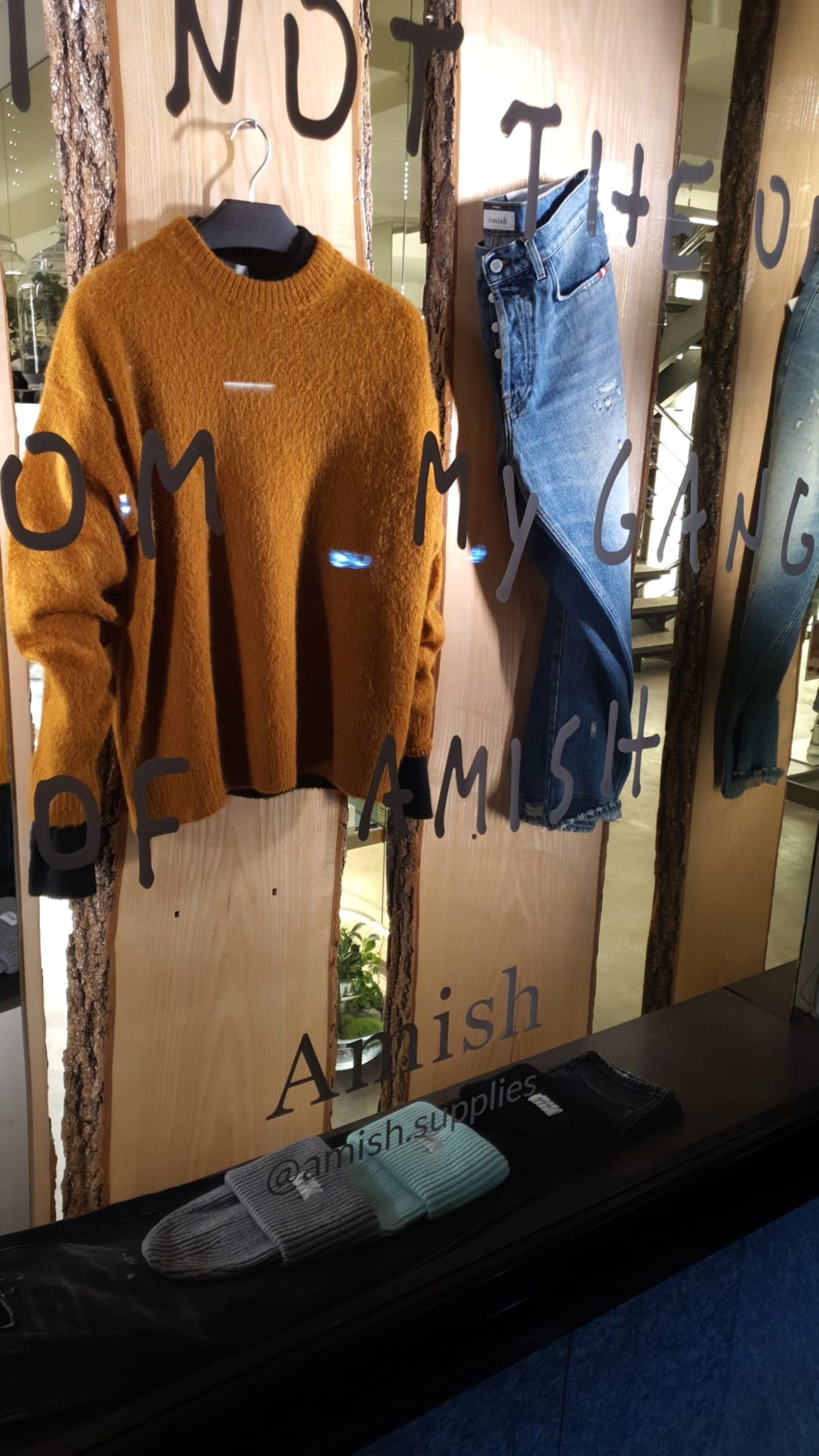 Freedom of expression, curiosity towards the world and the open-minded approach at the base of Amish's values therefore find an ideal representation in the light-hearted lettering of Pietro Terzini, whose works synthesize in the form of a hand-drawn slogan the aesthetics of Amish that with total freedom looks together at the past and the present, with a particular emphasis on denim – a symbol of youth subcultures that is always present in the brand's collections.