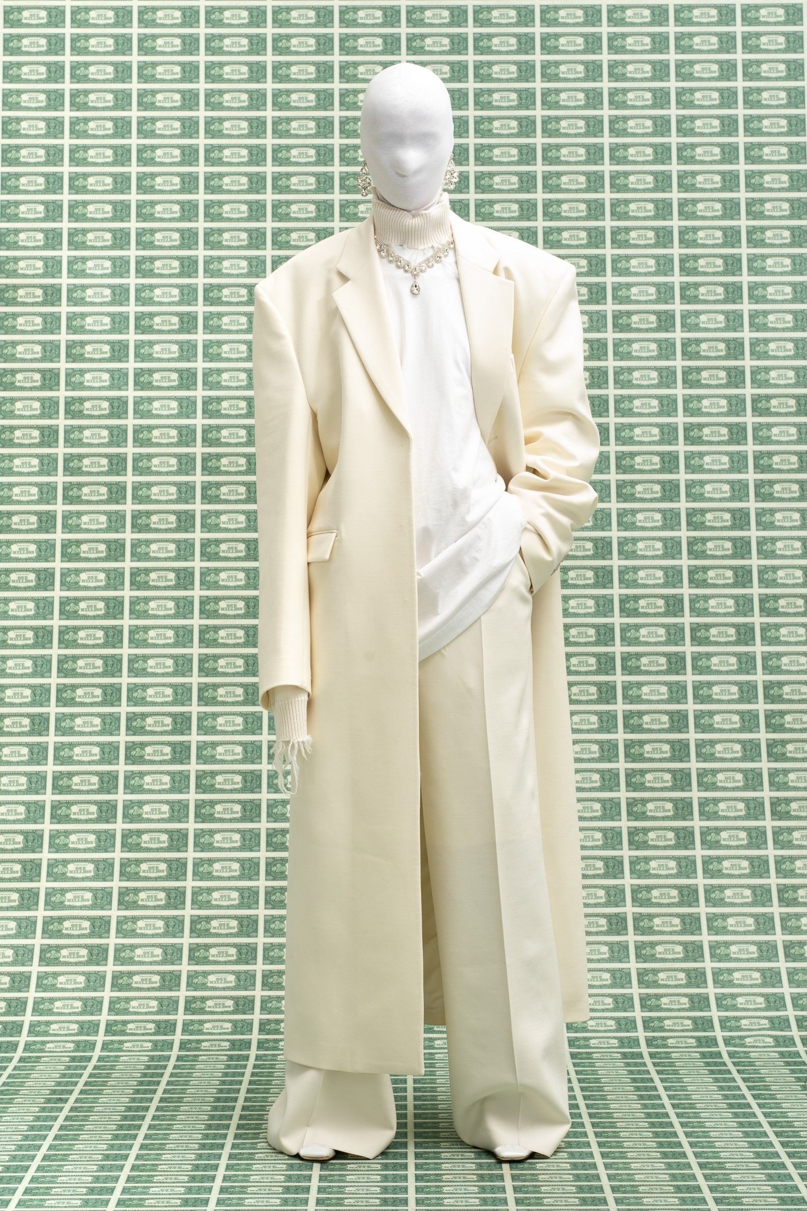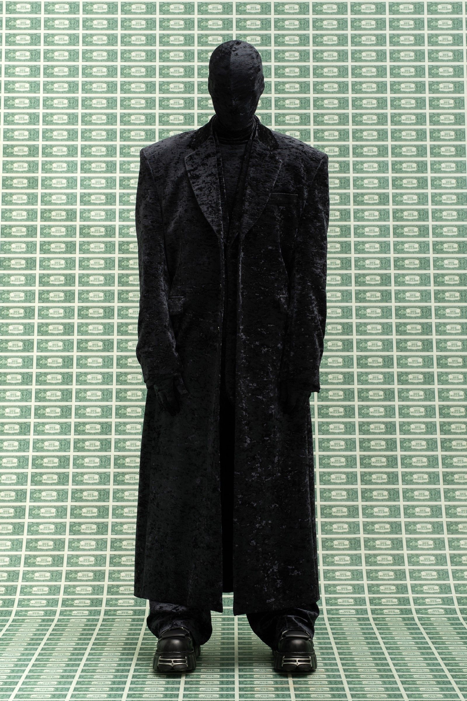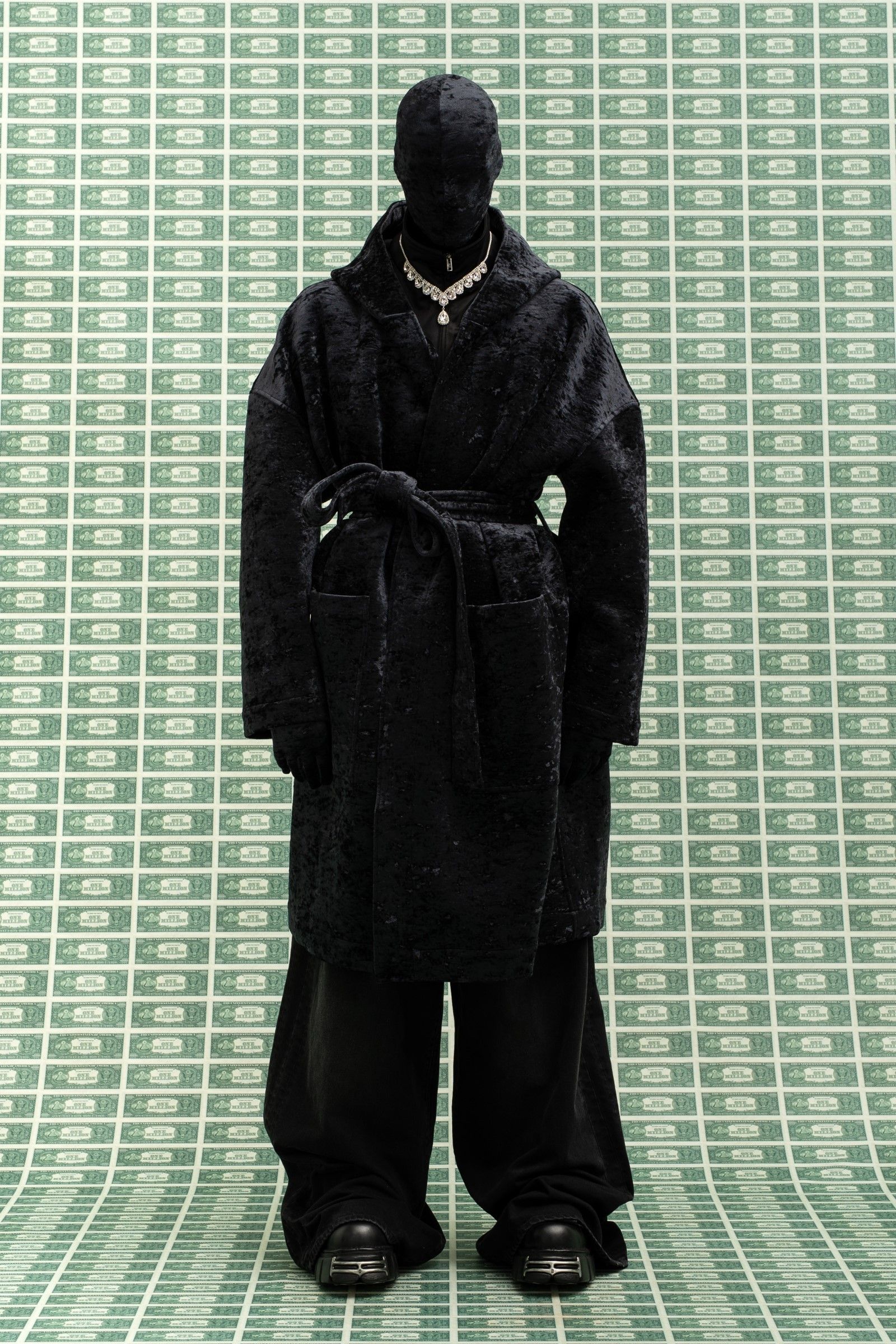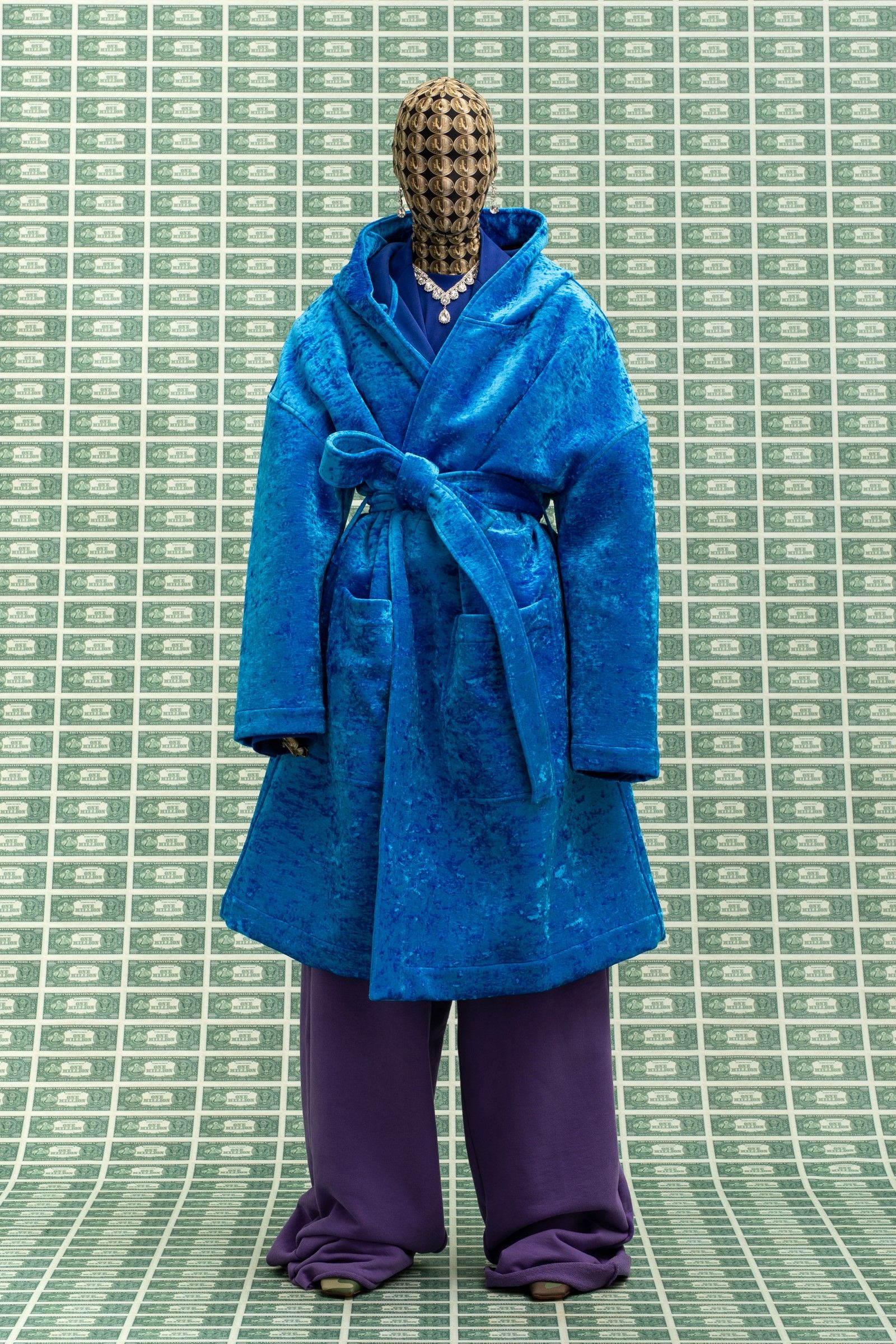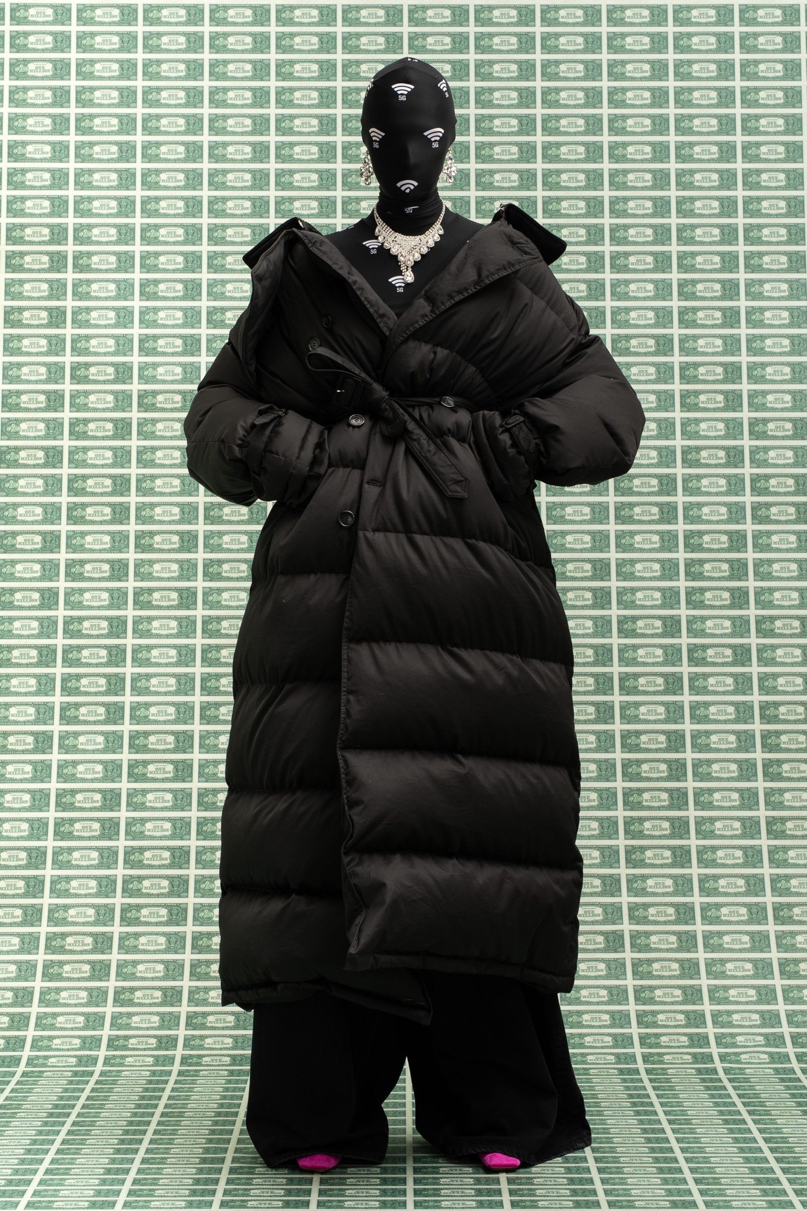 The brand therefore aims to create «high fashion for the era of 5G high speed internet» and therefore contemporary, observant of the most recent phenomena of global culture such as, for example, conspiracy theories, Bitcoin and OnlyFans - but also bearer of a new idea of savoir faire in which technology such as 3D pattern modification, the modularity of clothes and the fusion of different categories together as it happens with trench coats that have the inside of a down jacket. A very high purpose on paper that, however, translated into a lookbook, becomes a kind of compilation of the greatest hits of Demna Gvasalia, former creative director of the brand, not to mention a very cheeky copy of what Balenciaga has come to be this year: the quilted mega t-shirt, the "hourglass" jackets, the tight velour tights or the coats draped and open around the shoulders and the bathrobe-coat are taken straight out from the latest couture show of Balenciaga; many of the other 72 looks, on the other hand, recall Demna's stylistics very closely – although there are exceptions.