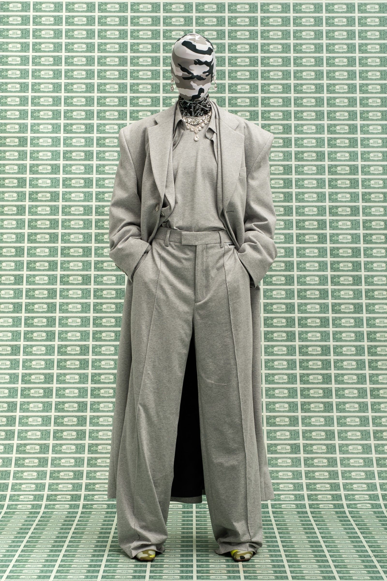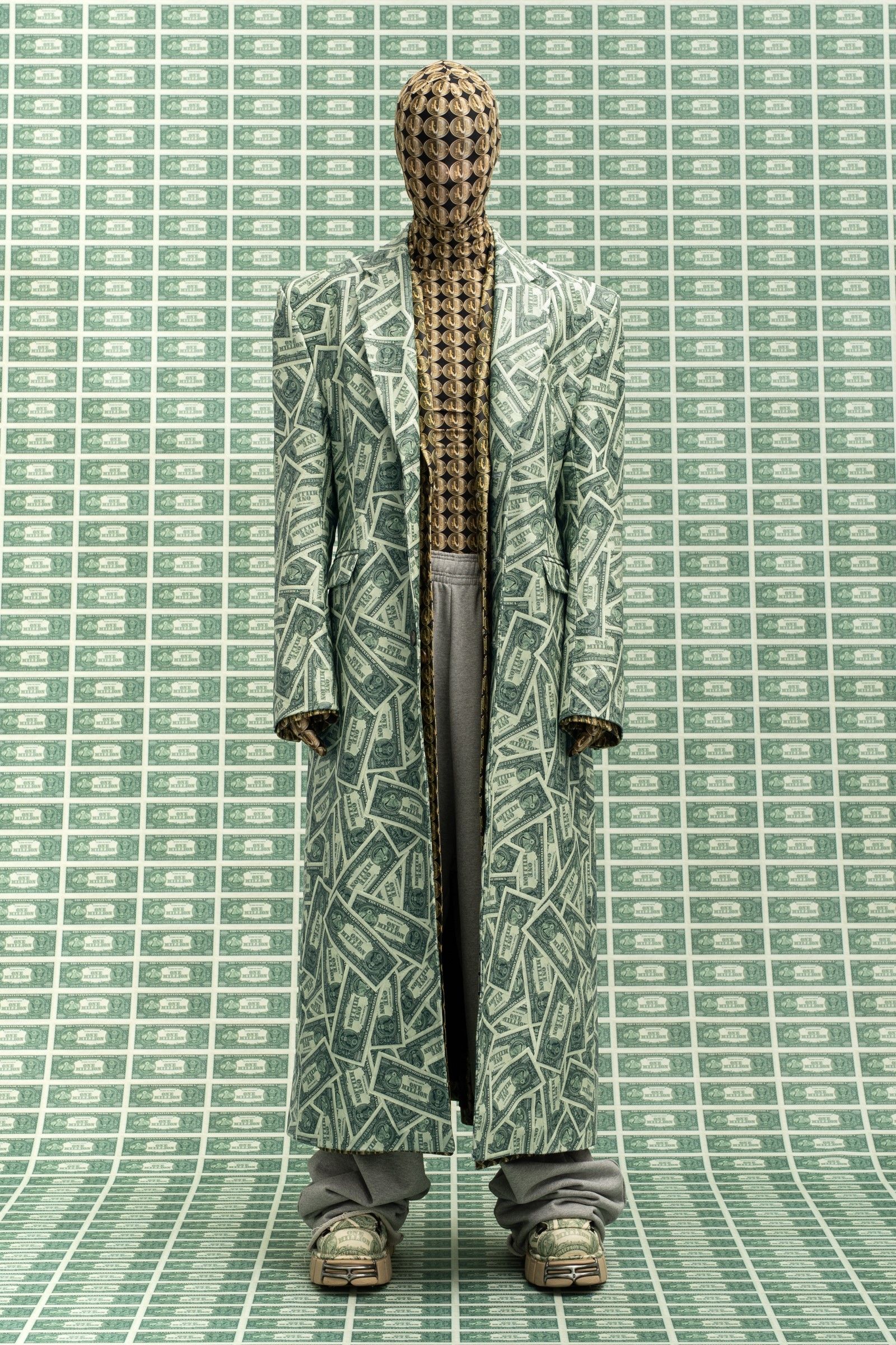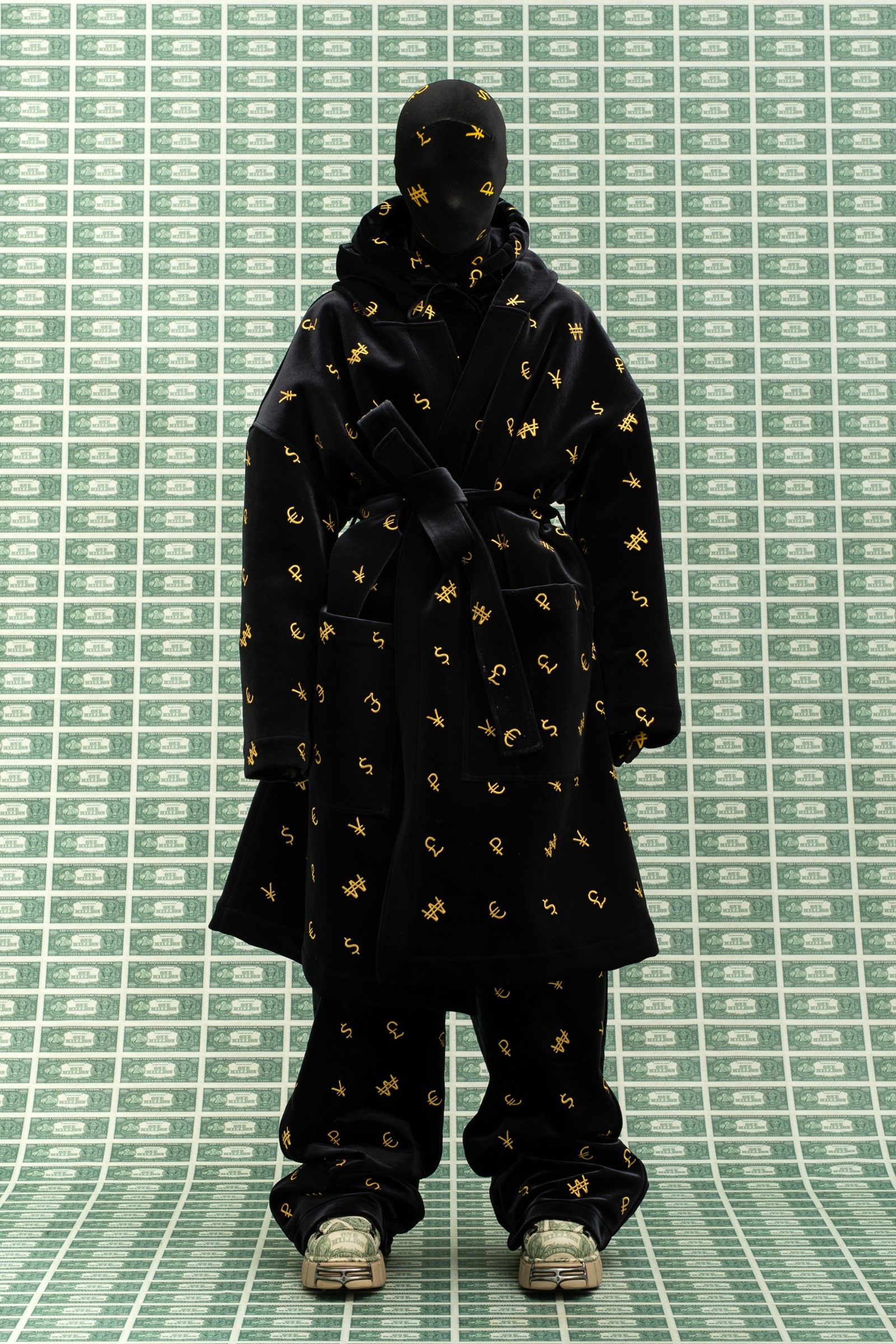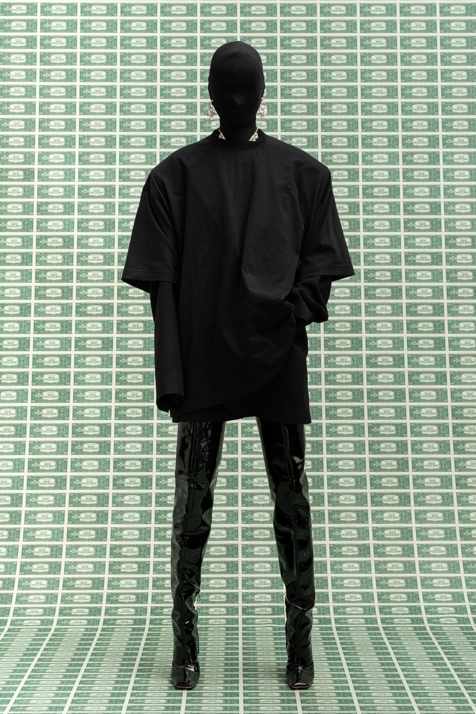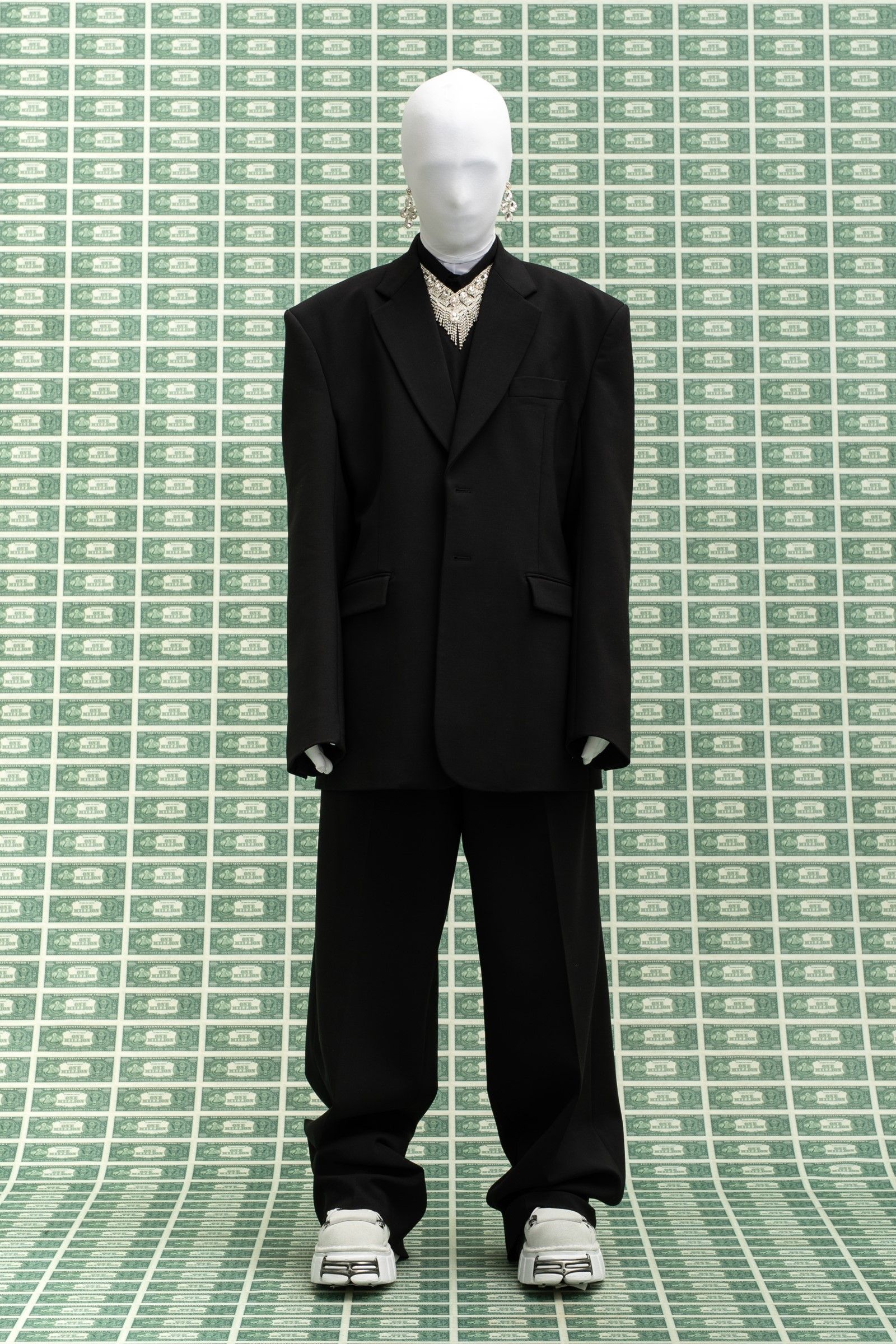 The brand therefore aims to create «high fashion for the era of 5G high speed internet» and therefore contemporary, observant of the most recent phenomena of global culture such as, for example, conspiracy theories, Bitcoin and OnlyFans - but also bearer of a new idea of savoir faire in which technology such as 3D pattern modification, the modularity of clothes and the fusion of different categories together as it happens with trench coats that have the inside of a down jacket. A very high purpose on paper that, however, translated into a lookbook, becomes a kind of compilation of the greatest hits of Demna Gvasalia, former creative director of the brand, not to mention a very cheeky copy of what Balenciaga has come to be this year: the quilted mega t-shirt, the "hourglass" jackets, the tight velour tights or the coats draped and open around the shoulders and the bathrobe-coat are taken straight out from the latest couture show of Balenciaga; many of the other 72 looks, on the other hand, recall Demna's stylistics very closely – although there are exceptions.