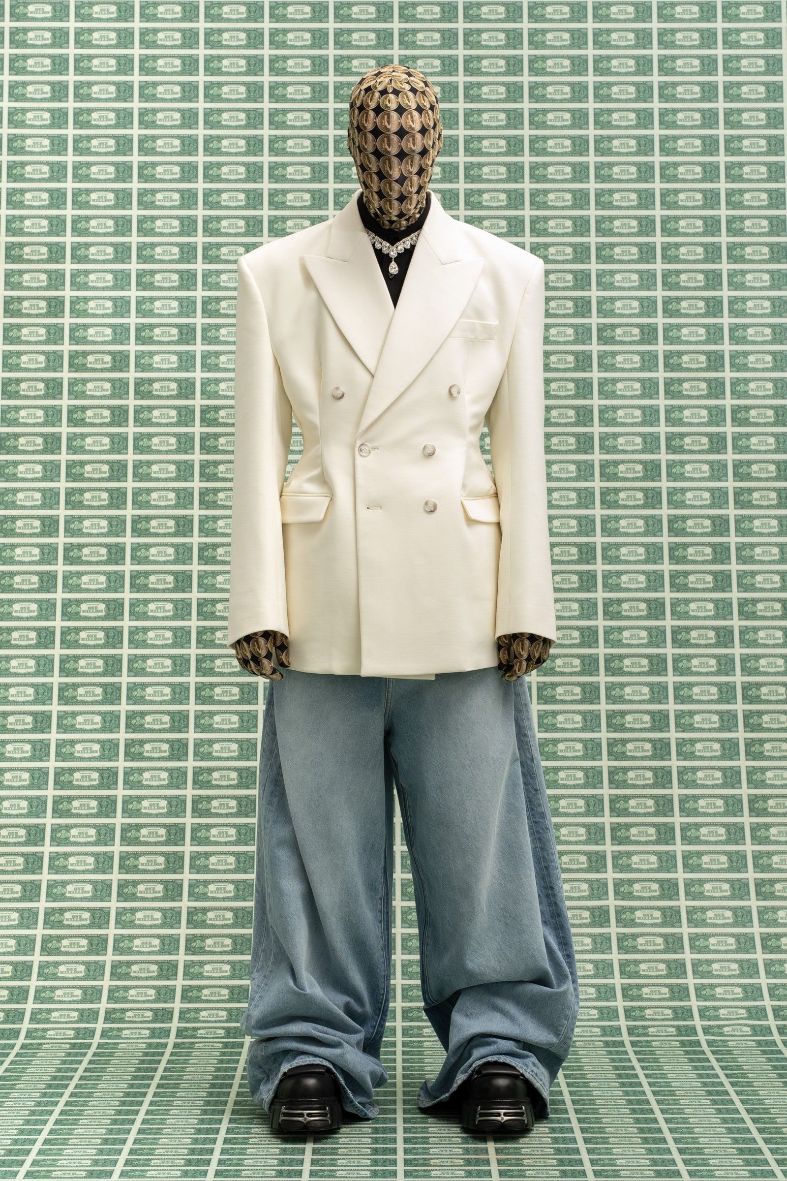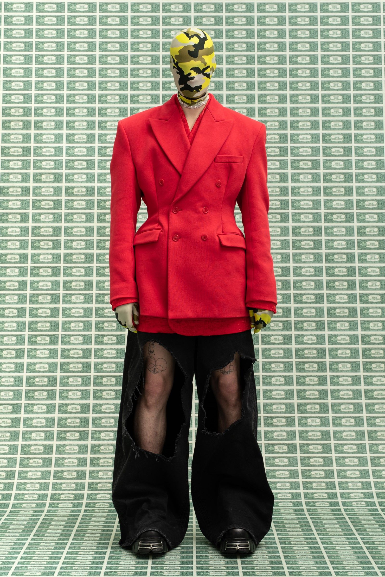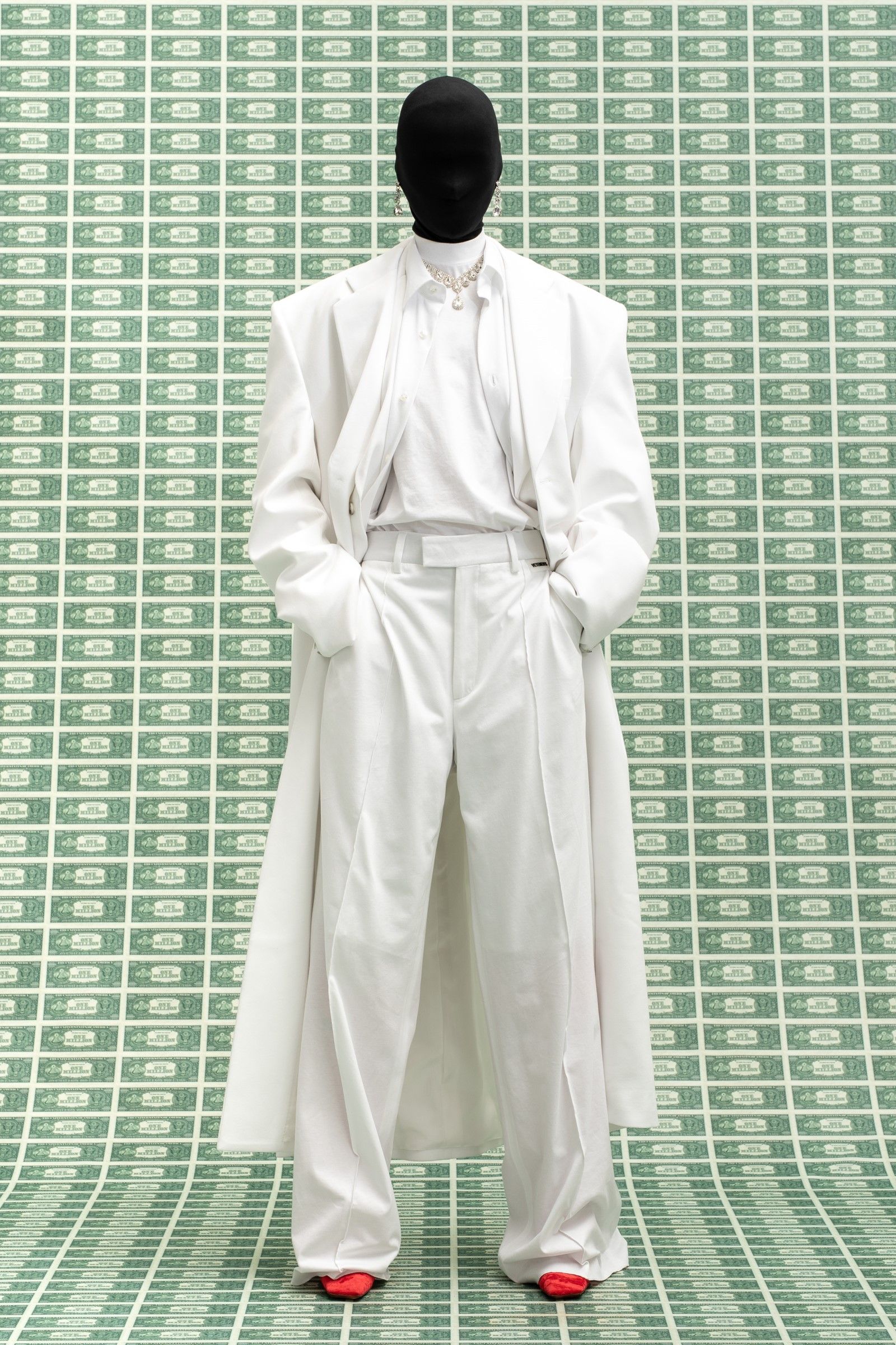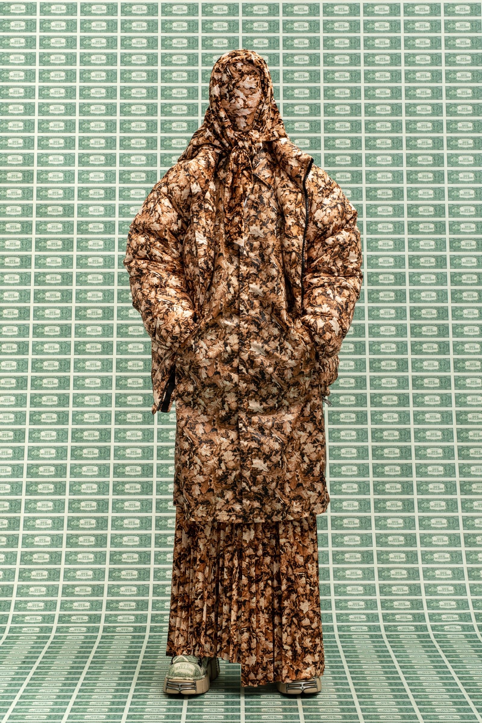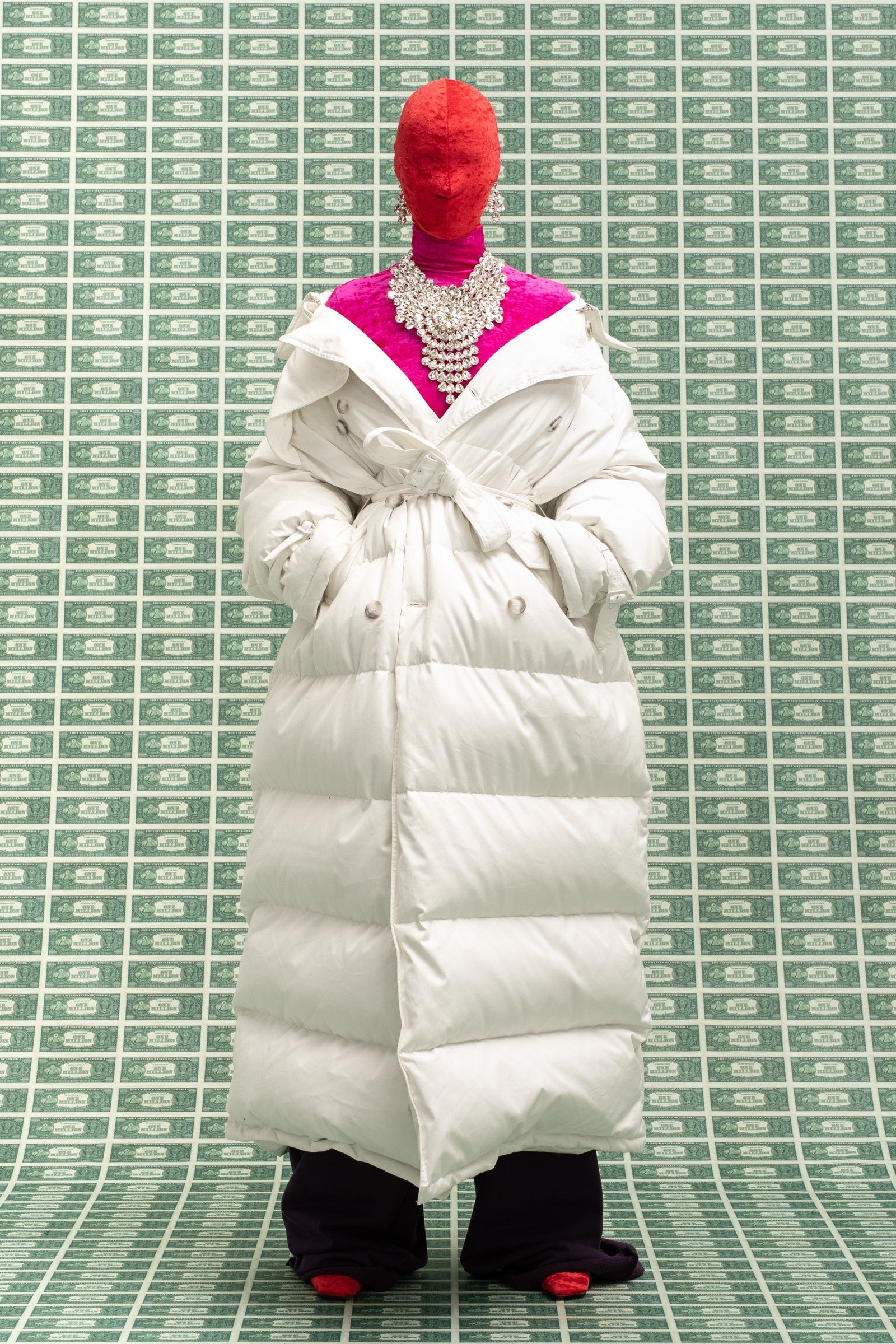 The brand therefore aims to create «high fashion for the era of 5G high speed internet» and therefore contemporary, observant of the most recent phenomena of global culture such as, for example, conspiracy theories, Bitcoin and OnlyFans - but also bearer of a new idea of savoir faire in which technology such as 3D pattern modification, the modularity of clothes and the fusion of different categories together as it happens with trench coats that have the inside of a down jacket. A very high purpose on paper that, however, translated into a lookbook, becomes a kind of compilation of the greatest hits of Demna Gvasalia, former creative director of the brand, not to mention a very cheeky copy of what Balenciaga has come to be this year: the quilted mega t-shirt, the "hourglass" jackets, the tight velour tights or the coats draped and open around the shoulders and the bathrobe-coat are taken straight out from the latest couture show of Balenciaga; many of the other 72 looks, on the other hand, recall Demna's stylistics very closely – although there are exceptions.