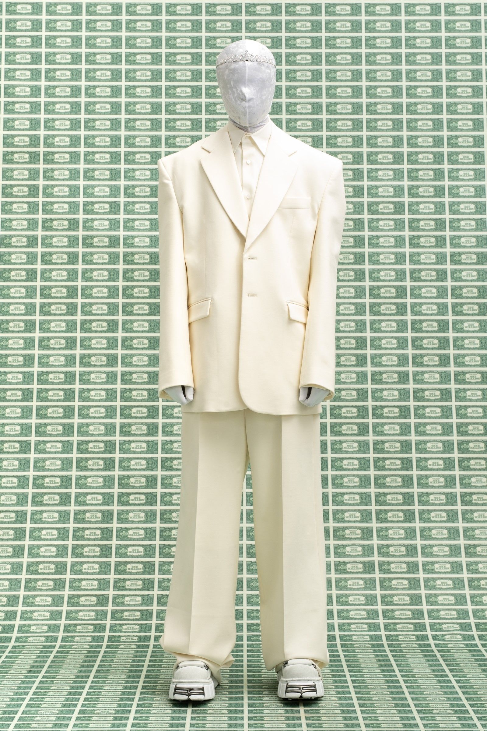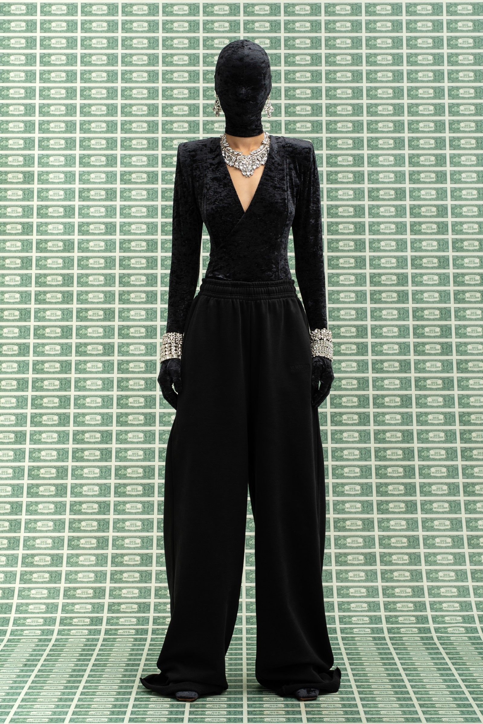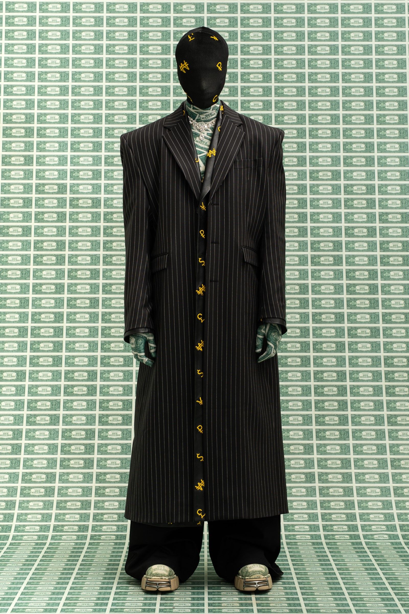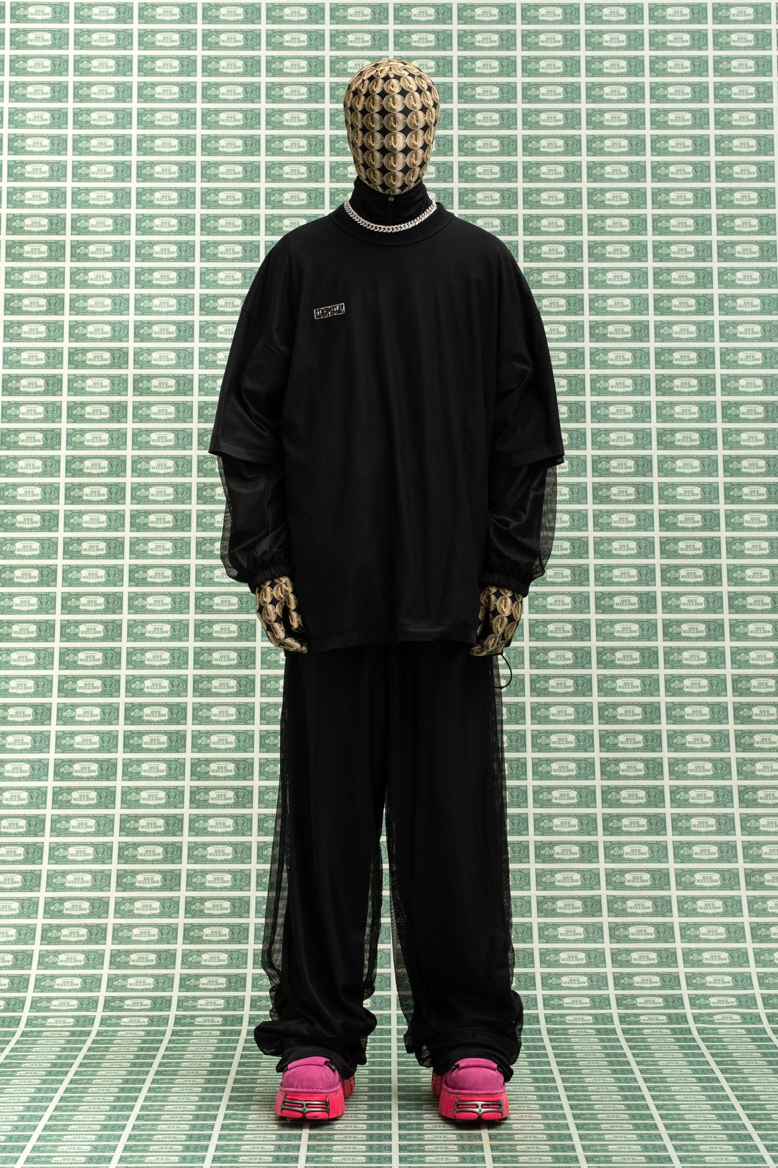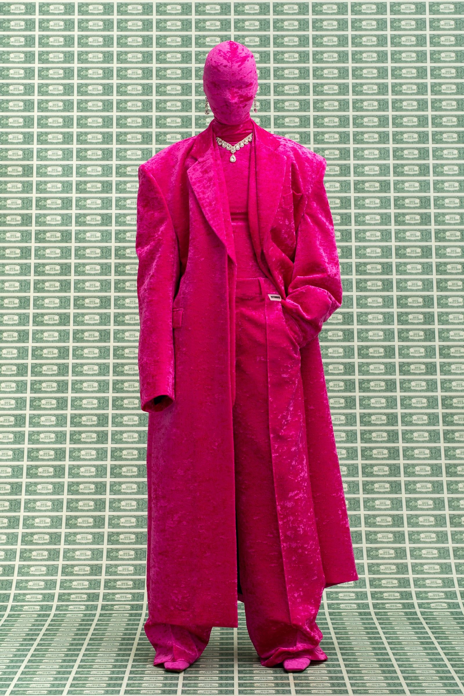 The brand therefore aims to create «high fashion for the era of 5G high speed internet» and therefore contemporary, observant of the most recent phenomena of global culture such as, for example, conspiracy theories, Bitcoin and OnlyFans - but also bearer of a new idea of savoir faire in which technology such as 3D pattern modification, the modularity of clothes and the fusion of different categories together as it happens with trench coats that have the inside of a down jacket. A very high purpose on paper that, however, translated into a lookbook, becomes a kind of compilation of the greatest hits of Demna Gvasalia, former creative director of the brand, not to mention a very cheeky copy of what Balenciaga has come to be this year: the quilted mega t-shirt, the "hourglass" jackets, the tight velour tights or the coats draped and open around the shoulders and the bathrobe-coat are taken straight out from the latest couture show of Balenciaga; many of the other 72 looks, on the other hand, recall Demna's stylistics very closely – although there are exceptions.