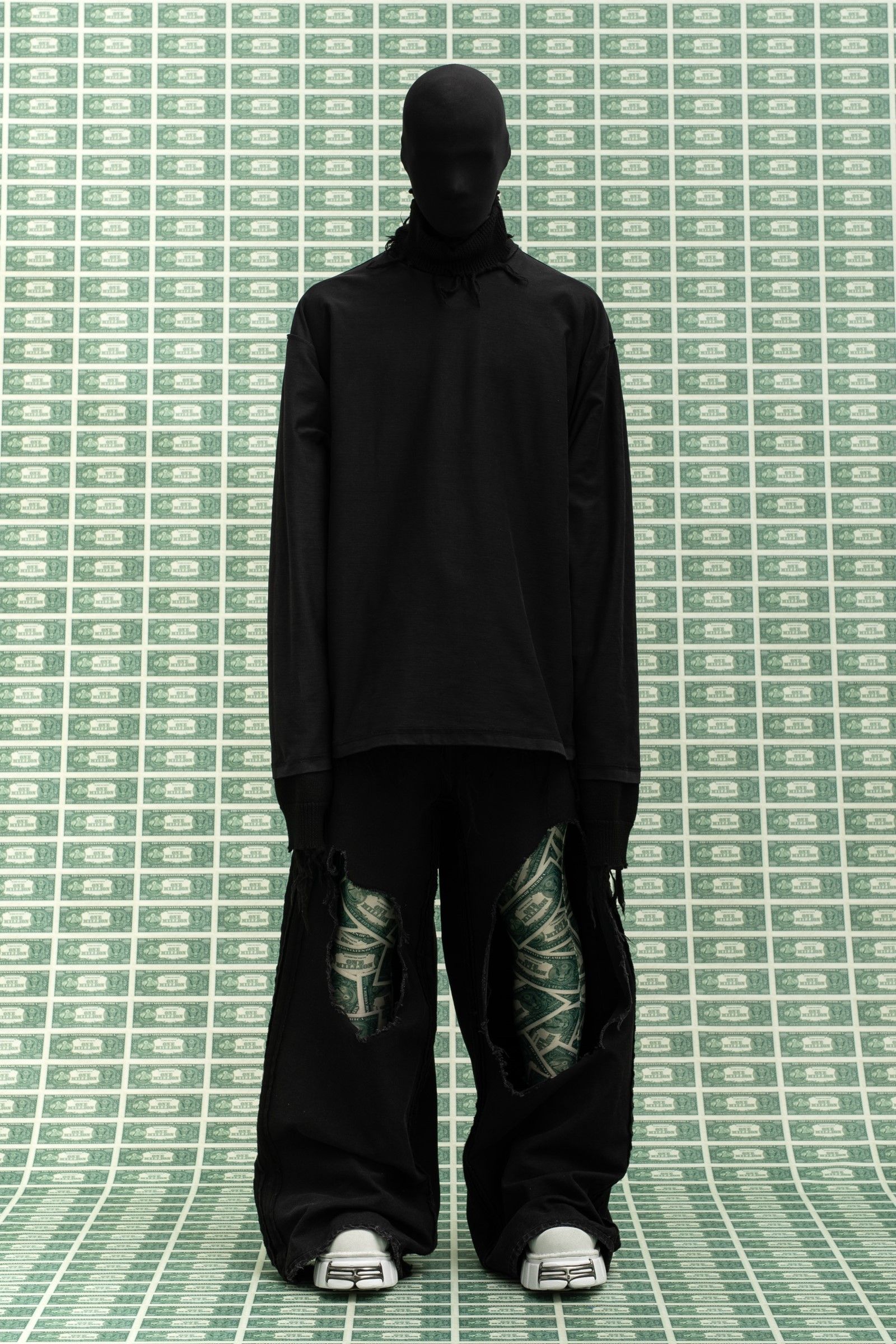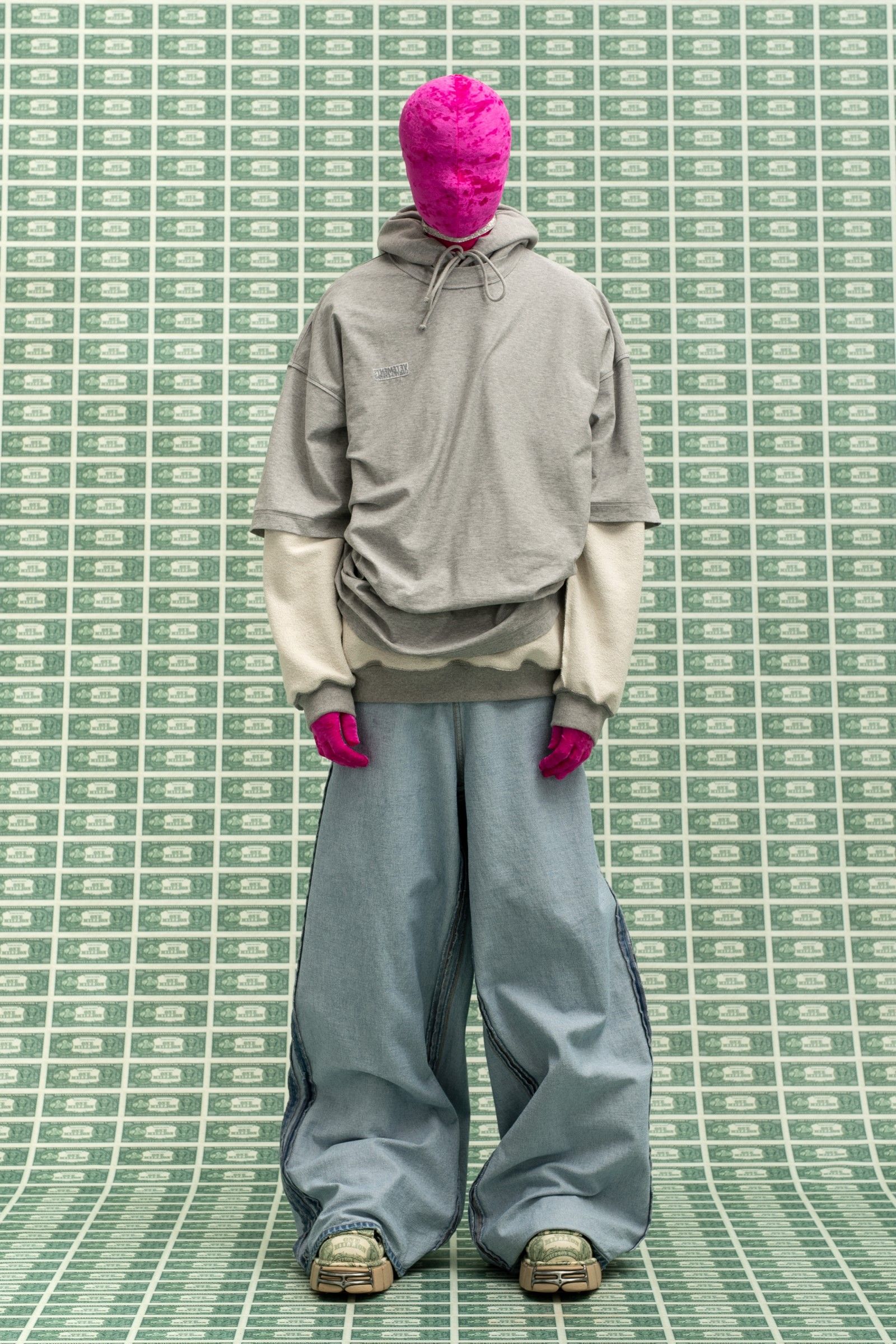 One of the many elements that increases the confusion is the footwear: Demna Gvasalia had introduced platform shoes in the last RTW show of Balenciaga that were an almost exact replica of the famous New Rock, shoe symbol of the goth and metal scene; for this collection Vetements has collaborated with New Rock, creating a footwear that is, on the one hand, a cheeky replica of Balenciaga but, on the other, a true collaboration with the brand from which Balenciaga had taken "free inspiration". A really interesting perspective trick that still elevates the collection together with some novelties that appear instead completely original and that, while remaining faithful to the original spirit of the brand, represents a detachment from the unabashed imitation of the works of the ex-creative director. Specifically, there is a whole look including a hoodie, trousers, blazers and long coat that is entirely composed of a gray melange cotton like that of the classic gymwear that is a small gem of post-streetwear tailoring; on the level of irony, however, the decision to create the conspiracy merch was a good one, as is the multilayer jeans of another look.