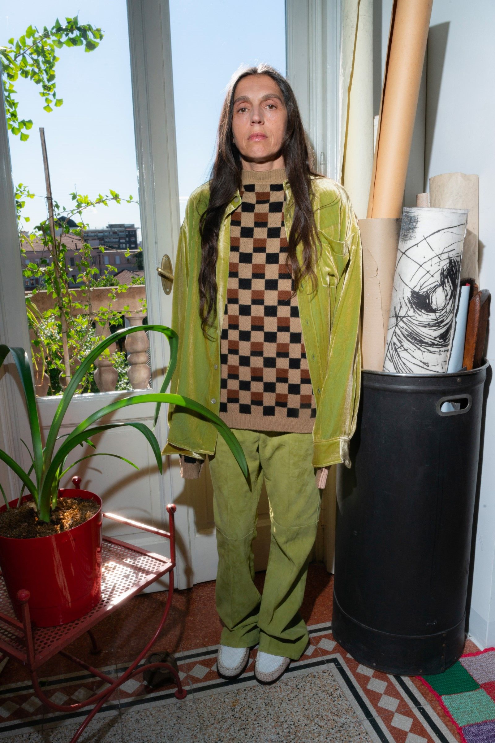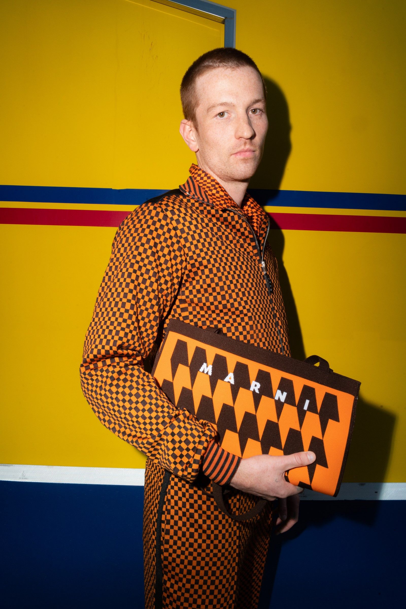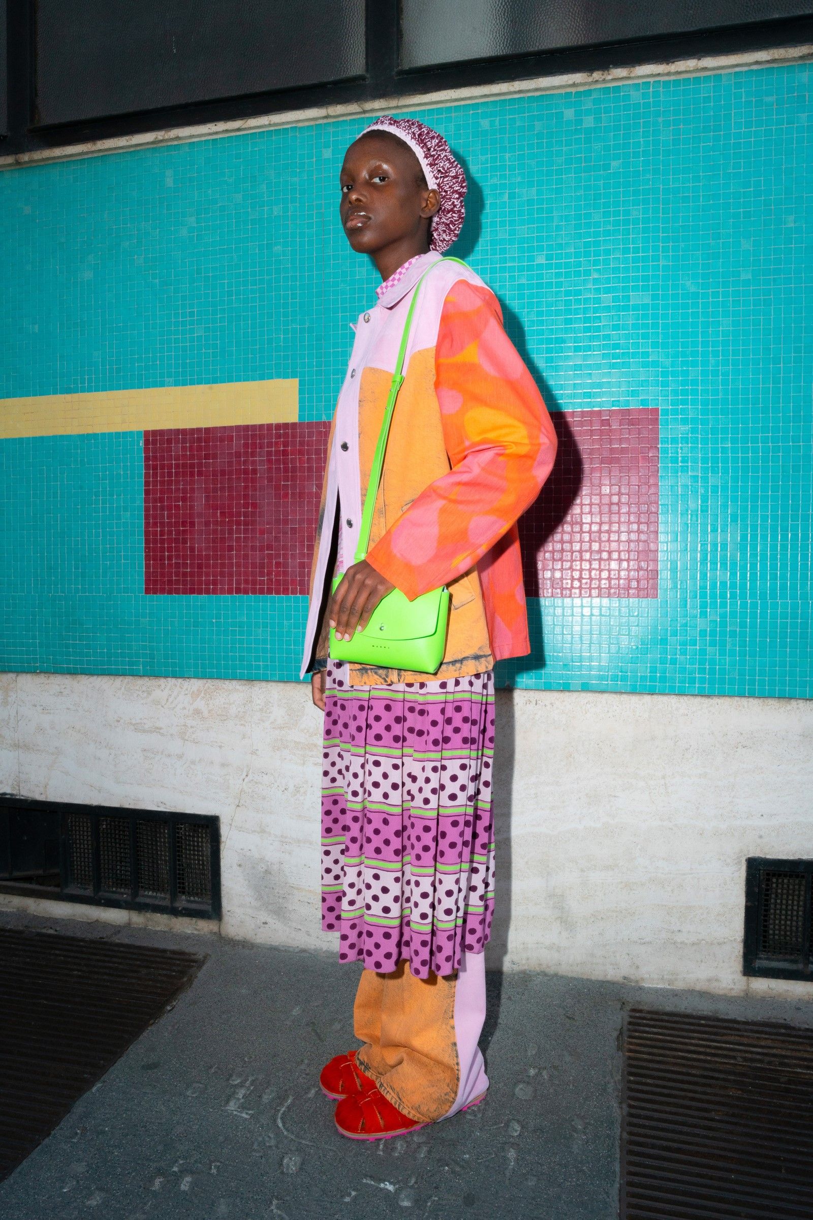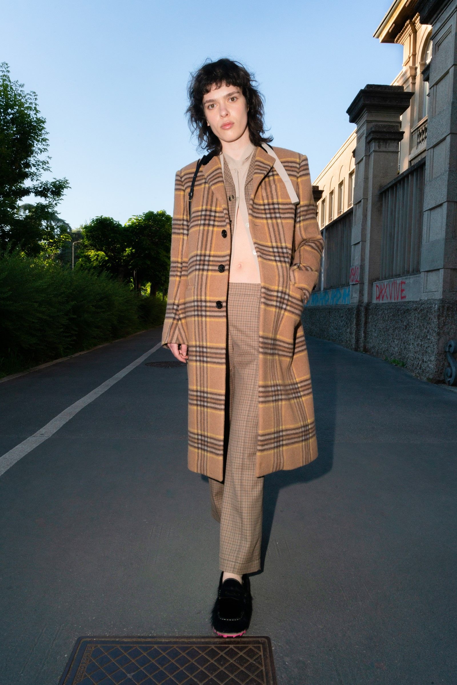 Between accumulations of prints, textures and layering multiplied; loafers and GAT sneakers; tartan, chess and pied-de-poule, Marni's parade of faces winds through Milan and through the pages of the lookbook. Speaking to Vogue, Risso said that he had made the protagonists themselves decide on the location and look of the shots – all to create the collective portrait of a community but also to promote that sense of open work, circularity of experiences and knowledge that is the basis of the work of the creative director and that was elevated to epic levels during the SS22 show of last Milan Fashion Week, perhaps the best seen in the city during the week for sophistication, for concept and for the ability to create an authentic sense of happening.