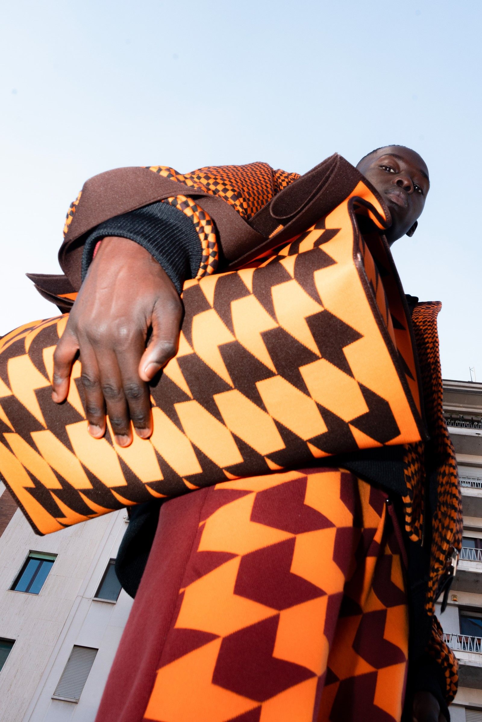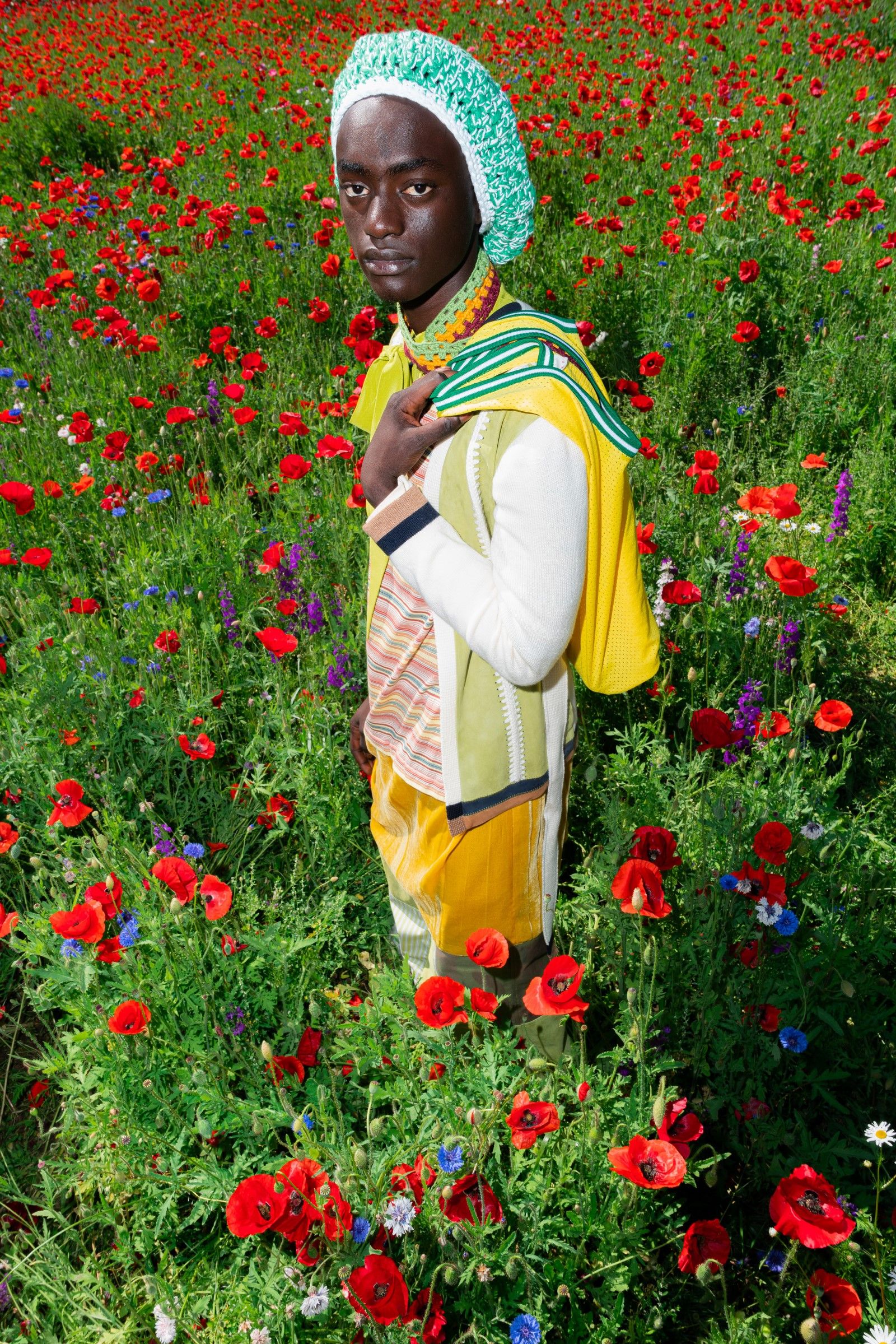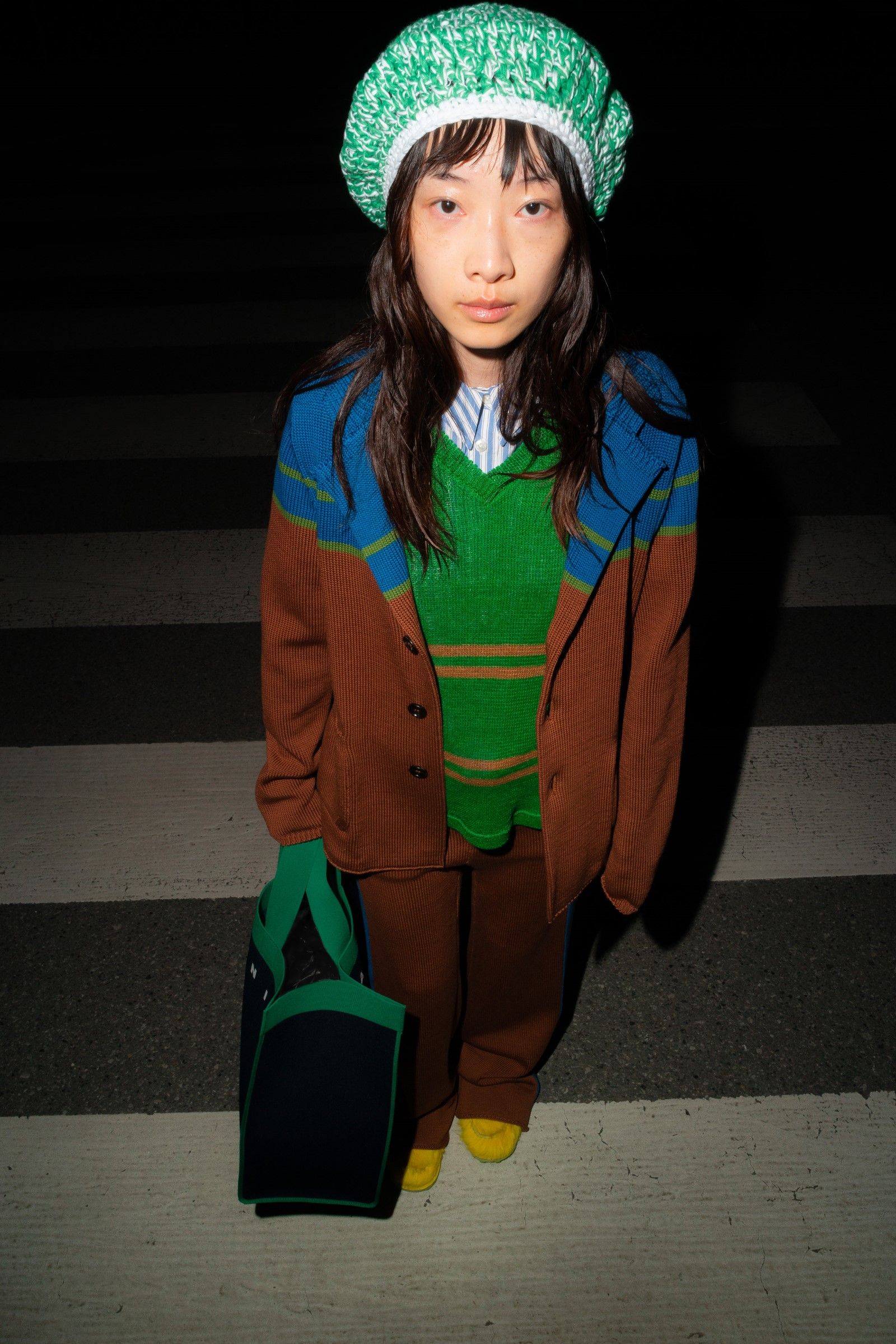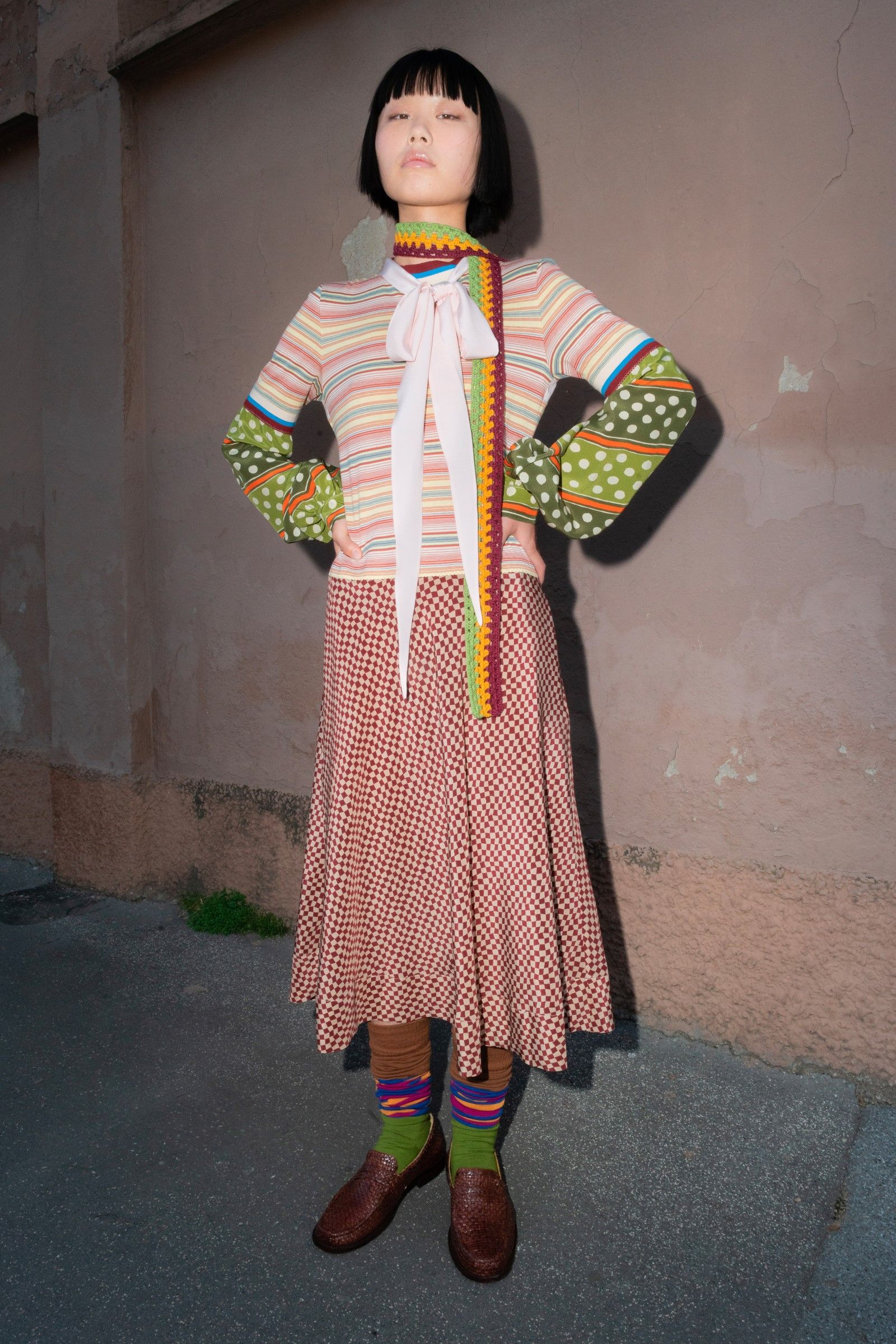 Between accumulations of prints, textures and layering multiplied; loafers and GAT sneakers; tartan, chess and pied-de-poule, Marni's parade of faces winds through Milan and through the pages of the lookbook. Speaking to Vogue, Risso said that he had made the protagonists themselves decide on the location and look of the shots – all to create the collective portrait of a community but also to promote that sense of open work, circularity of experiences and knowledge that is the basis of the work of the creative director and that was elevated to epic levels during the SS22 show of last Milan Fashion Week, perhaps the best seen in the city during the week for sophistication, for concept and for the ability to create an authentic sense of happening.