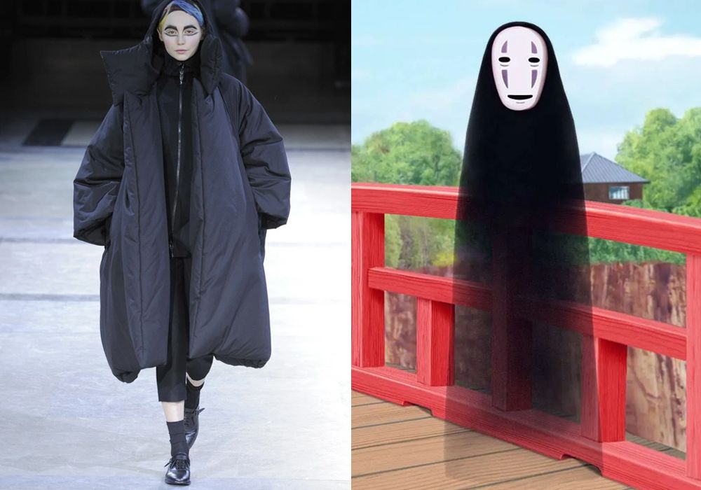 In reality, the collaboration between Loewe and Studi Ghibli, available from January 7th, is only the latest evolution of a relationship that has reached the catwalks of fashion weeks, inspiring names such as Vivienne Westwood and Alexander McQueen. In a game of similarities more or less declared and told by Francesca Dunn on i-D, some of Chloe's clothes seem to be inspired by Spirited Away or My Neighbor Totoro, while No Face Volto seems to emerge in a dress signed by Yohji Yamamoto. If Valentino is unlikely to have seen Ponyo, the resemblance between one of his dresses and the film's protagonist actually reminds us of the stylistic value of Ghibli creations, capable of stepping out of the big screen and representing Japanese tradition in a different way. The fascination for the West typical of Japanese culture often finds space in the costumes of the protagonists of Hayao Miyazaki's films, where sneakers, tees and oversized outfits are featured. This is the case of Kiki and Chichiro, perfect examples of the "hybrid" aesthetics of Ghibli characters that blend with the magical and imaginative creatures that accompany the adventures of Miyazaki's heroines.