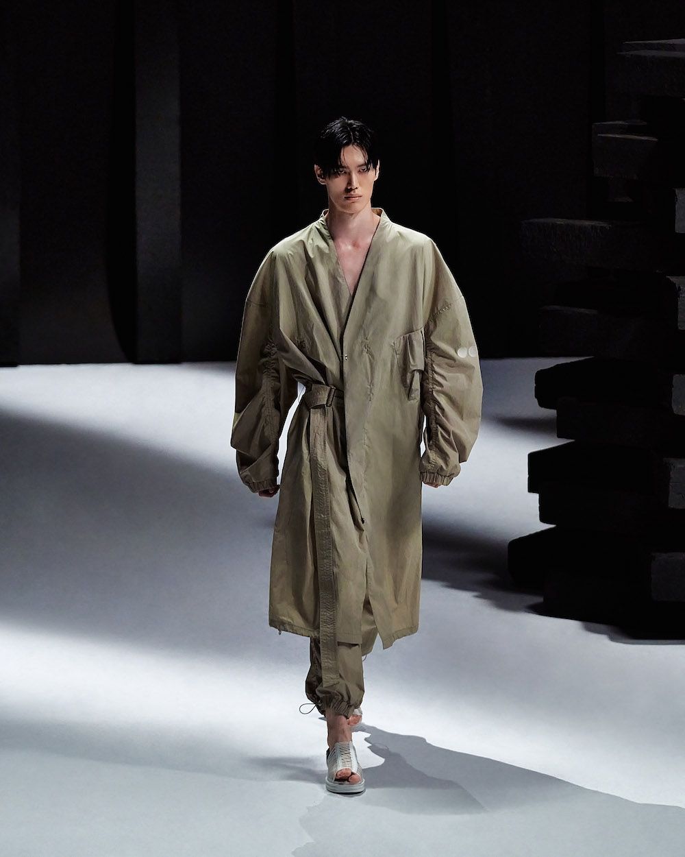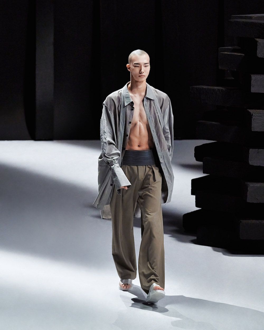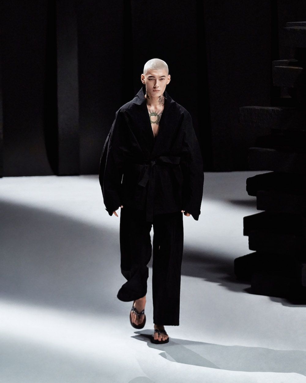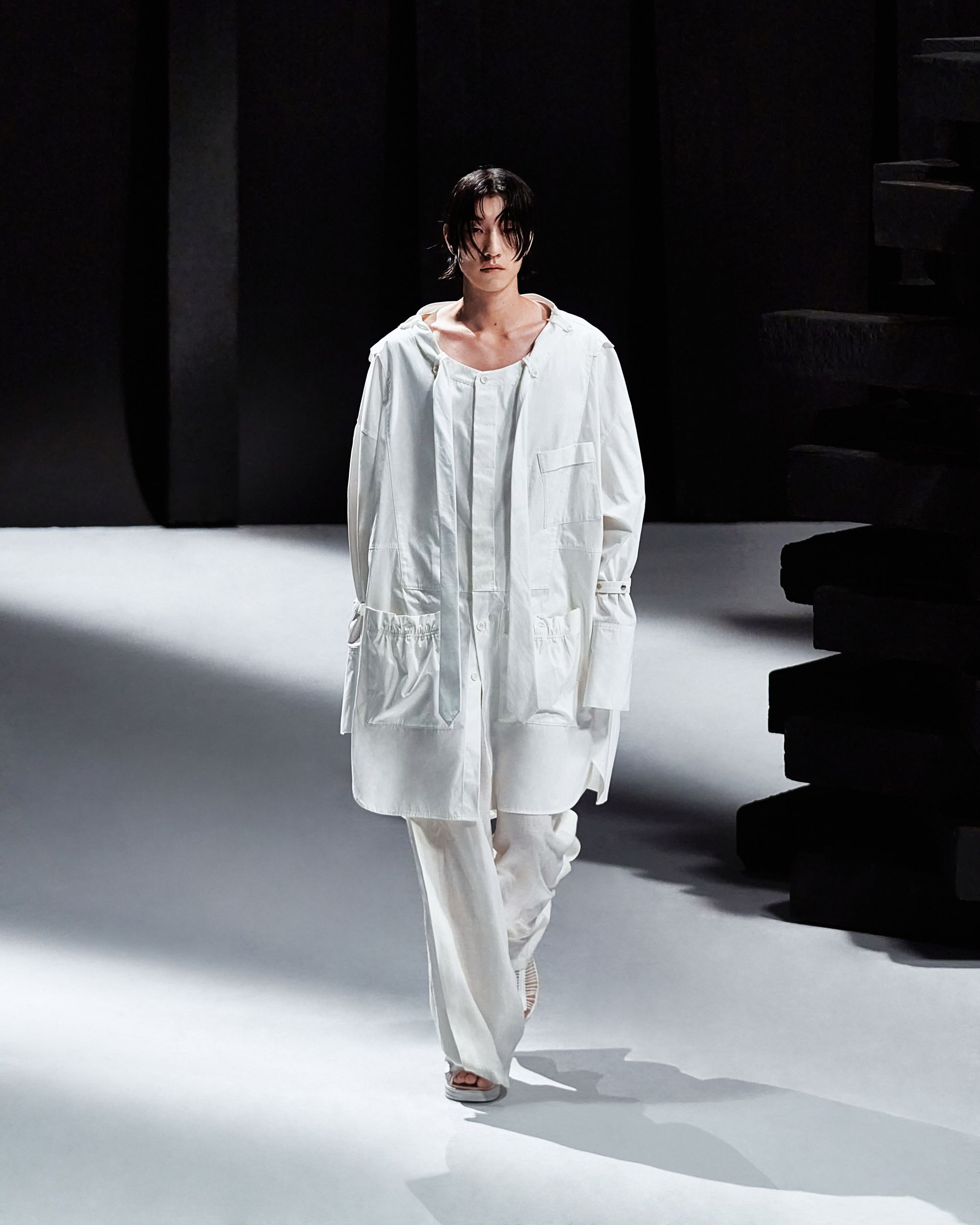 Founded in 1993 in Seoul, Songzio became famous for its total black looks, for having dressed the most important characters in the Korean entertainment industry (from k-pop singers to actors such as Cha Seung-won and Lee Soo-hyuk), as well as the main spoke-person of high fashion menswear in Korea. From the borders of South Korea, the brand began its international expansion during Paris Men's Fashion Week in 2006 and hasn't stopped since. The new SS22 collection, entitled Apparition, is inspired by the vision of a dark night illuminated by a thin white fog and explores the contrasts on which the brand has built its aesthetic: dark and light, order and disorder, East and West.