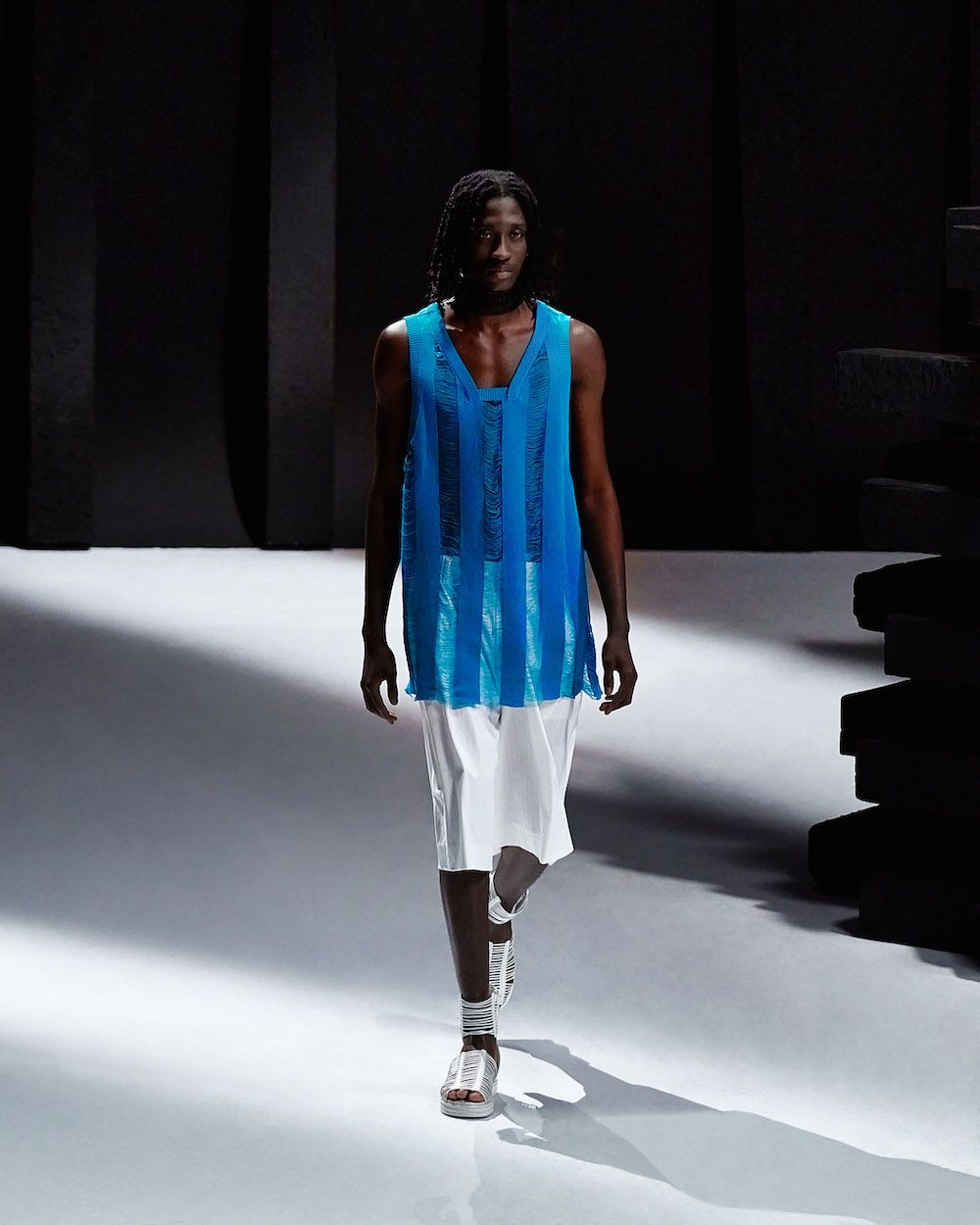 Traditional tunics and silhouettes blend with hi-tech materials and innovative manufacturing techniques. The fulcrum around which this collection revolves is the desire to deconstruct typically oriental models, in a color palette mainly black and white, but which is also enriched with cut-out knitwear pieces in the colors of electric blue and olive green. Leather threads, hand-folded buttons, slits and curved cuts, detachable pieces and hand-painted leather: Songzio expresses the idea opposition of order and disorder through an obsessive attention to detail and the juxtaposition of fabrics.