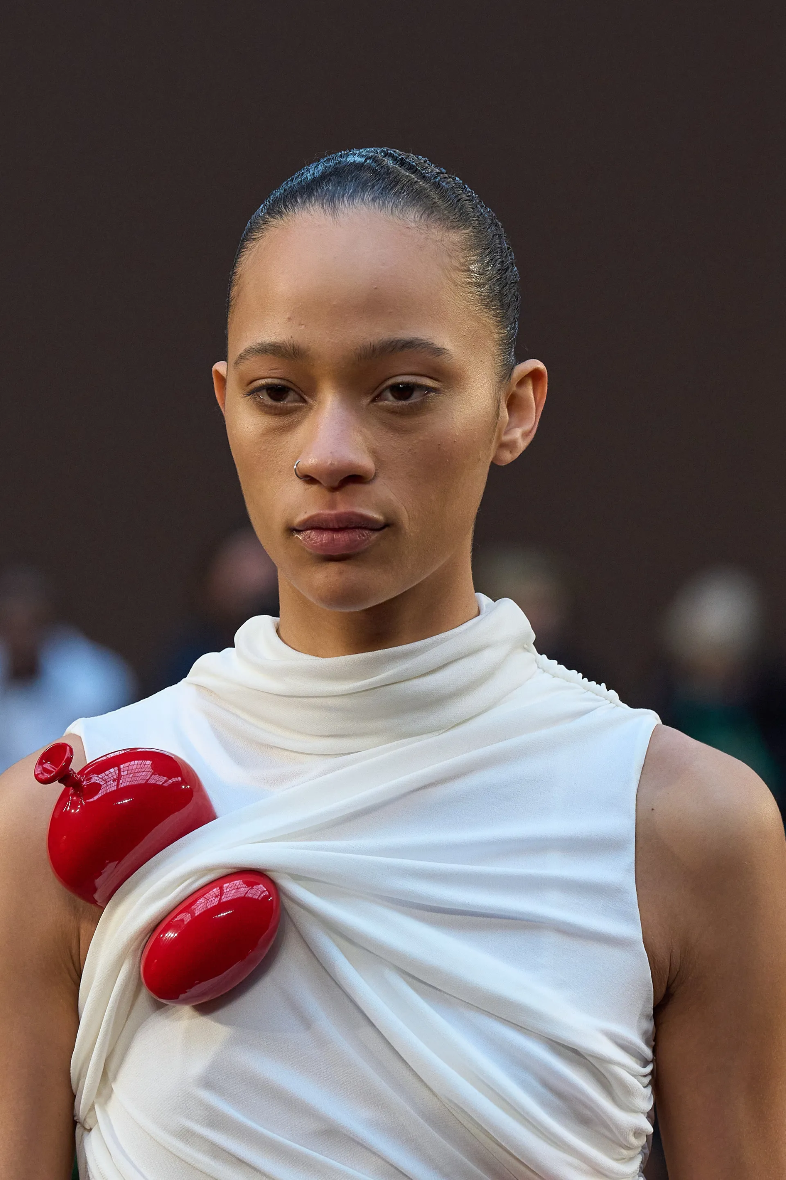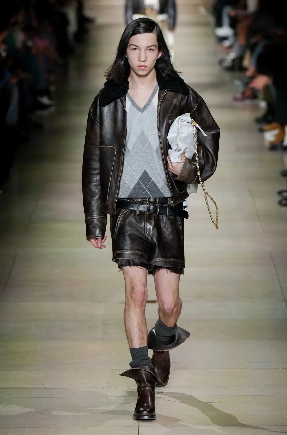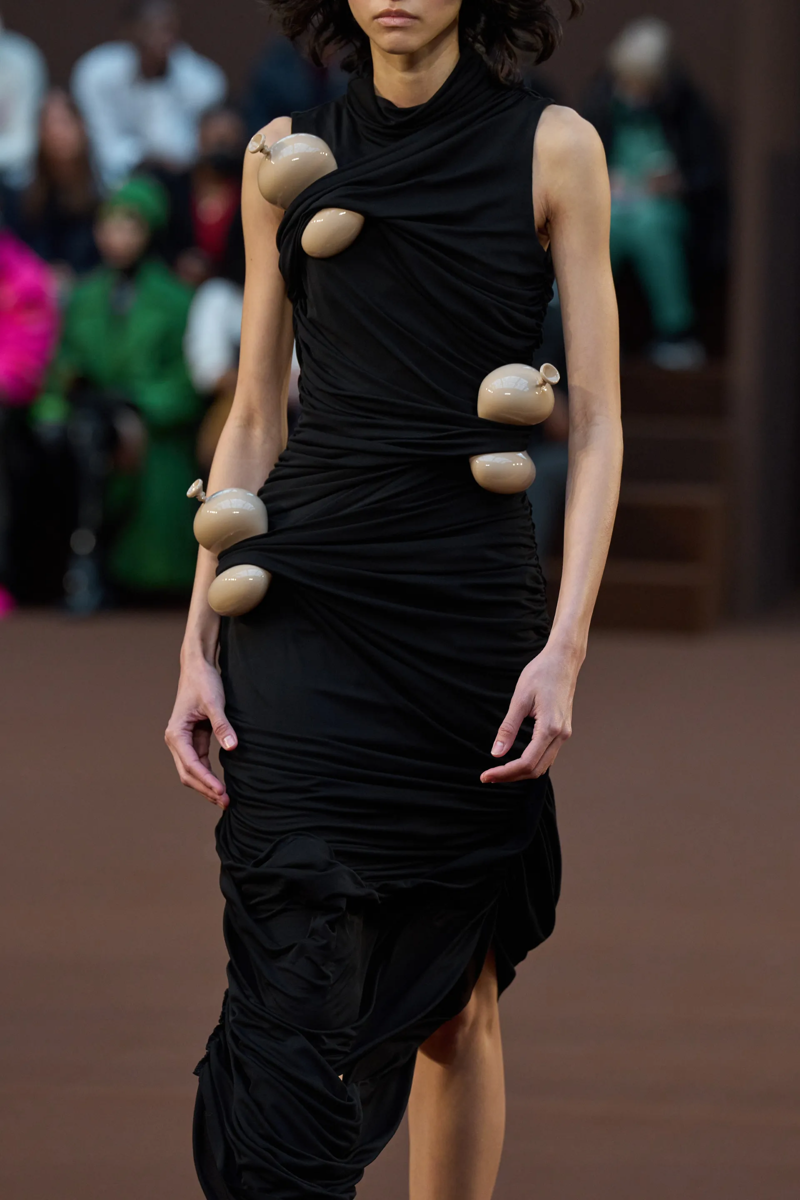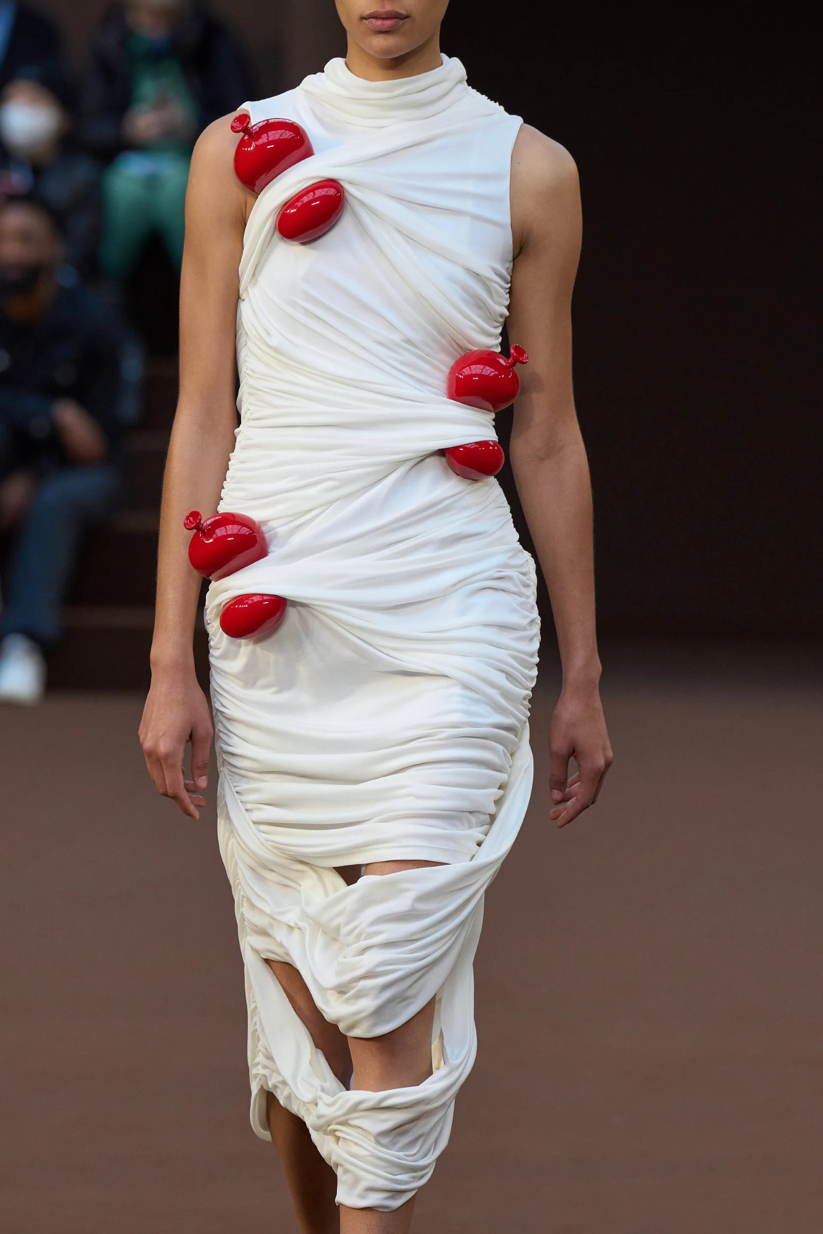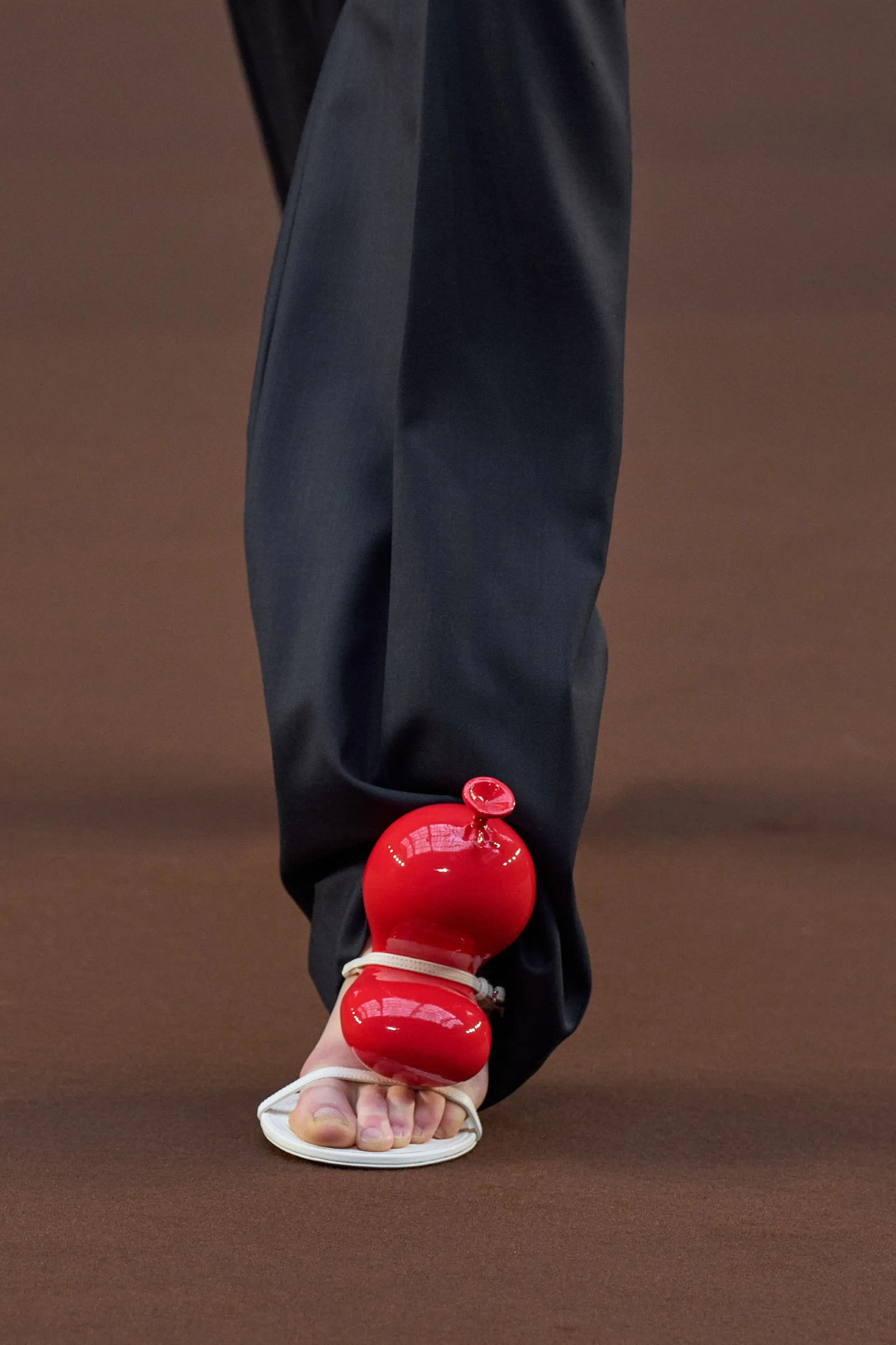 Loewe is moving towards increasingly surrealistic territories. And during this show we saw what could be the accessory of the year: a sculpted balloon that has been turned into a shoe heel or inserted as a decoration between the folds of clothing. The balloon, which is solid, appears illusionistically bent as if it were actually compressed and about to explode or fly away. We have never seen Jonathan Anderson so imaginative.