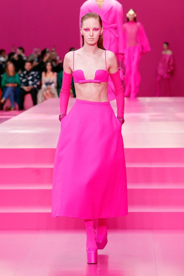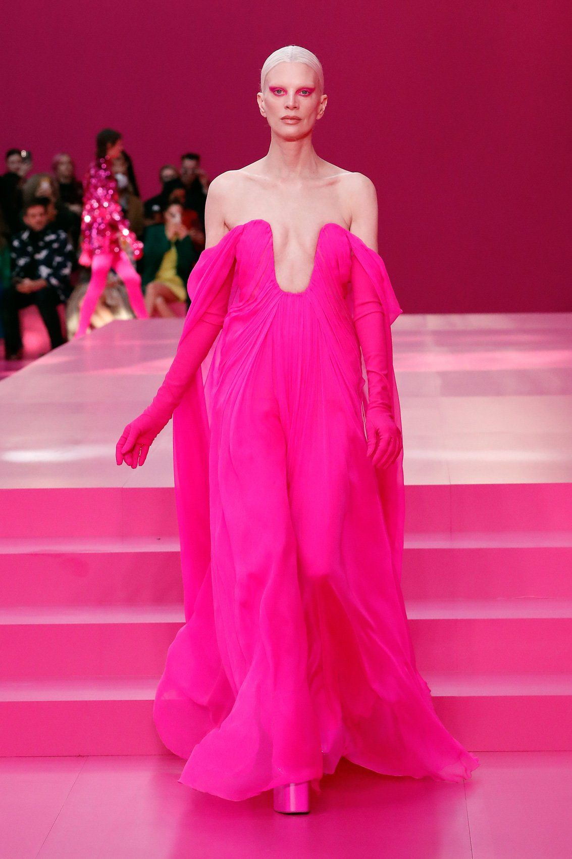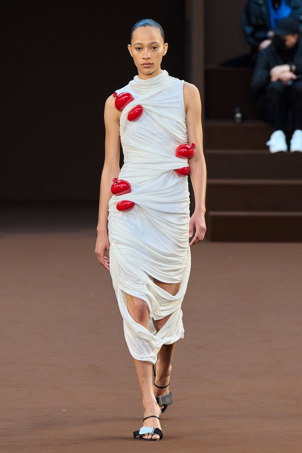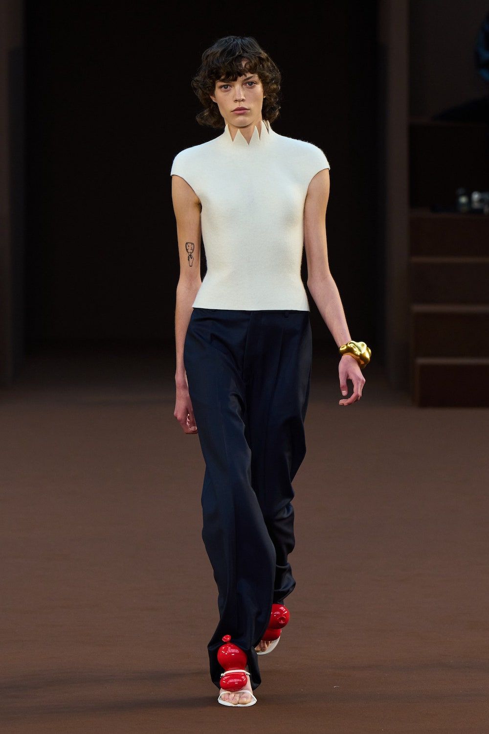However this season, there were many more designers who were taking up the challenge of interacting with the current day reality. After two years of a global pandemic and the current reality of Russia’s invasion of Ukraine, fashion houses specifically in Milan and Paris took the opportunity to engage in conversation regarding world events. The most potent and patent event was designer Demna Gvasalia’s show for Balenciaga, which paid tribute to the Ukranian people from his perspective of a Georgian refugee in Germany during the war in Abkhazia, Georgia in 1993 ; Pierpaolo Piccoli took a different approach with an entirely hot pink toned Valentino show that he considered a show of love for the Ukranian people, “We see you, we feel you, we love you because love is the answer always,” he commented in a voiceover before the show; at Hermès Nadège Vanhee-Cybulski embraced female sexuality with a collection created around the notion that, “sex is okay—it’s not something to be ashamed of"; at Loewe Jonathan Anderson explored the social tensions of today through surrealism with a collection built around the tension of a balloon, “A balloon creates tension, It will pop, it won’t last forever”; and Alessandro Michele also took a similar whimsical approach in his ideology for Gucci’s show, with a show created around the concept of mirrors potentially being both channels of who we are and who we wish to be.