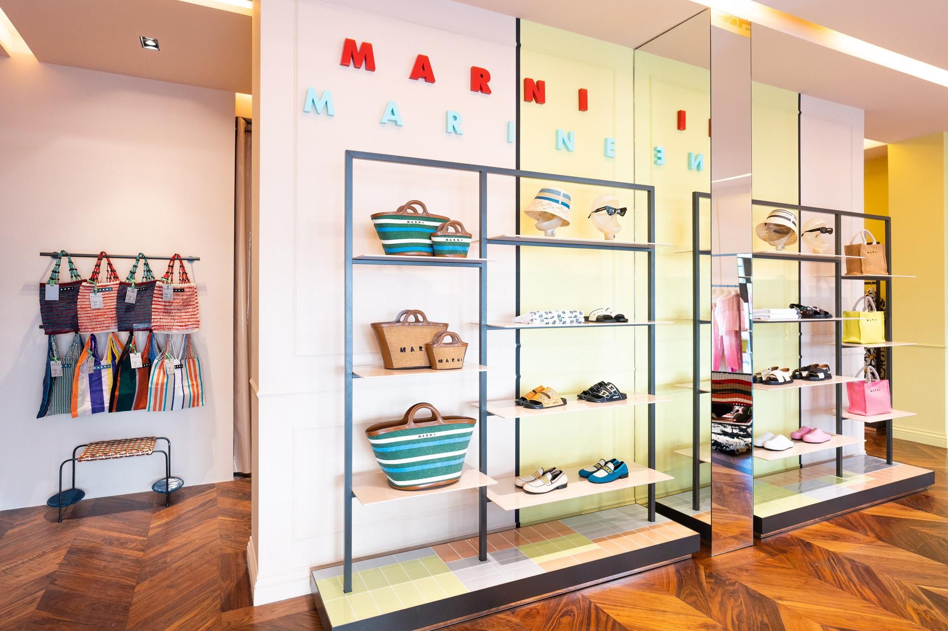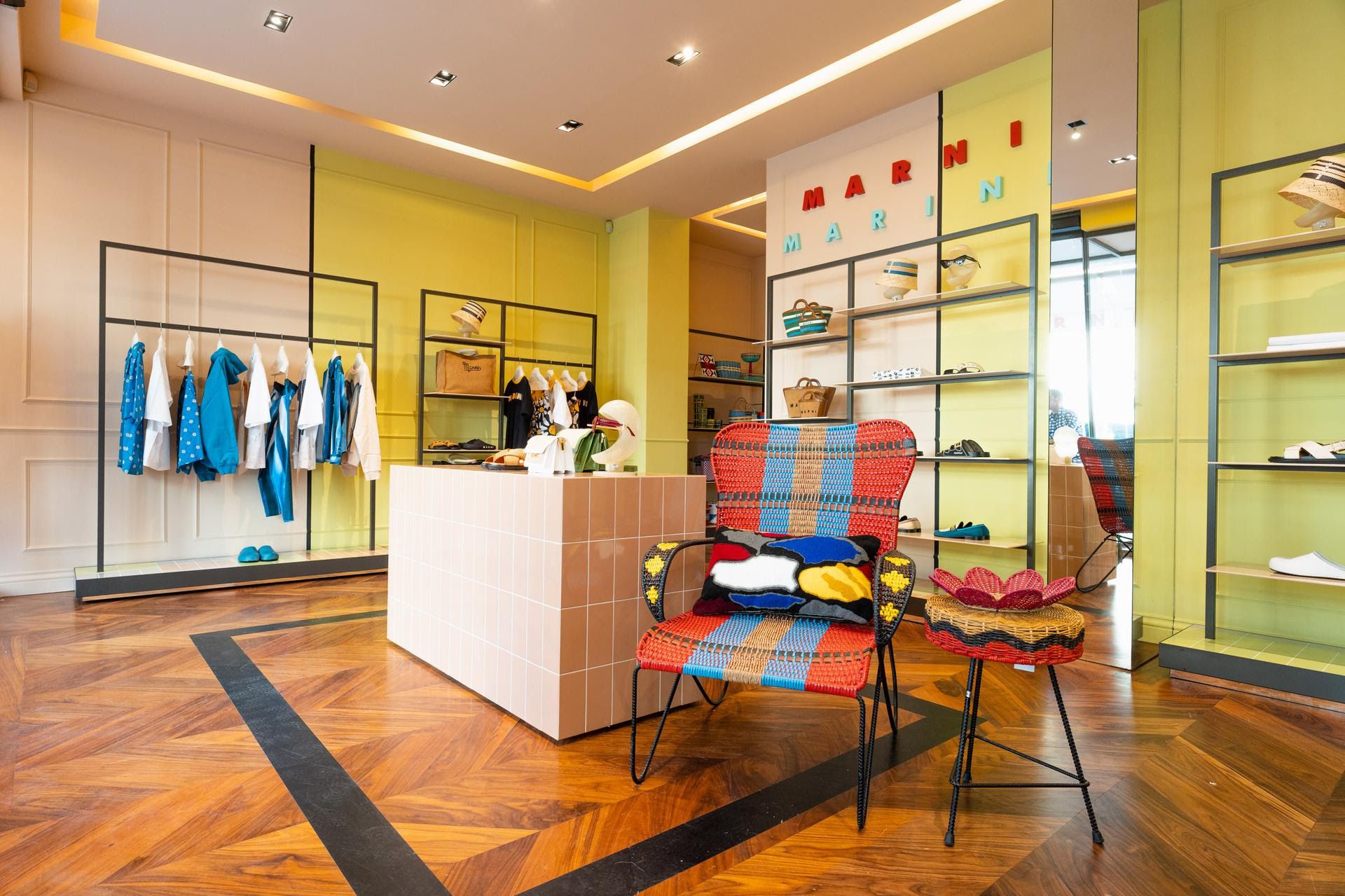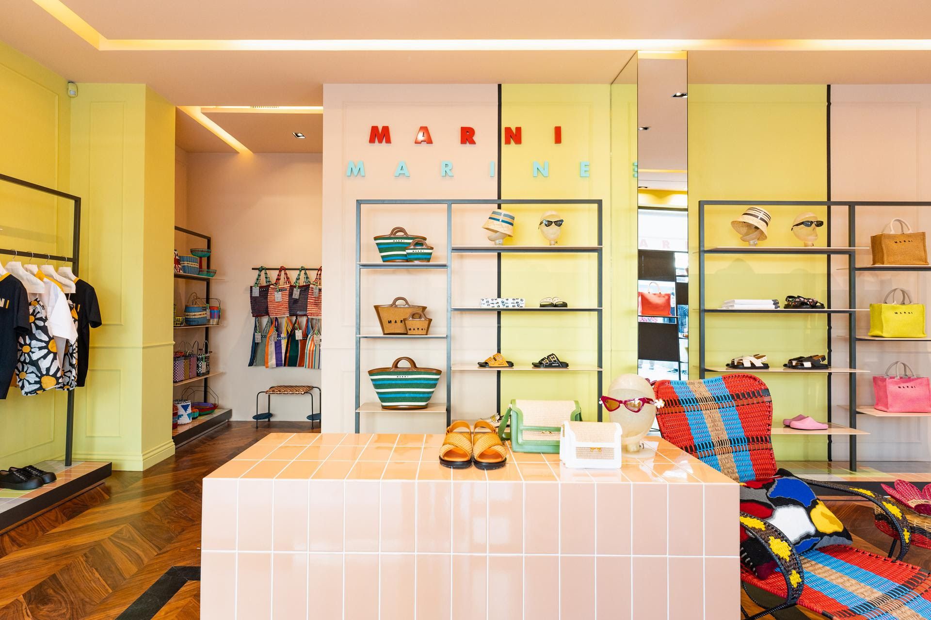 The store concept is defined, yet light, welcoming and sophisticated, for immediate interaction with and in space. Modules defined by ceramic tiles, alternate pastel shades - pink, light blue and green - for a pleasant look, surprised by the colour right from the façades, characterised by a backlit red logo. Inside, the MARNI MARINE sign further connotes the boutique, which welcomes and offers a selection of clothing and accessories in bright hues and bold patterns, alongside garish bags and Marni Market furnishing accessories, designed to bring colour into summer homes and gardens.