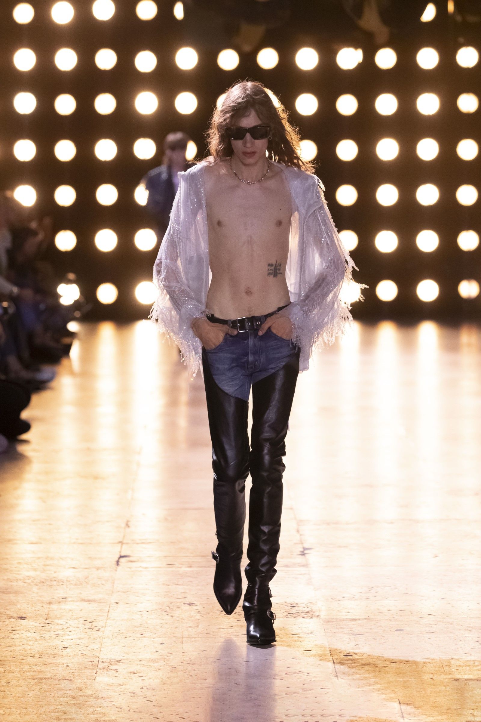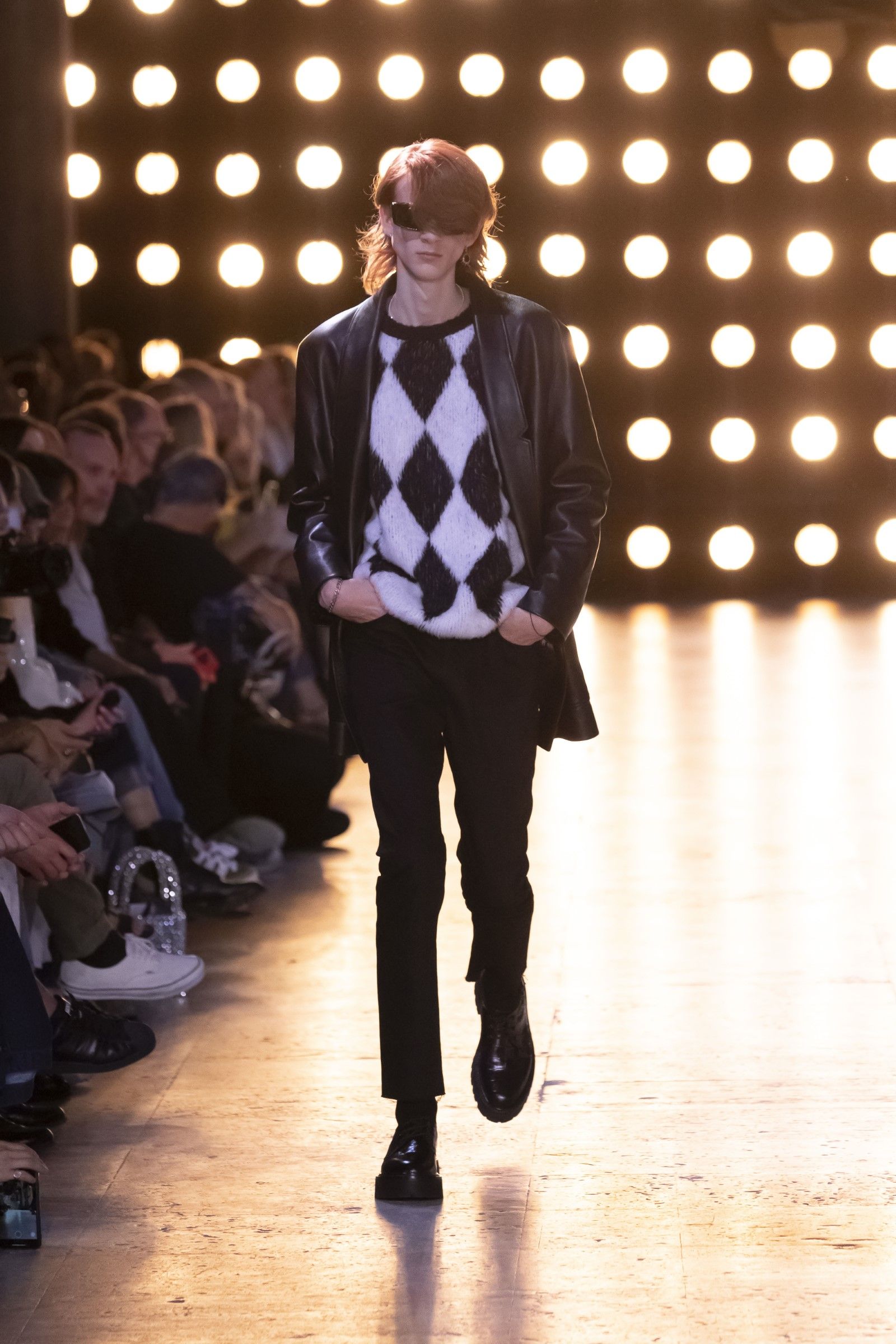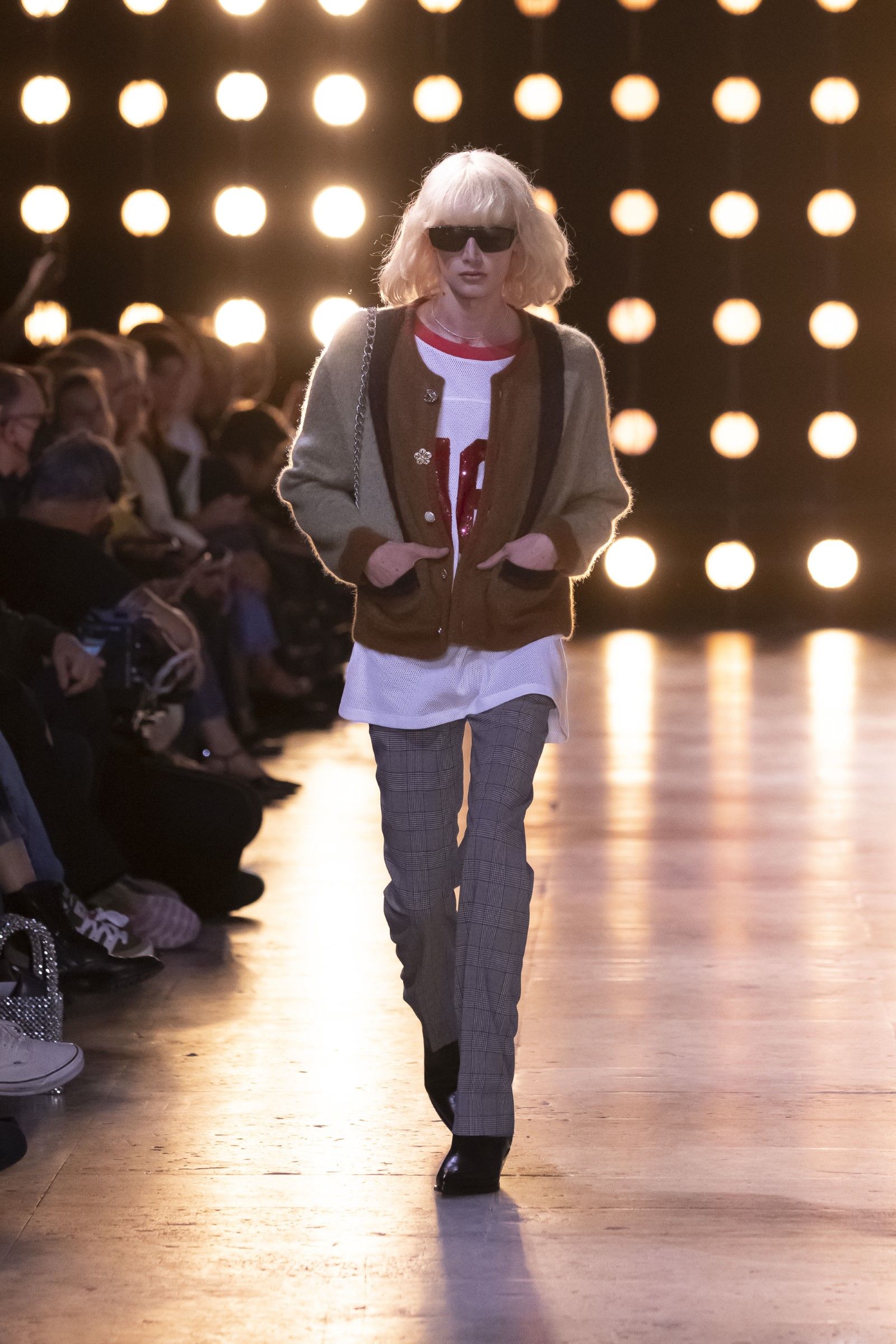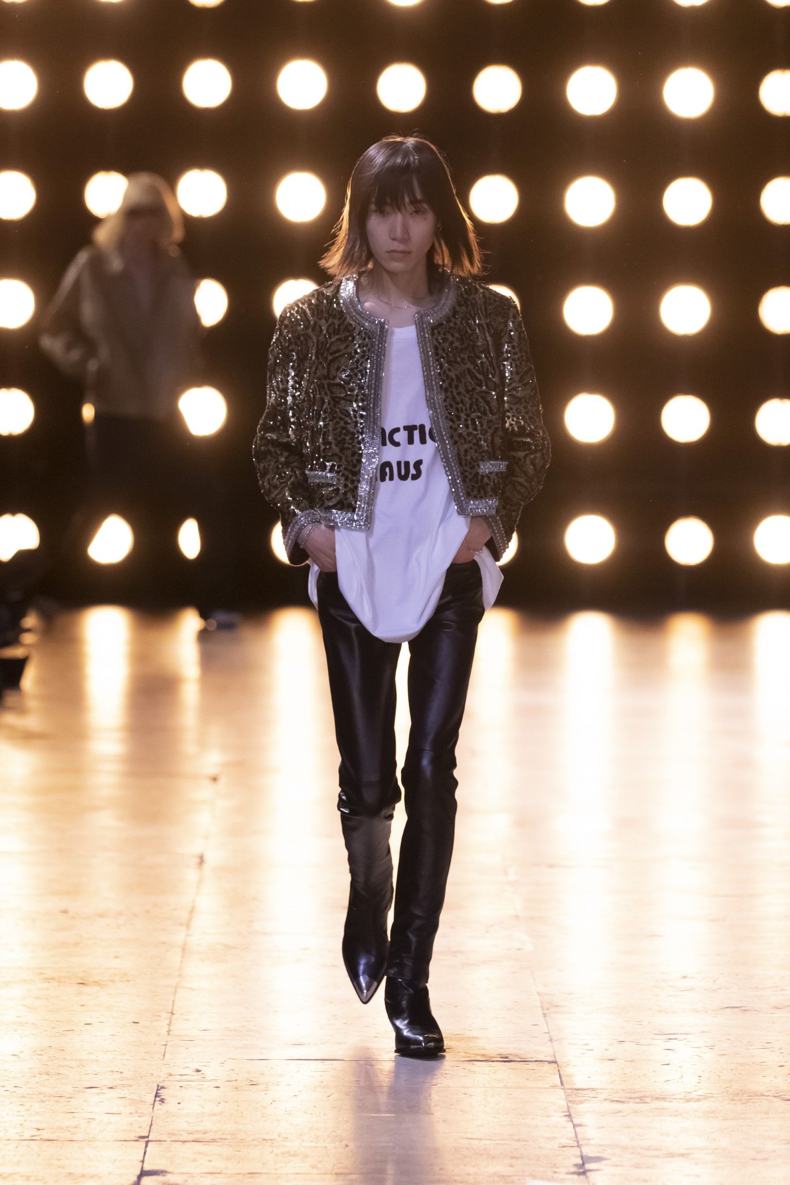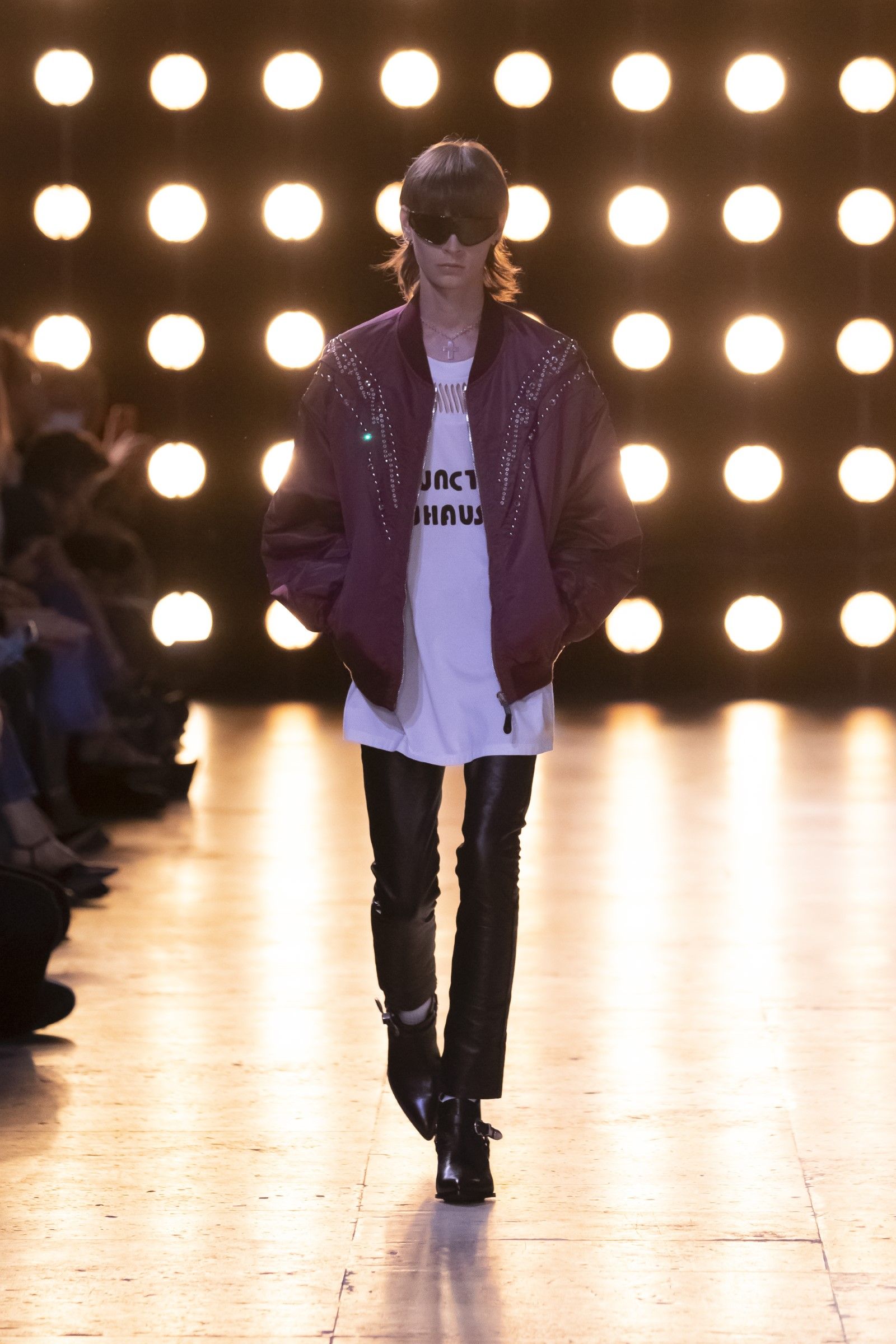 More than in other collections (and therefore even more so than in Cosmic Cruiser) androgyny and genderlessness found their way onto the runway with a series of looks that went largely beyond the re-issue of a cliché: one of the models wore a sheer-shouldered top that included a very long train that made the look look like a single evening gown, another wore a crop top under a blazer and was identical to the looks seen in the brand's women's shows, still others wore long shimmering blouses while a graphic T-shirt read I am the boy that can enjoy possibility. As if Hedi was alluding to the fact that his designs and languages do not have to do acrobatics to adapt to the times and evolutions of society but, rather, that the very tradition of subcultures from which the designer draws inspiration already contains all the seeds of social progress that now other brands strive to conquer. Slimane has been making his models wear skirts for twenty years (especially in Dior Homme's FW04 and SS07 collections), and it has always been twenty years that Slimane has been playing with ideas of youth, fragility, and the re-discussion of dominant cultural archetypes, and it was in this very show that the references to the past and to Dior Homme's shows of the early 2000s appeared. After all, Hedi was one of the most revolutionary voices in menswear in the early 2000s - and twenty years on, his language has transcended three different brands to become a grand continuing opus.