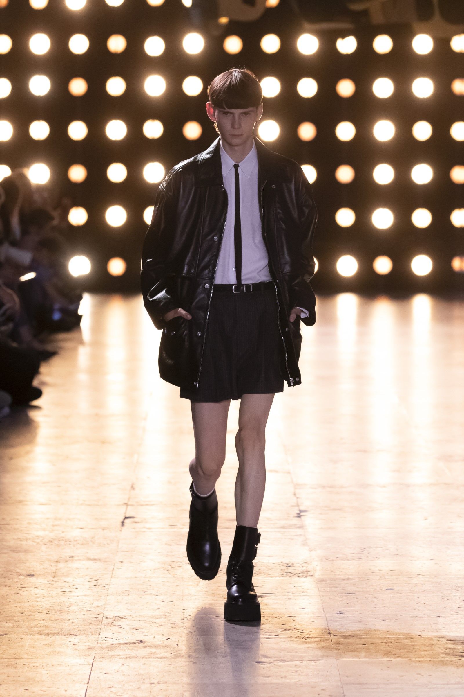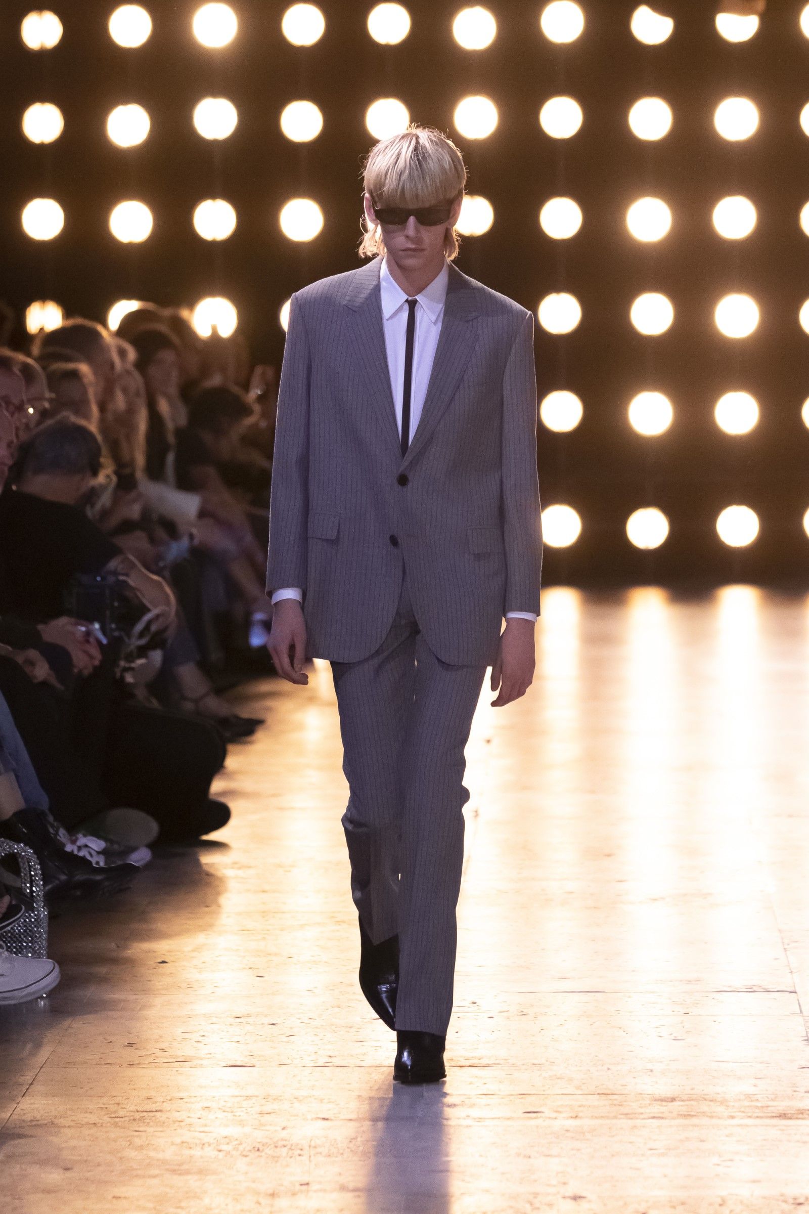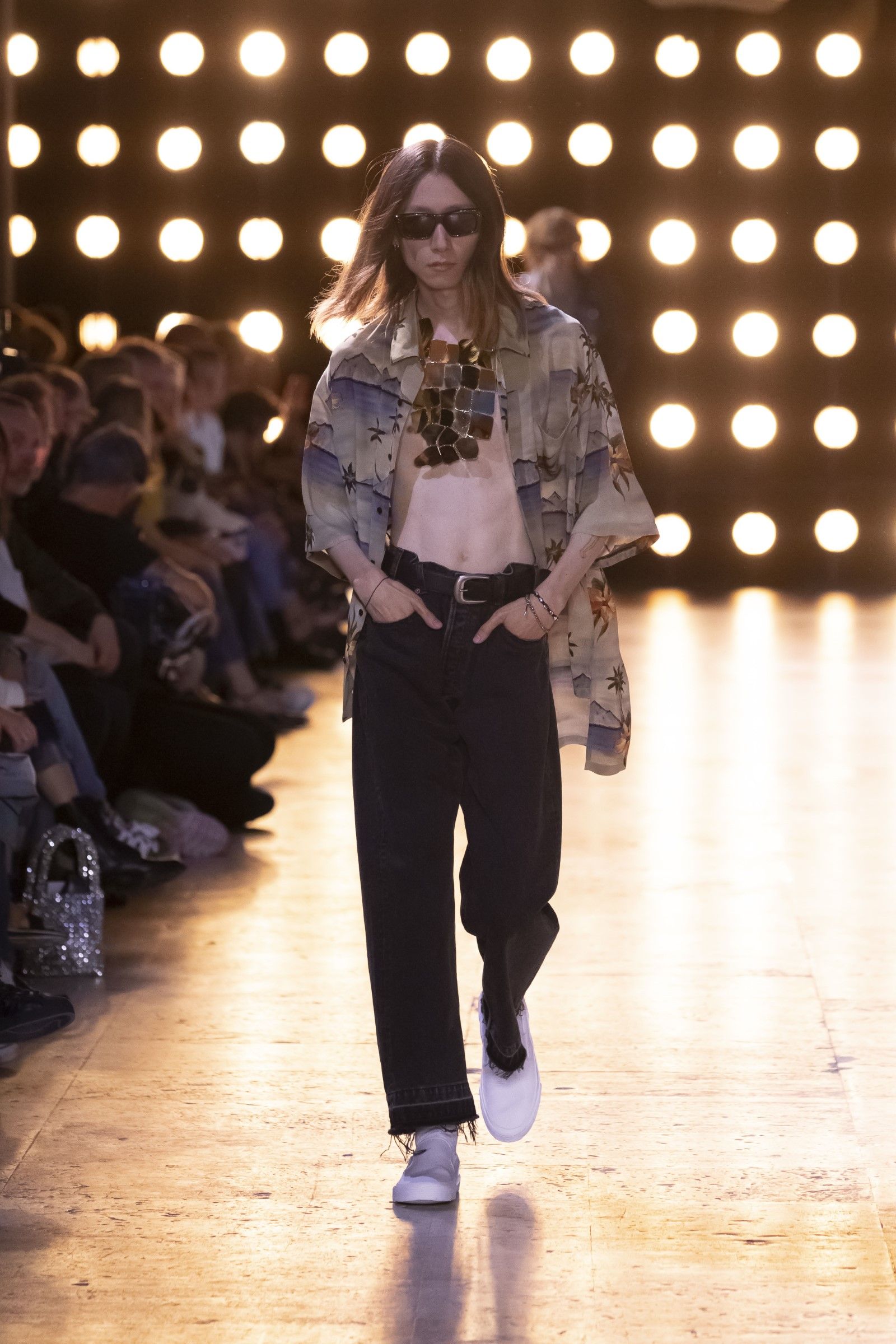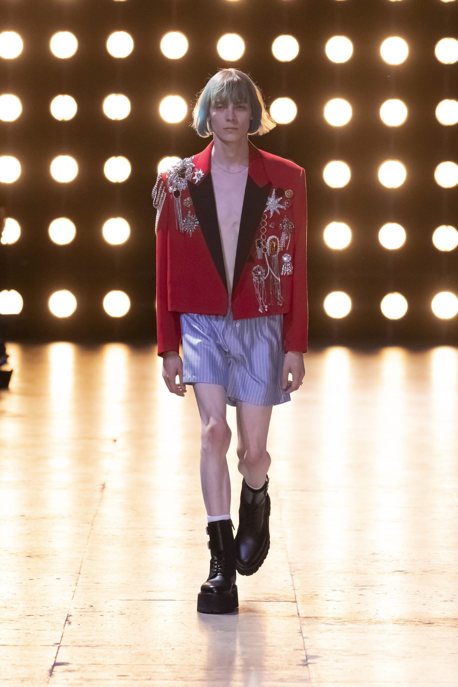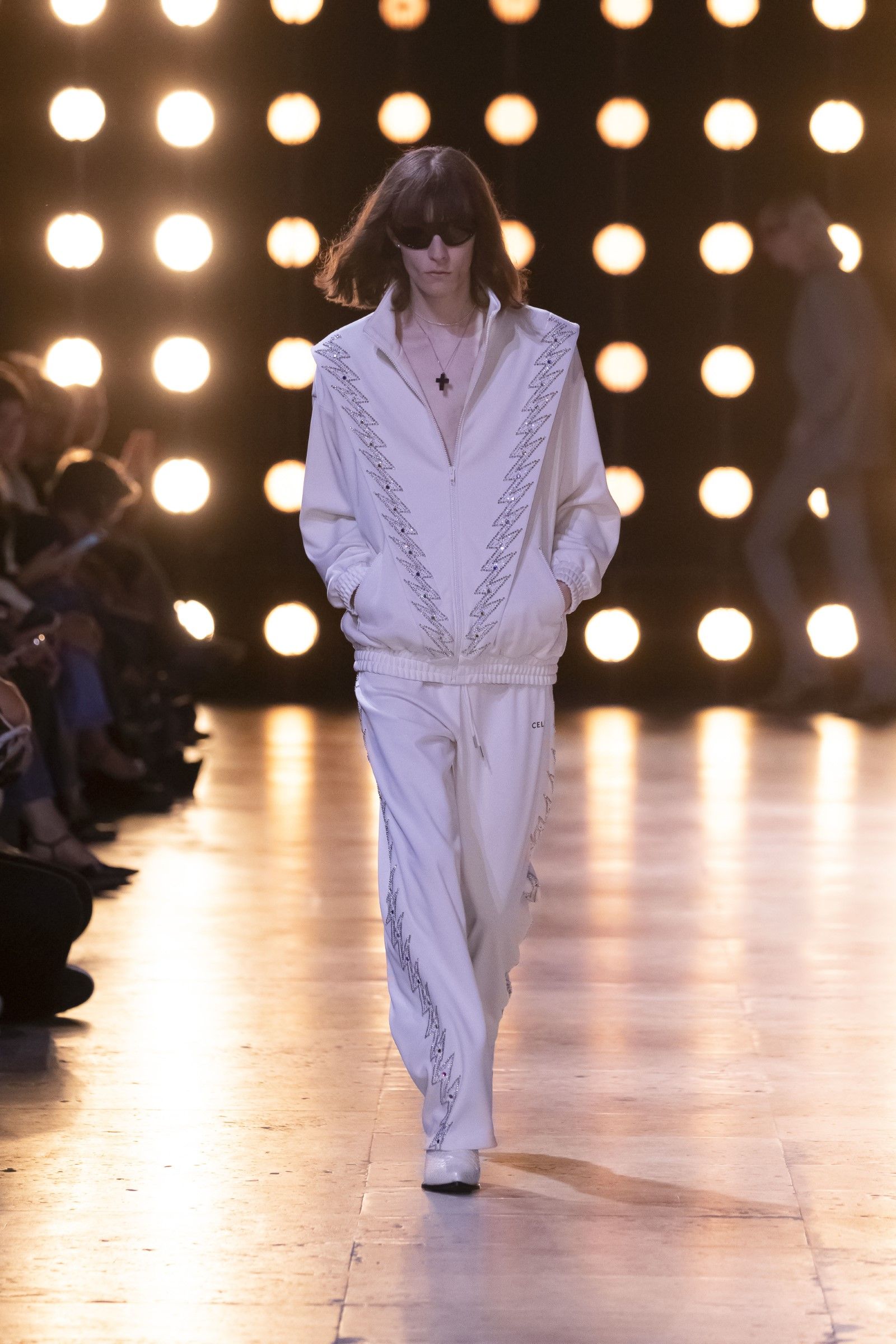 More than in other collections (and therefore even more so than in Cosmic Cruiser) androgyny and genderlessness found their way onto the runway with a series of looks that went largely beyond the re-issue of a cliché: one of the models wore a sheer-shouldered top that included a very long train that made the look look like a single evening gown, another wore a crop top under a blazer and was identical to the looks seen in the brand's women's shows, still others wore long shimmering blouses while a graphic T-shirt read I am the boy that can enjoy possibility. As if Hedi was alluding to the fact that his designs and languages do not have to do acrobatics to adapt to the times and evolutions of society but, rather, that the very tradition of subcultures from which the designer draws inspiration already contains all the seeds of social progress that now other brands strive to conquer. Slimane has been making his models wear skirts for twenty years (especially in Dior Homme's FW04 and SS07 collections), and it has always been twenty years that Slimane has been playing with ideas of youth, fragility, and the re-discussion of dominant cultural archetypes, and it was in this very show that the references to the past and to Dior Homme's shows of the early 2000s appeared. After all, Hedi was one of the most revolutionary voices in menswear in the early 2000s - and twenty years on, his language has transcended three different brands to become a grand continuing opus.