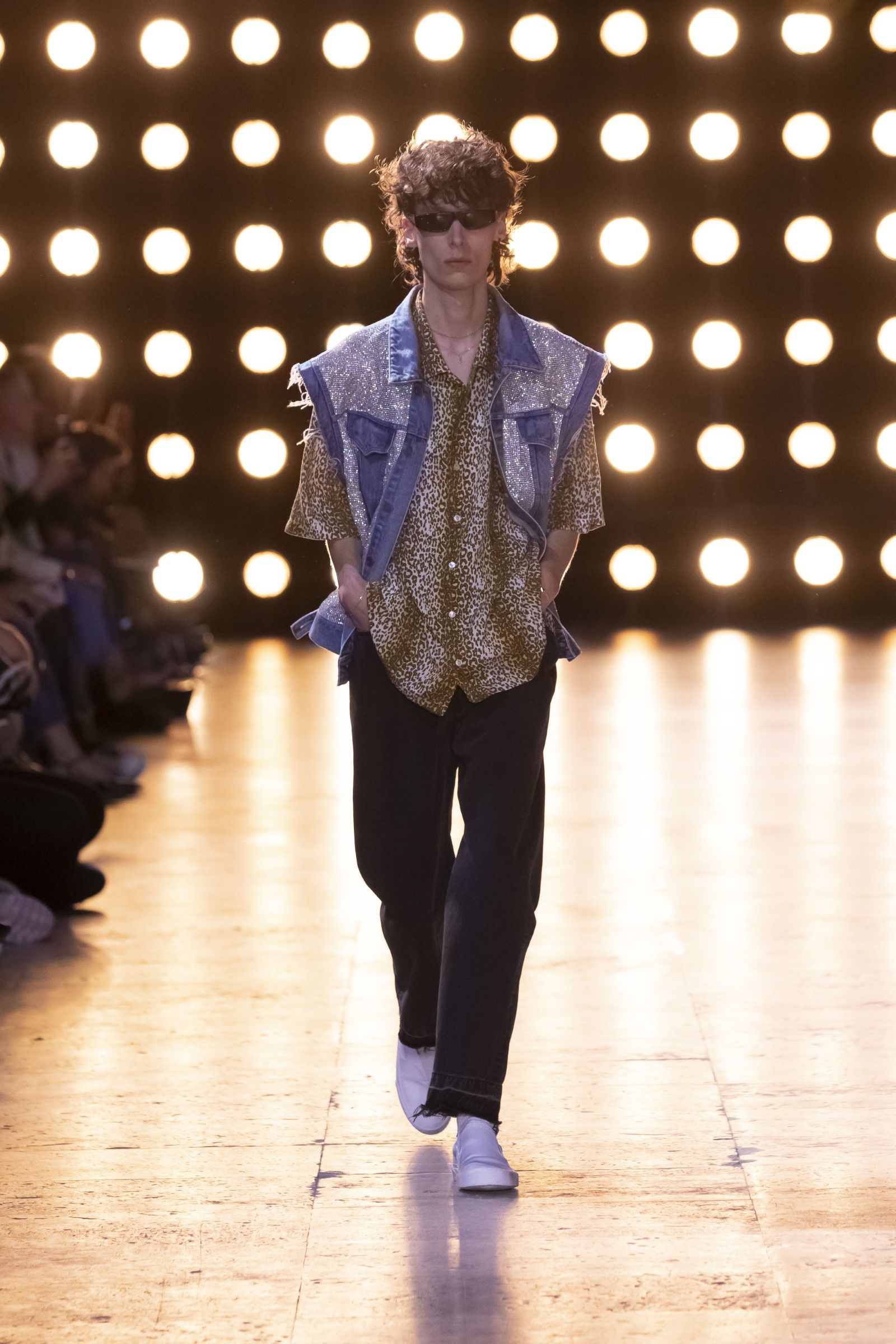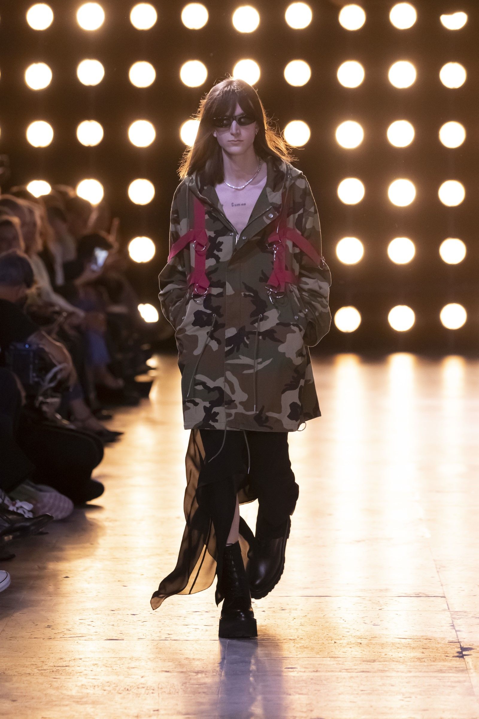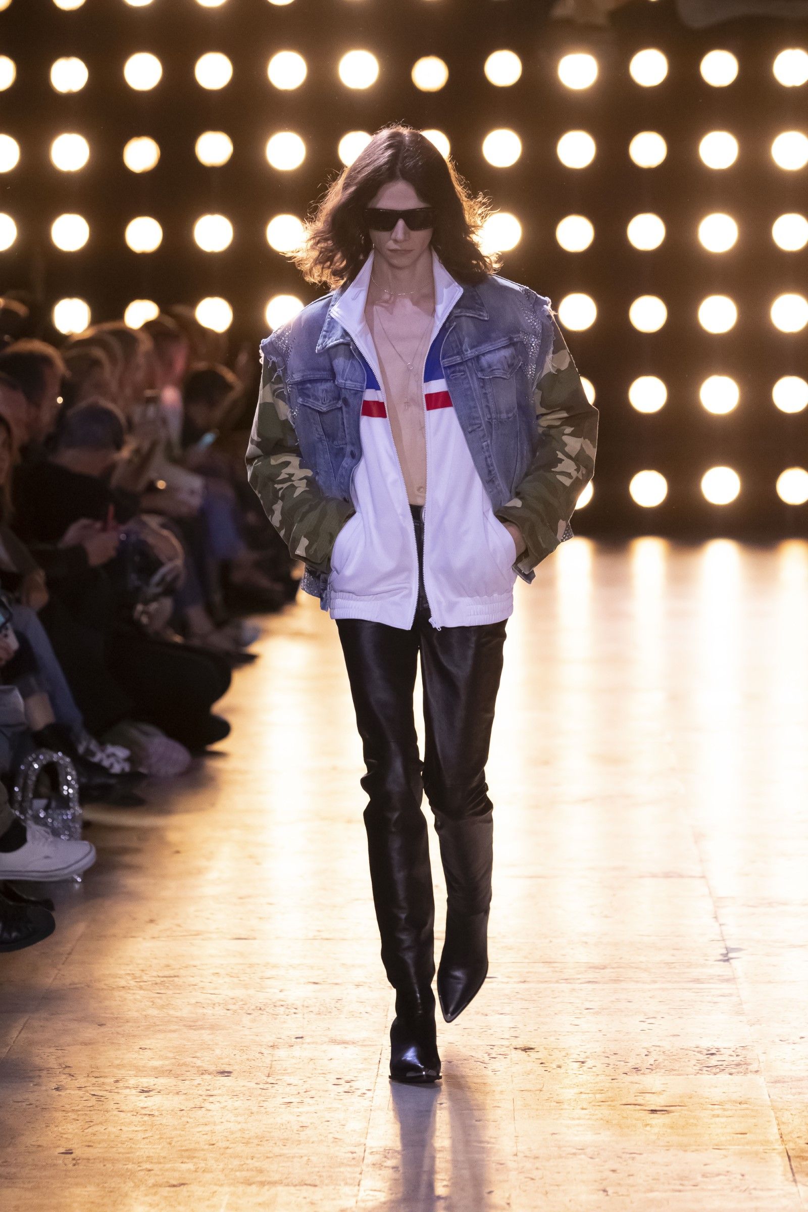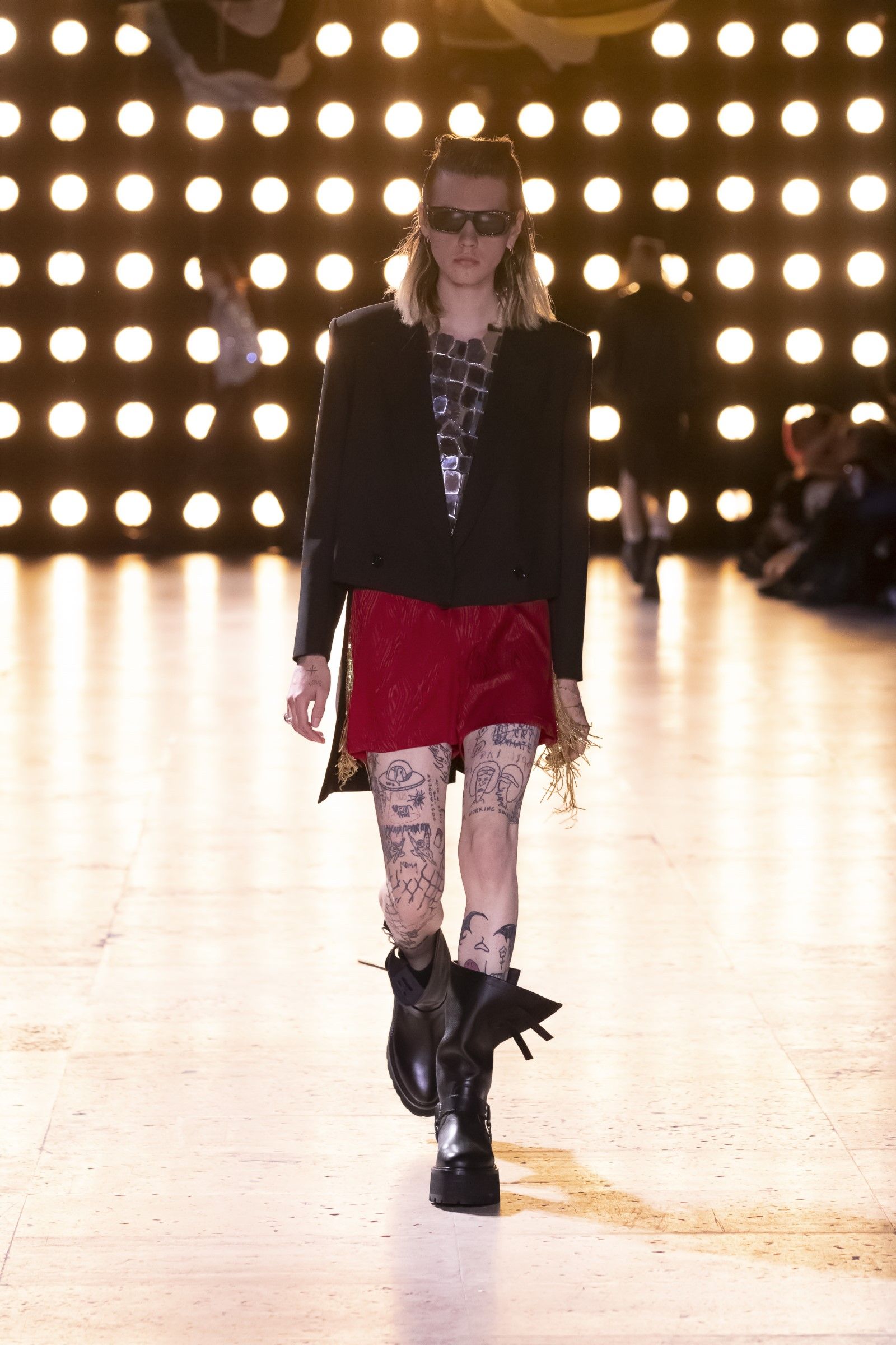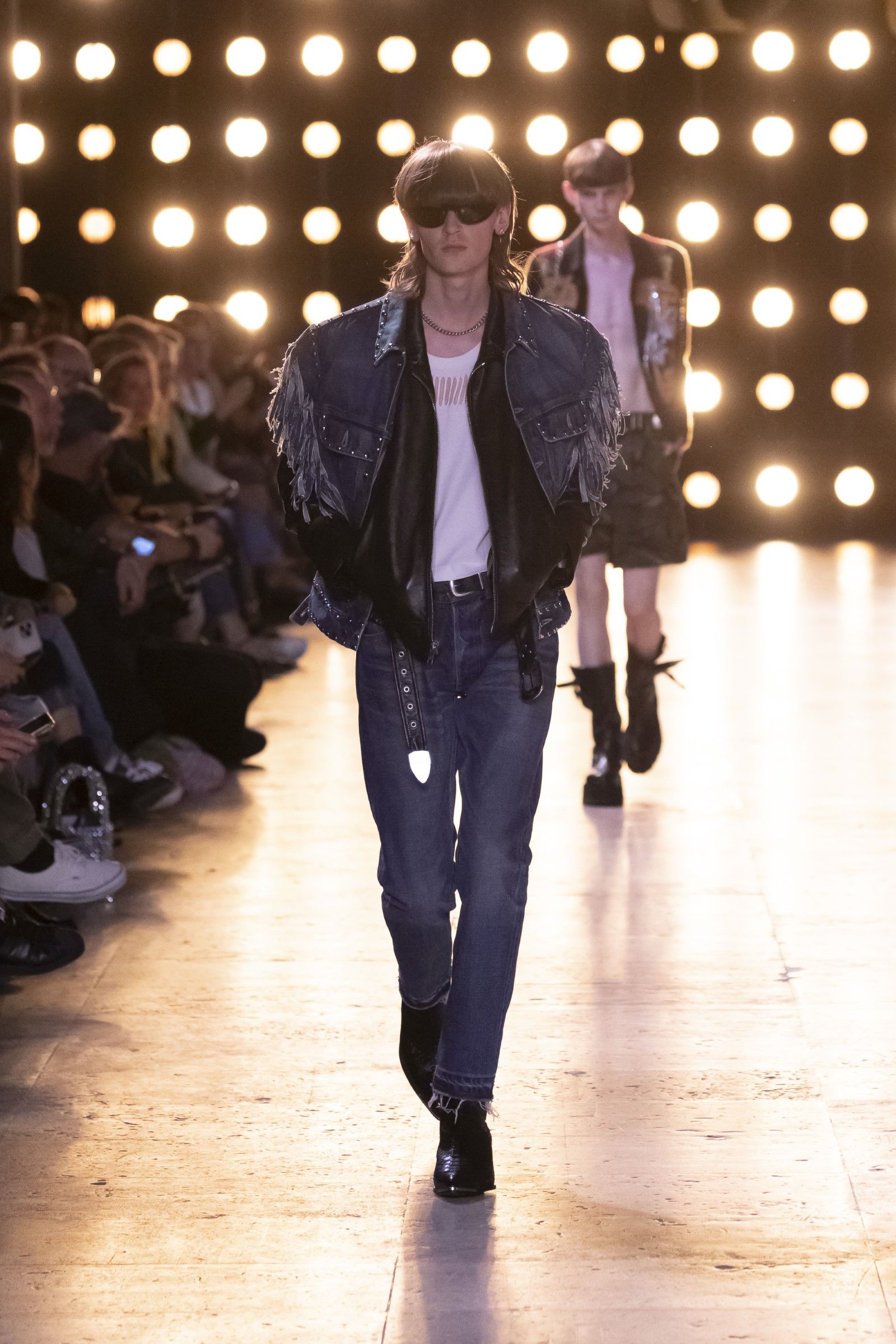 More than in other collections (and therefore even more so than in Cosmic Cruiser) androgyny and genderlessness found their way onto the runway with a series of looks that went largely beyond the re-issue of a cliché: one of the models wore a sheer-shouldered top that included a very long train that made the look look like a single evening gown, another wore a crop top under a blazer and was identical to the looks seen in the brand's women's shows, still others wore long shimmering blouses while a graphic T-shirt read I am the boy that can enjoy possibility. As if Hedi was alluding to the fact that his designs and languages do not have to do acrobatics to adapt to the times and evolutions of society but, rather, that the very tradition of subcultures from which the designer draws inspiration already contains all the seeds of social progress that now other brands strive to conquer. Slimane has been making his models wear skirts for twenty years (especially in Dior Homme's FW04 and SS07 collections), and it has always been twenty years that Slimane has been playing with ideas of youth, fragility, and the re-discussion of dominant cultural archetypes, and it was in this very show that the references to the past and to Dior Homme's shows of the early 2000s appeared. After all, Hedi was one of the most revolutionary voices in menswear in the early 2000s - and twenty years on, his language has transcended three different brands to become a grand continuing opus.