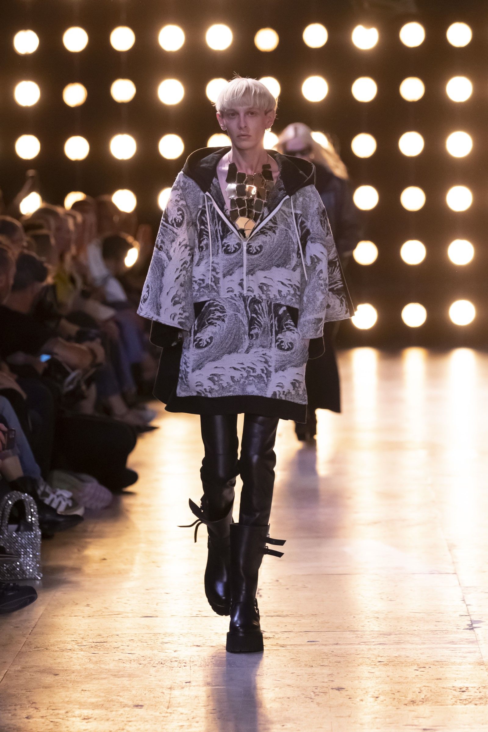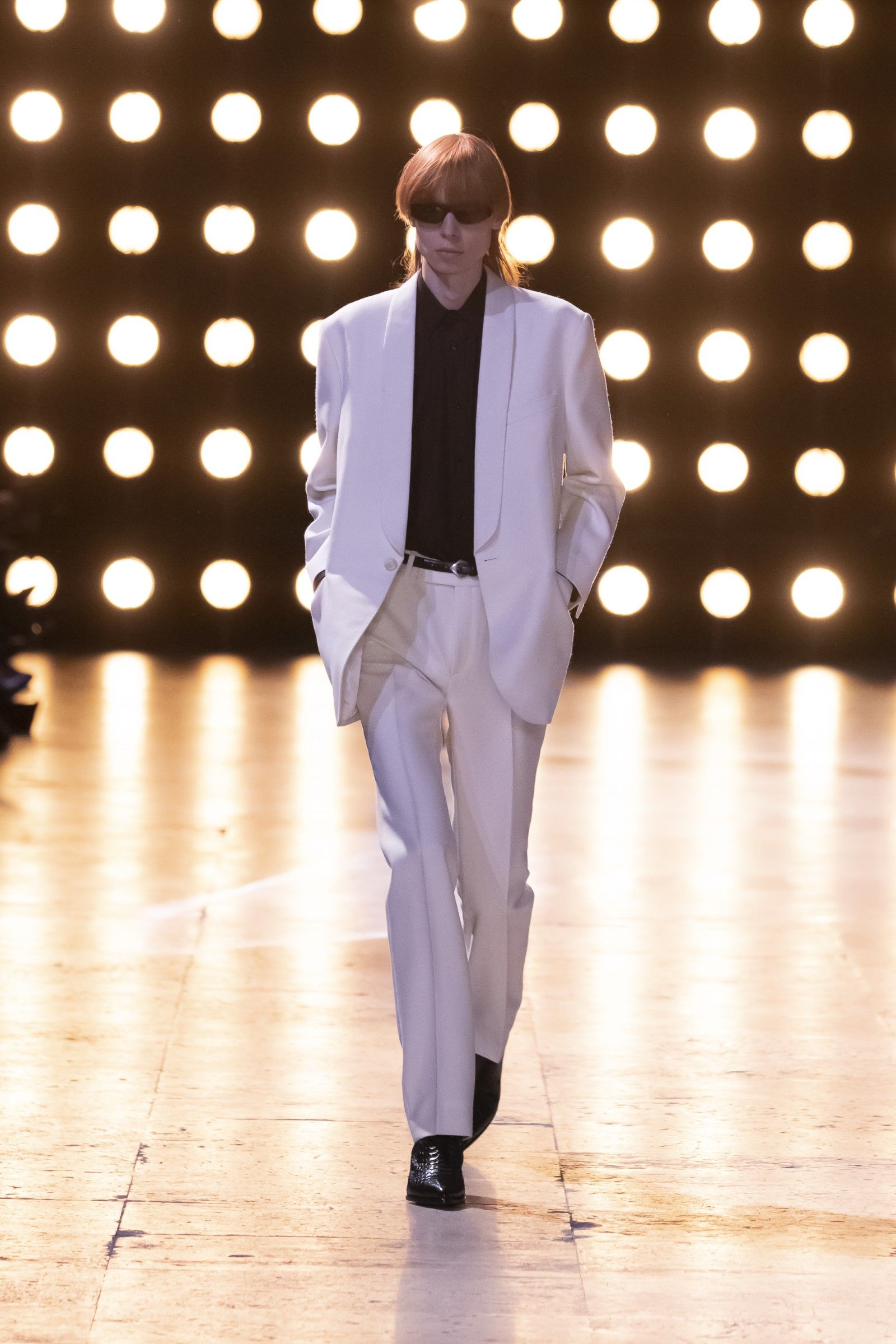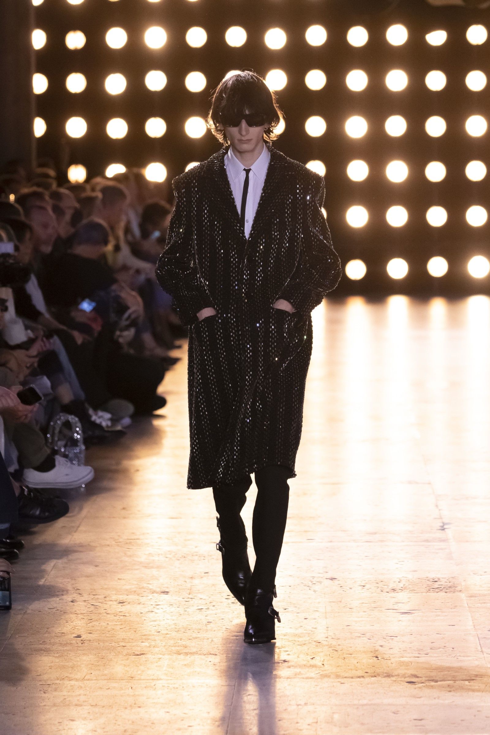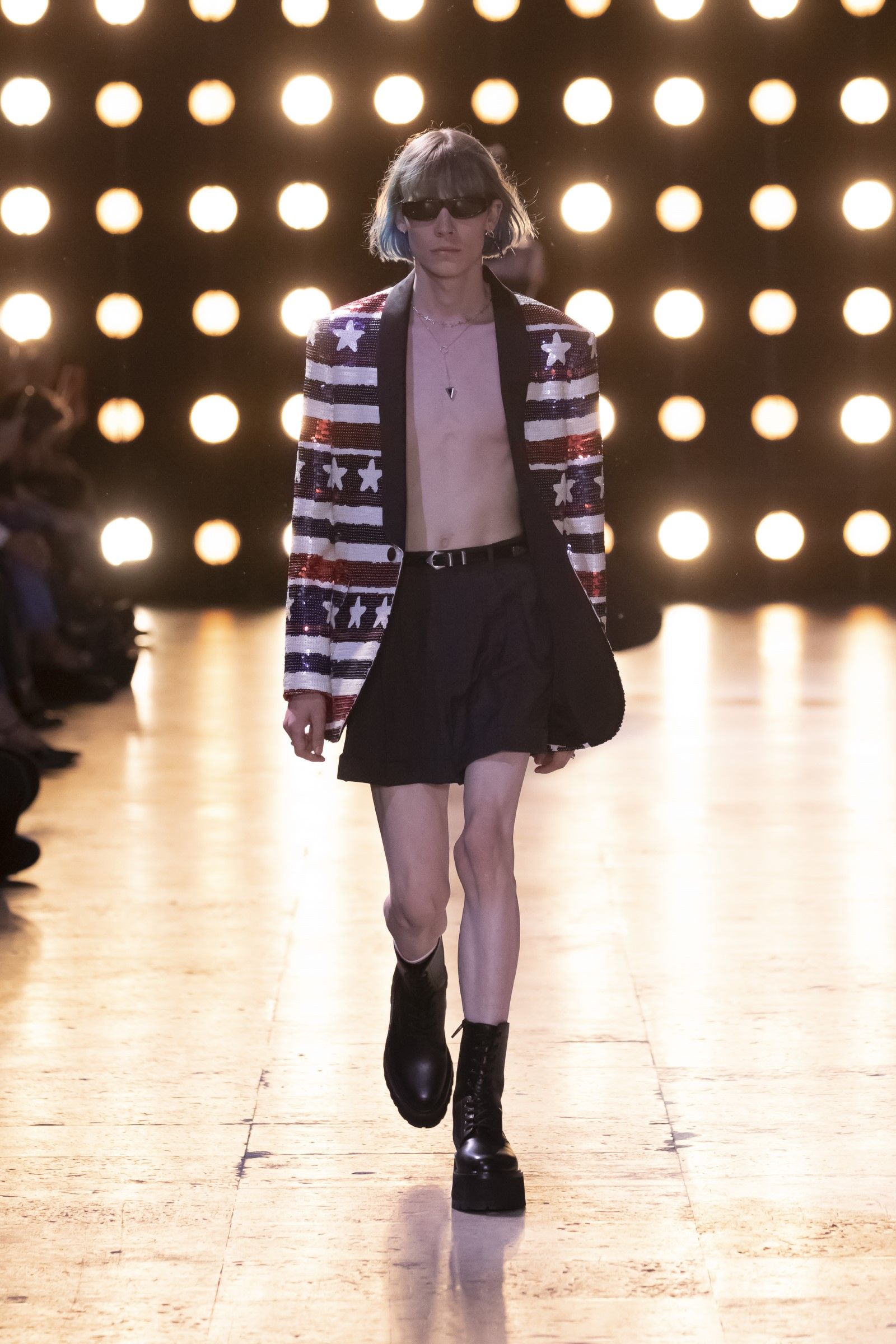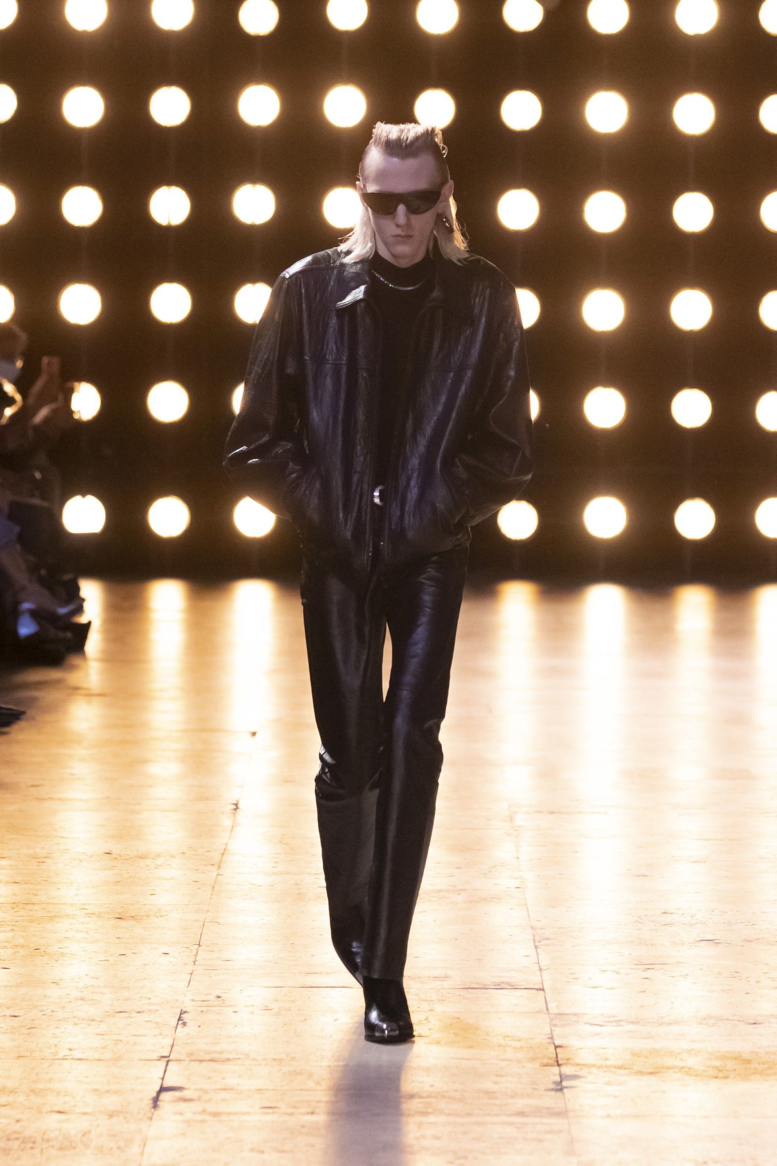 More than in other collections (and therefore even more so than in Cosmic Cruiser) androgyny and genderlessness found their way onto the runway with a series of looks that went largely beyond the re-issue of a cliché: one of the models wore a sheer-shouldered top that included a very long train that made the look look like a single evening gown, another wore a crop top under a blazer and was identical to the looks seen in the brand's women's shows, still others wore long shimmering blouses while a graphic T-shirt read I am the boy that can enjoy possibility. As if Hedi was alluding to the fact that his designs and languages do not have to do acrobatics to adapt to the times and evolutions of society but, rather, that the very tradition of subcultures from which the designer draws inspiration already contains all the seeds of social progress that now other brands strive to conquer. Slimane has been making his models wear skirts for twenty years (especially in Dior Homme's FW04 and SS07 collections), and it has always been twenty years that Slimane has been playing with ideas of youth, fragility, and the re-discussion of dominant cultural archetypes, and it was in this very show that the references to the past and to Dior Homme's shows of the early 2000s appeared. After all, Hedi was one of the most revolutionary voices in menswear in the early 2000s - and twenty years on, his language has transcended three different brands to become a grand continuing opus.