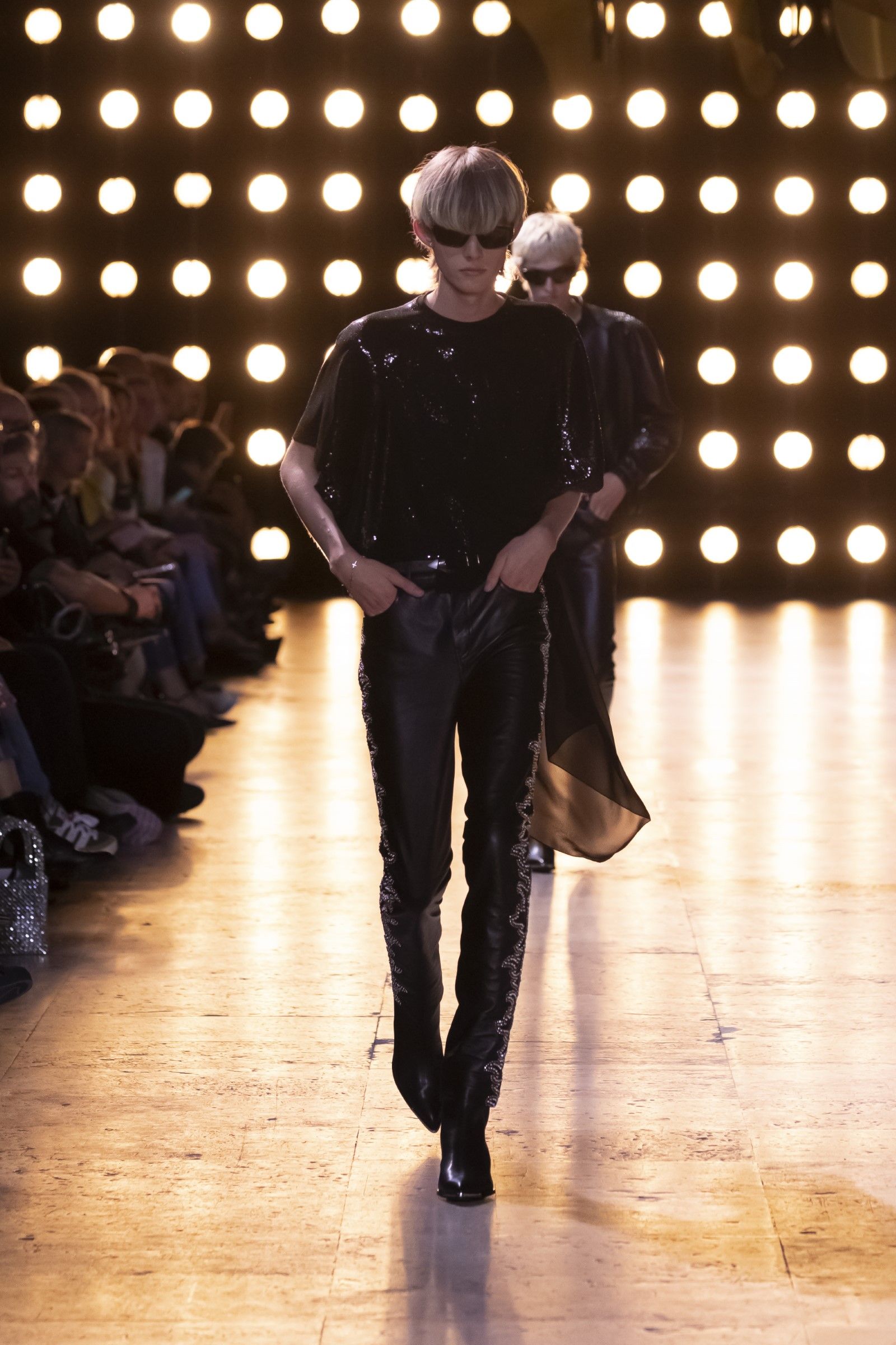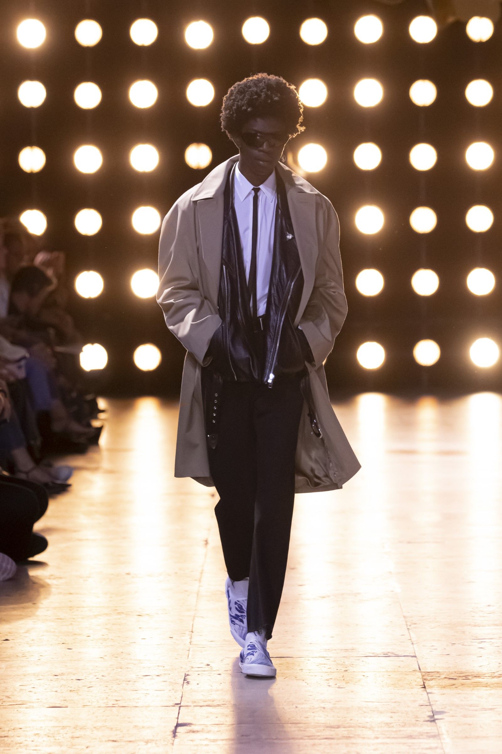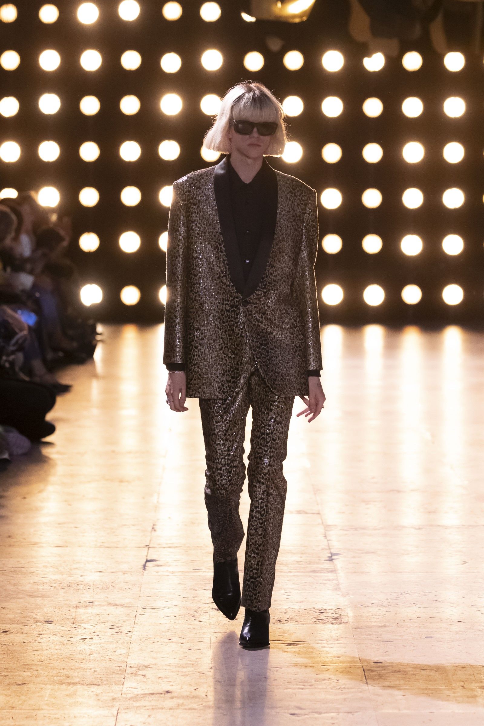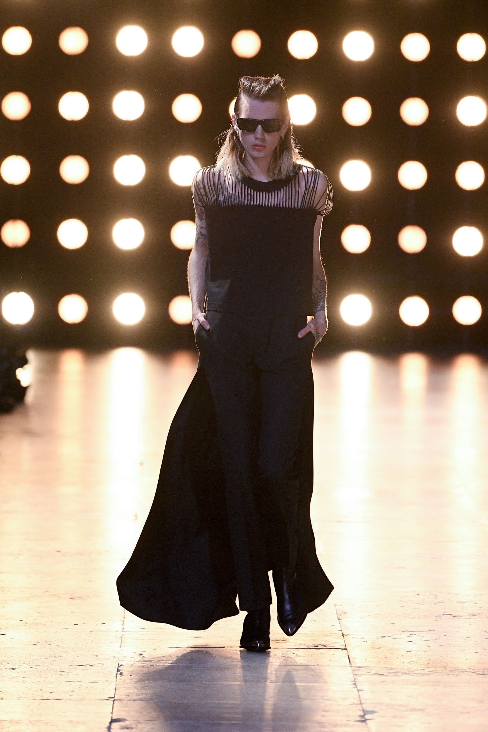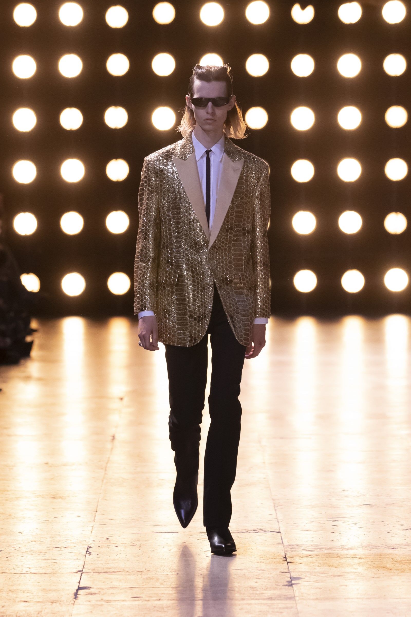 More than in other collections (and therefore even more so than in Cosmic Cruiser) androgyny and genderlessness found their way onto the runway with a series of looks that went largely beyond the re-issue of a cliché: one of the models wore a sheer-shouldered top that included a very long train that made the look look like a single evening gown, another wore a crop top under a blazer and was identical to the looks seen in the brand's women's shows, still others wore long shimmering blouses while a graphic T-shirt read I am the boy that can enjoy possibility. As if Hedi was alluding to the fact that his designs and languages do not have to do acrobatics to adapt to the times and evolutions of society but, rather, that the very tradition of subcultures from which the designer draws inspiration already contains all the seeds of social progress that now other brands strive to conquer. Slimane has been making his models wear skirts for twenty years (especially in Dior Homme's FW04 and SS07 collections), and it has always been twenty years that Slimane has been playing with ideas of youth, fragility, and the re-discussion of dominant cultural archetypes, and it was in this very show that the references to the past and to Dior Homme's shows of the early 2000s appeared. After all, Hedi was one of the most revolutionary voices in menswear in the early 2000s - and twenty years on, his language has transcended three different brands to become a grand continuing opus.
