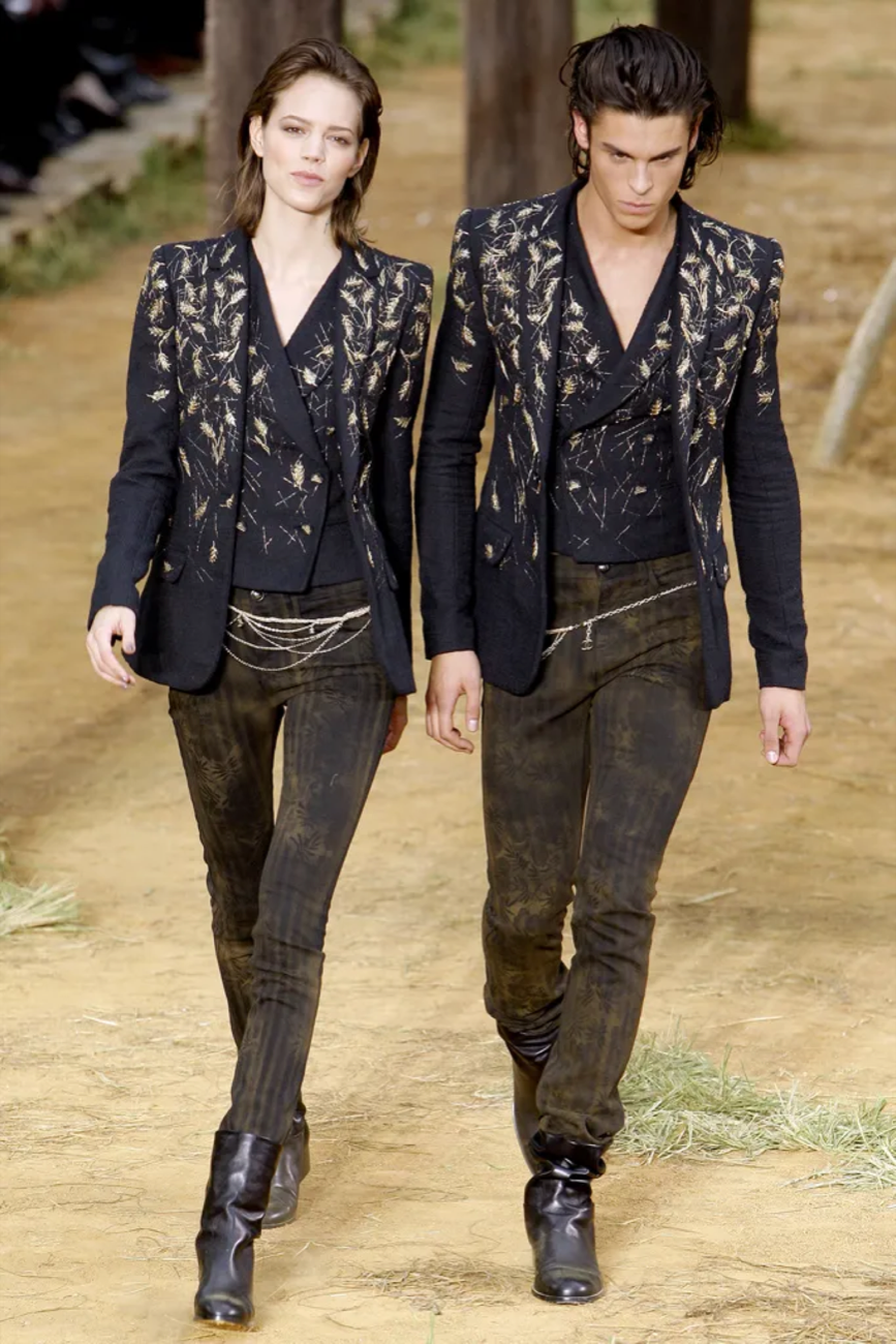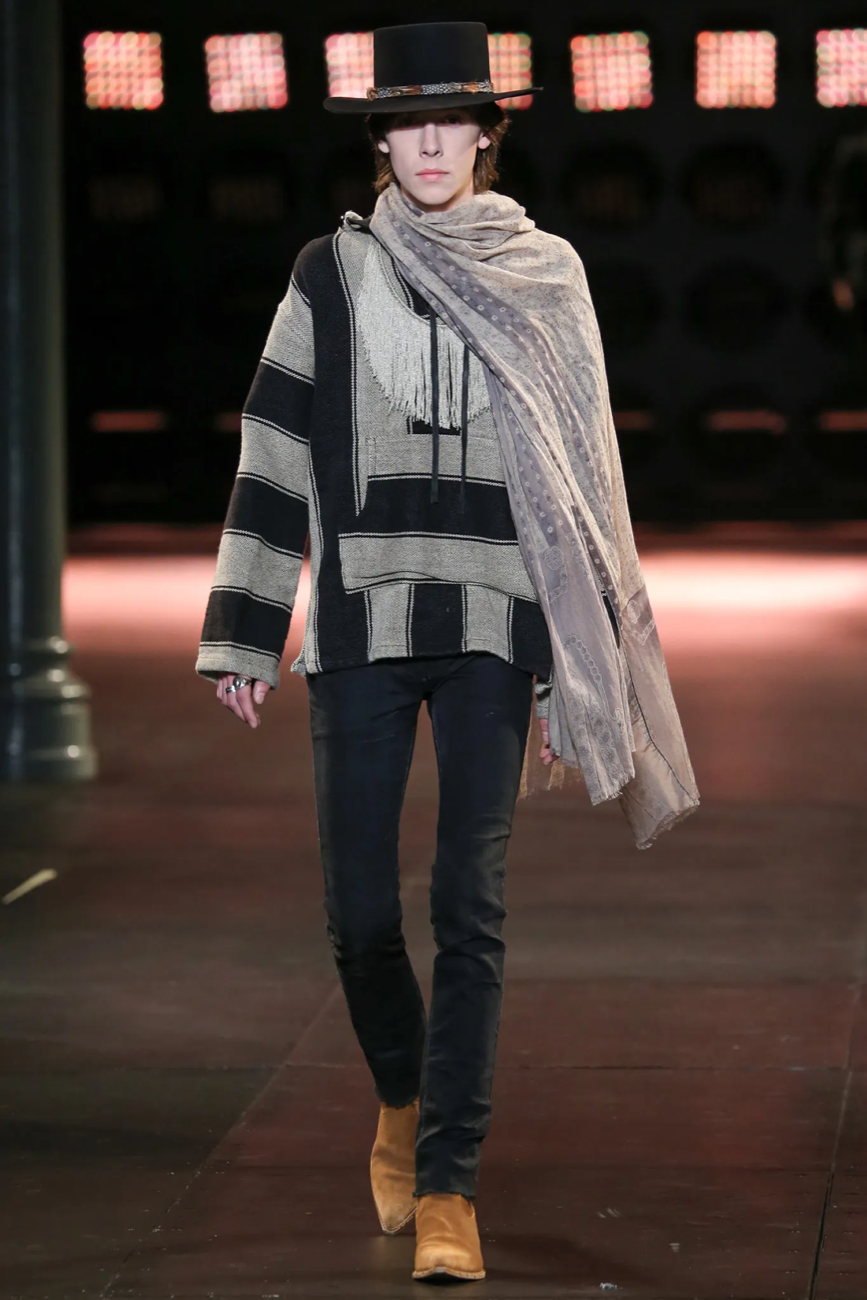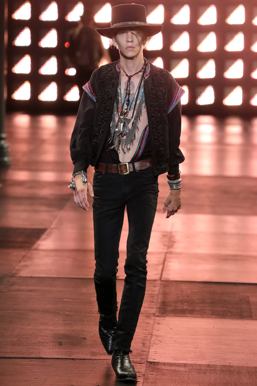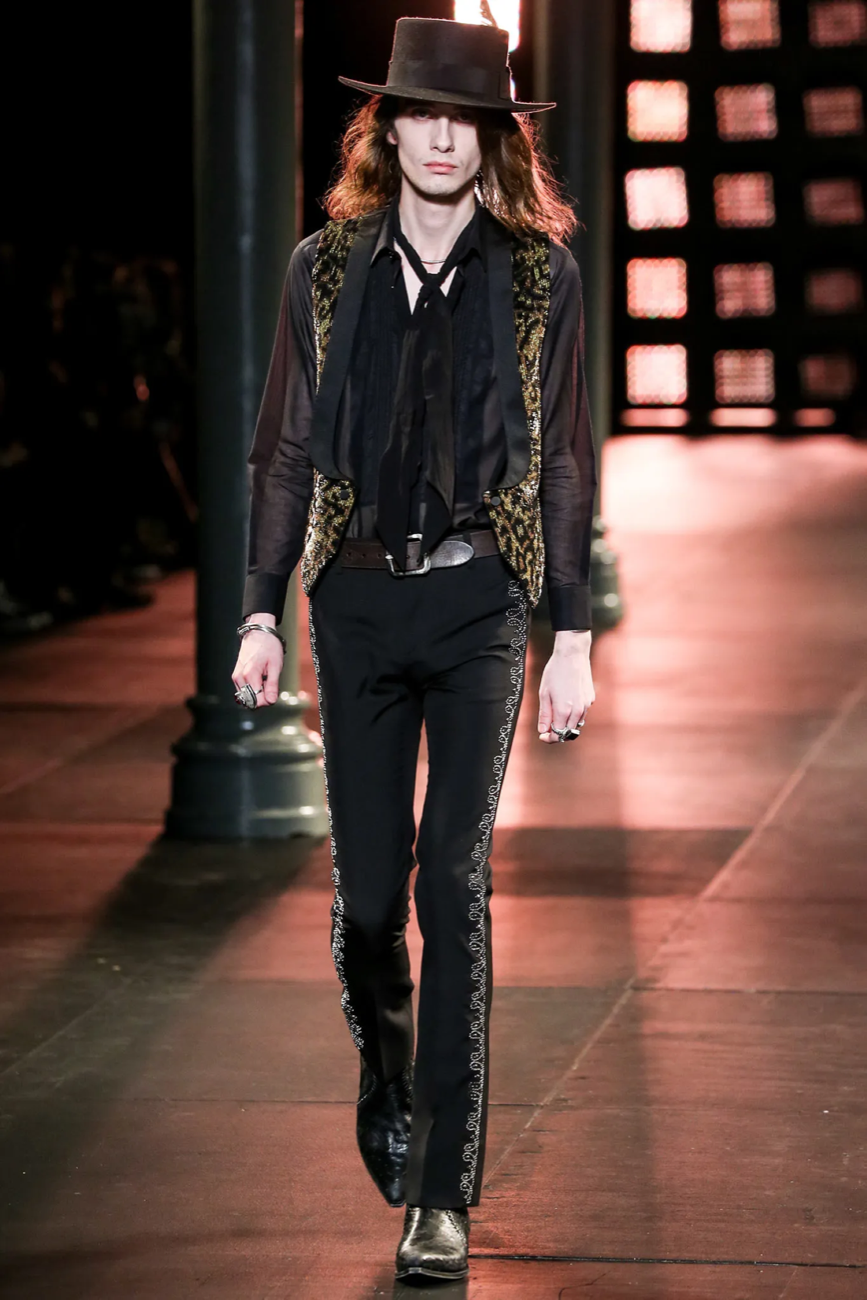 His revolutionary stylistic work generated a unique and unrepeatable language that permanently grafted the codes of Western aesthetics into the language of contemporary menswear, exporting it from its original American fashion culture and romanticizing the connections it had with surfing, rock, and in general with that imagery of reinvented masculinity typical of Slimane's work on subcultures. The Wyatt boot, for example, was not a huge novelty in itself but it had the merit of condensing together Western culture and mod and rock suggestions by taking the sole and heel typical of cowboy boots and grafting them onto the classic English Chelsea Boot - thus Slimane convinced hundreds of thousands of men to wear heels without even realizing it. And if the cowboy boot redesigned for Celine, the model is called Jacno, remained present until Celine's last Paris fashion show, three of Slimane's most emblematic collections stand out in Saint Laurent's SS15, with leathers, amulets and fine fabrics elevating the cowboy style to an unmatched concept of luxury.