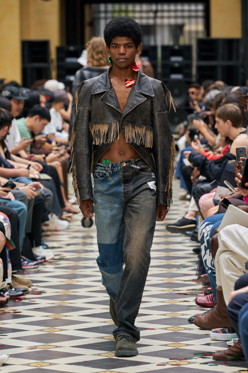 We also witnessed all this during the men's catwalks of the last fashion weeks, where the country trend manifested itself through garments and accessories that broke away from the idea of the classic cattleman and approached a fluid and precious context, much closer to Ken's outfits. First and foremost were the chaps, short for "chaperreras," the gauchos' overpants that, from the mid-1970s onward, became one of the main accessories of the leather and BDSM subculture, as well as a key symbol of sexual liberation. From the "Gay Rodeos" of the 1980s to the lace chaps worn by Prince in '91, indeed, the step was short. Elevated to the utmost power by Jean Paul Gaultier, chaps today were the stars of Thom Browne's latest fashion show, in their highly erotic denim version, but also in the psychedelic ranch at SS23 in Casablanca, edged with bucolic-taste embroidery and paired with matador outfits. A taboo accessory with a controversial history thus returns to lay down the law on the fashion system's most admired runways, annihilating the ridiculing prejudices that for decades have encircled the cowboy aesthetic. And although transgression, in fashion terms, now seems to have speculated in every imaginable context, the figure of the outlaw cowboy will forever remain a bewitching style proposition, an emblem of rebellion and nonconformist style.