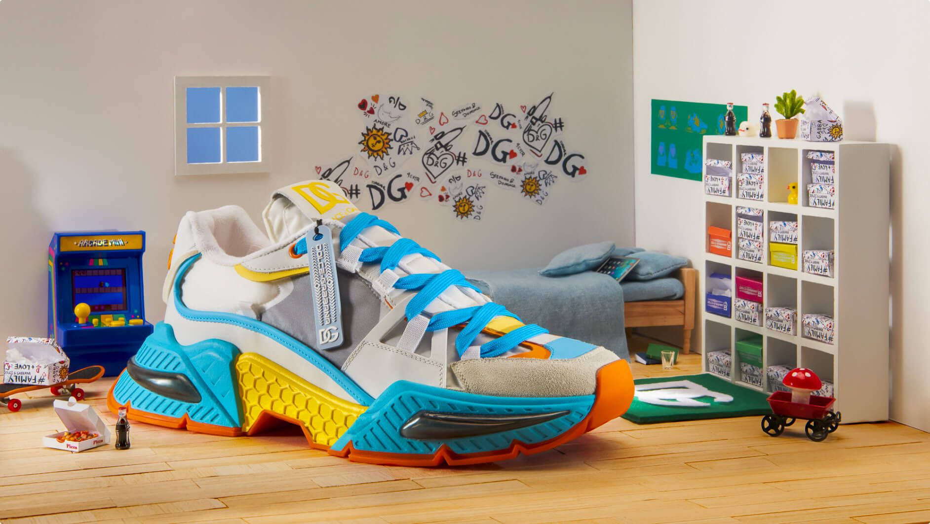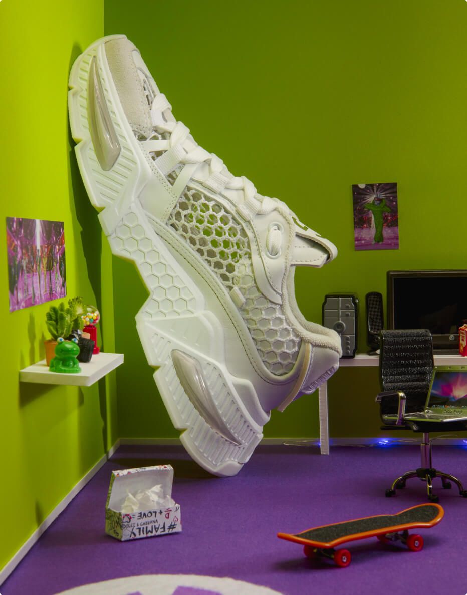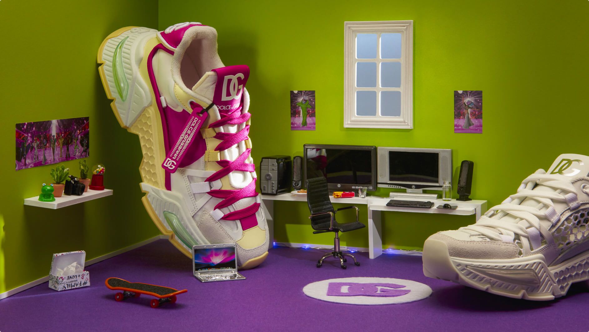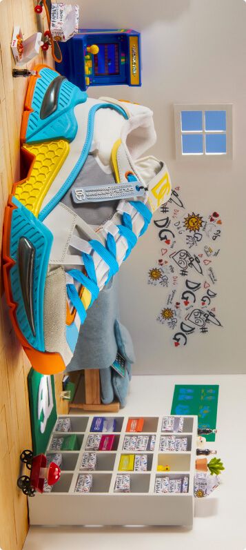 A room is never just a room, but a three-dimensional diary that tells the story of those who inhabit it through colours, decorations and objects that bear witness to a passion. Exploring this dimension is the idea behind DG Rooms, which places Dolce & Gabbana's new Airmaster trainer in the different rooms of a miniature house. Each of these rooms says something about its owner through everyday details such as a gaming computer switched on, a diary, the full shelves of a bookcase. And each of these shades of humanity finds its reflection in the different hues of the new Airmaster: from the total-white colourway to the pink one, passing through its multicoloured version. Similarly, with its aerodynamic silhouette and air bubble in the sole, the Airmaster wants to accompany its owner through all his passions and all the moments of everyday life. Wearing it is a bit like feeling at home.