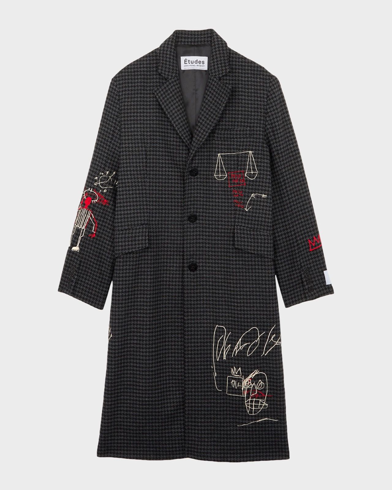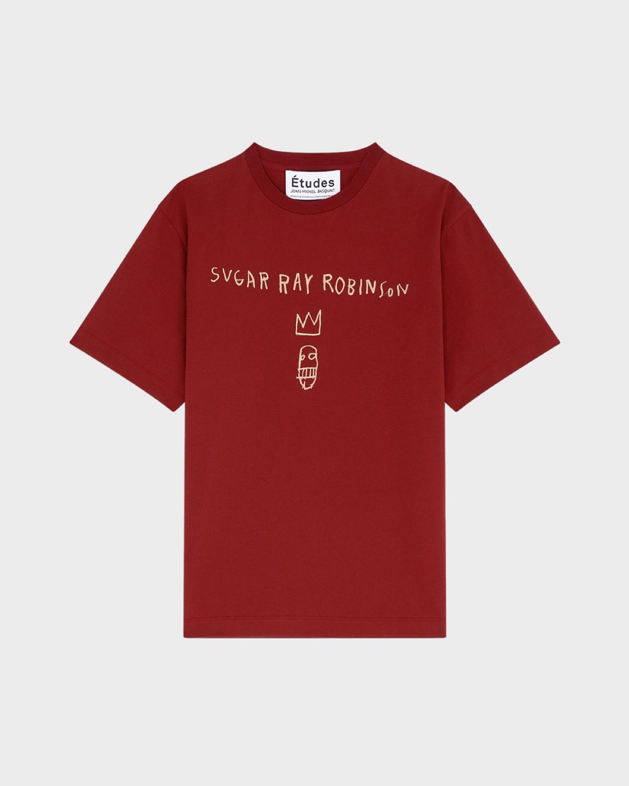Emulating the haptic quality of Basquiat's creations through different techniques, the capsule portrays seventeen of the artist's artworks. Untitled 62 and Cheese Popcorn are presented as all-over prints on cotton and denim, Basquiat's self-portrait is rendered in a vibrant pictorial silkscreen print, while poetic writings and portraits of iconic boxers are finely embroidered on technical nylon and wool, evoking designs made directly onto the garment, and the iconic Pez Dispenser, a chenille patch on a striped cardigan, references the artist's aesthetic sense. Each garment echoes Basquiat's silhouette with elegant tailored outerwear, relaxed sportswear and trendy accessories. The Études X Jean-Michel Basquiat collection is a lively tribute to the artist's iconoclastic approach, from art to fashion, while the garments, once worn, take Basquiat's creations back to where they started: the street.