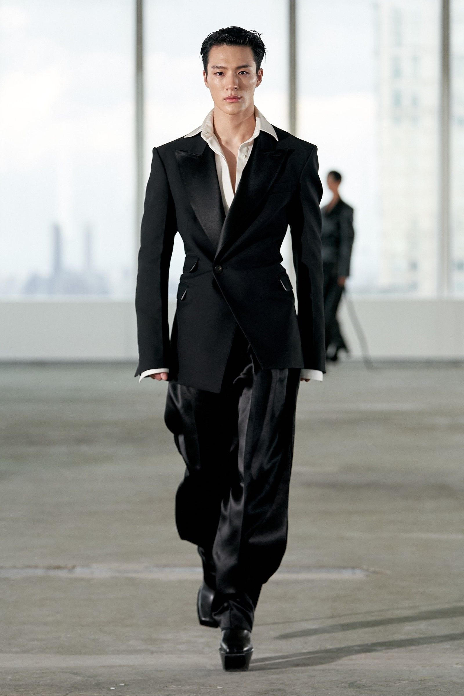 Already from the first look, so simple on paper but also so theatrical, Do's subtly subversive approach emerges as, in the rest of his menswear designs, he takes traditional and even almost boring elements of men's eveningwear, such as the bib dress shirt, and transforms its structural elements to create something new. Another central element of the men's collection were shirts to close at the bottom and leave completely open at the chest that effectively look like a hybrid between the classic Western costume and a cross-lapelled tunic reminiscent of Vietnamese tradition. Indeed, Peter Do has incorporated Vietnamese suggestions into the fits and proportions of his looks before, and yet the end result of his work yesterday went far beyond citations, references, and debts to the past to produce menswear that, genderless as it may seem, conveys a sense of relevance, absolute modernity, and above all, timeless originality.