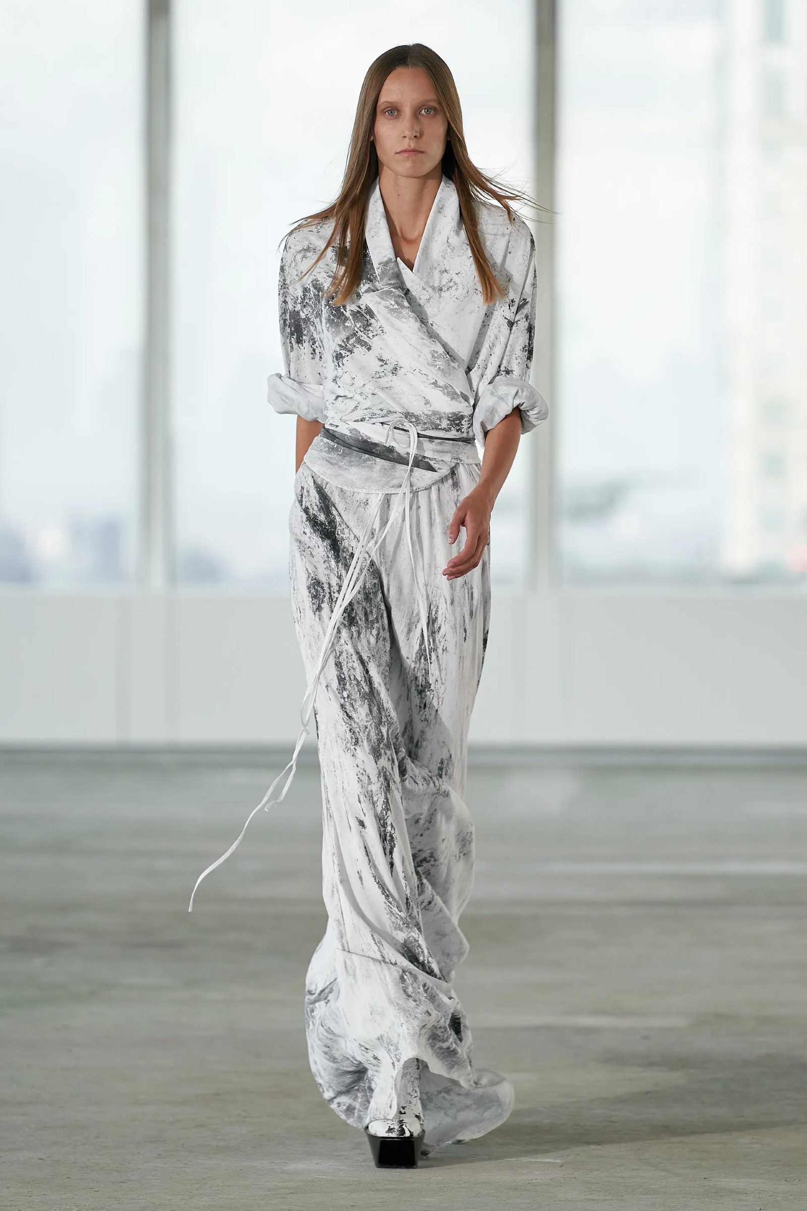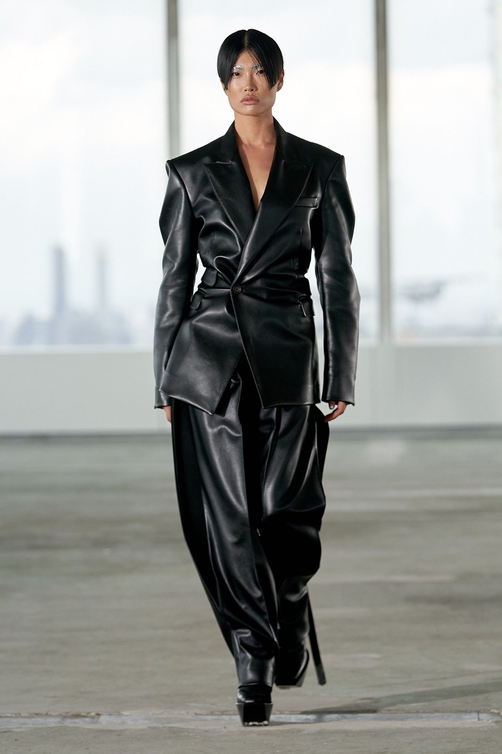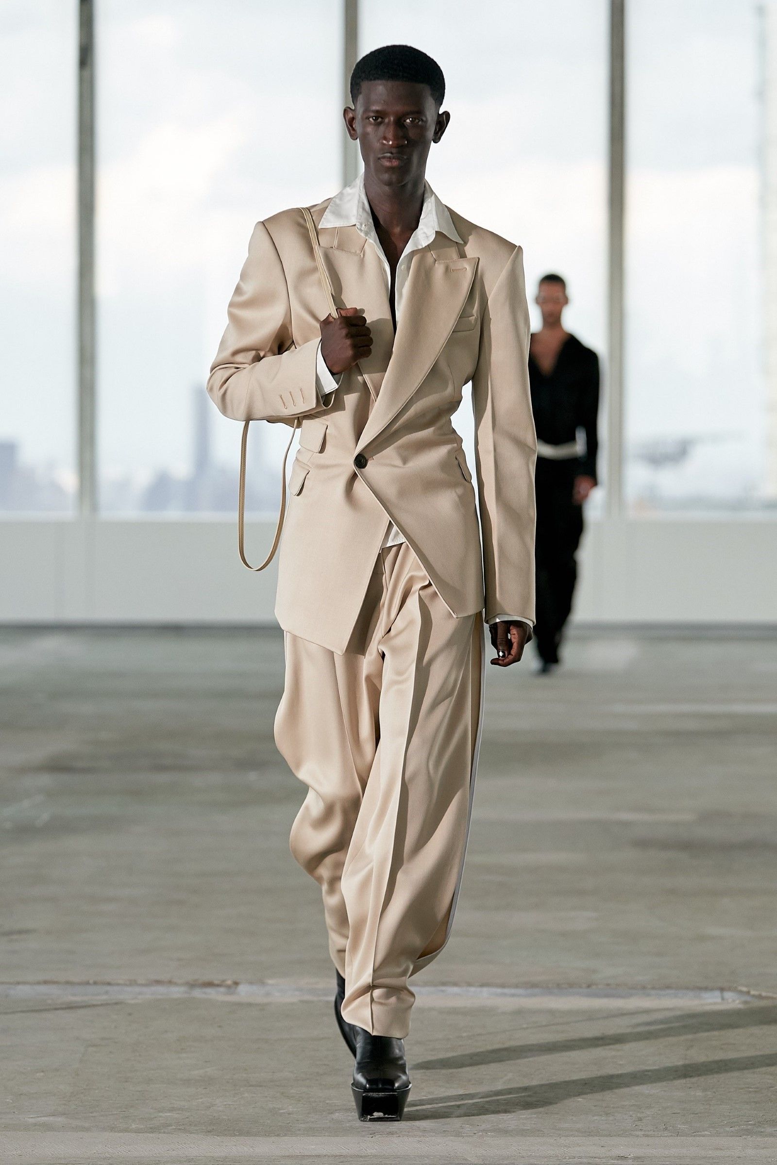 That's what happened yesterday during the brand's SS23 show, held in New York City on the 59th floor of the Liberty Building, where signaling the brand's turnaround was K-Pop star Jeno, a member of NCT, who opened the show with a look-symbol of Do's menswear: a satin lapel blazer buttoned at the waist in such a way as to twist and fold the fabric, a thick white cotton shirt underneath, very wide pants with shiny silk pleats with side slits, and very tall boots. Behind the back a triangular cut-out of jacket and shirt whose flaps are held in place, at the base of the back, by a tiny bow that is carried behind a very long strap like a train. Elsewhere there are huge coats with contrasting topstitching, deconstructed sweater-ponchos that fall loosely over the shoulders, sheer tank tops, skirts and sashes, monumental handbags, delicate tie-dyes that mimic the colors of the sky above New York, silky textures, mirror-covered sleeves like romantic studs, leather trench coats and garments made of Tomtex, a plastic-free vegan leather made with waste from the fishing industry.
