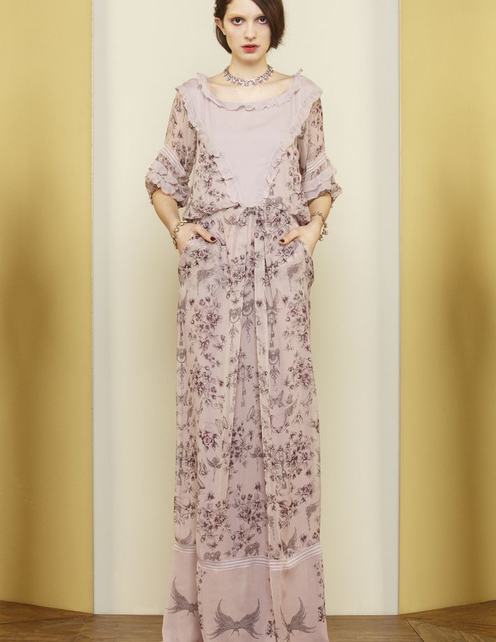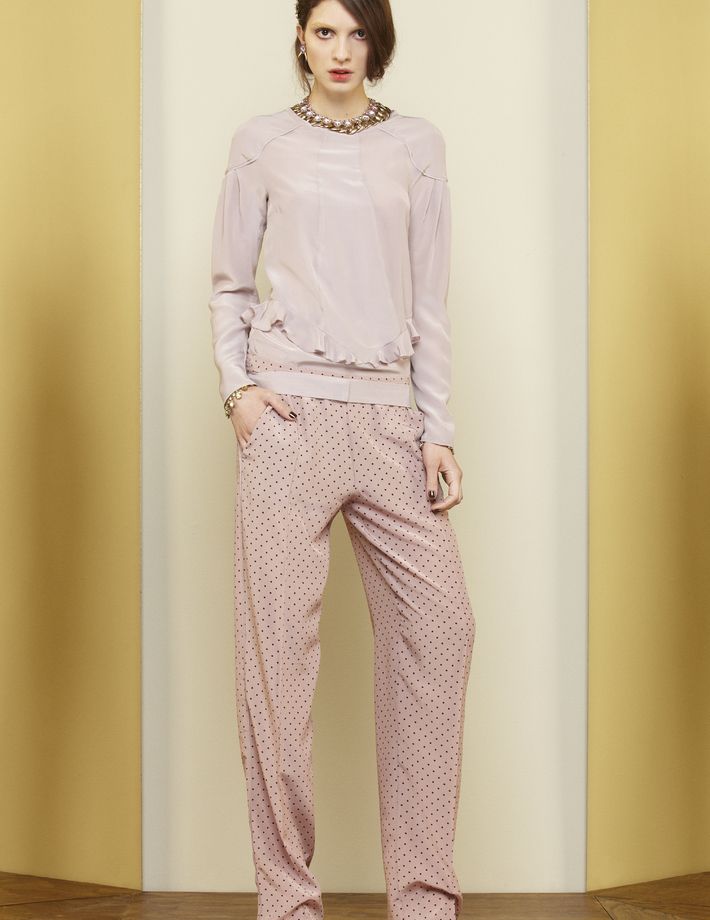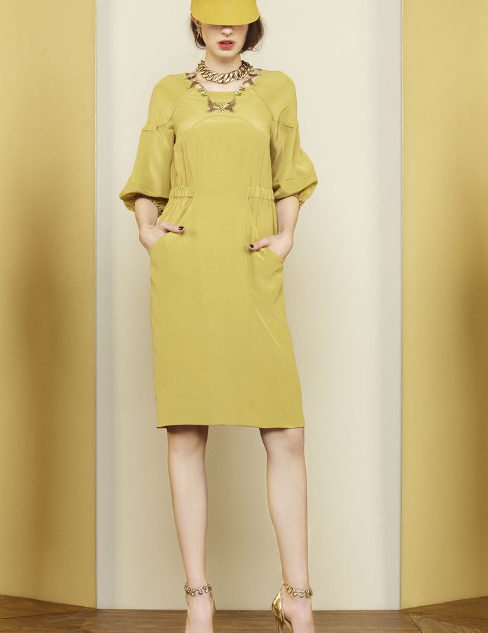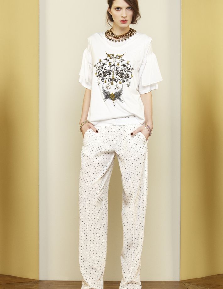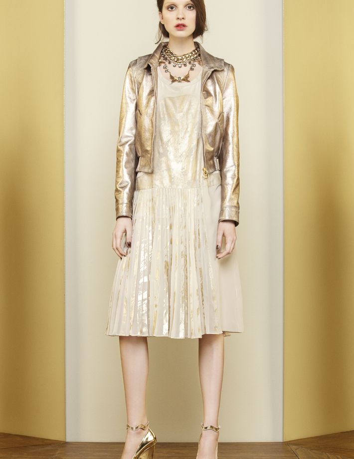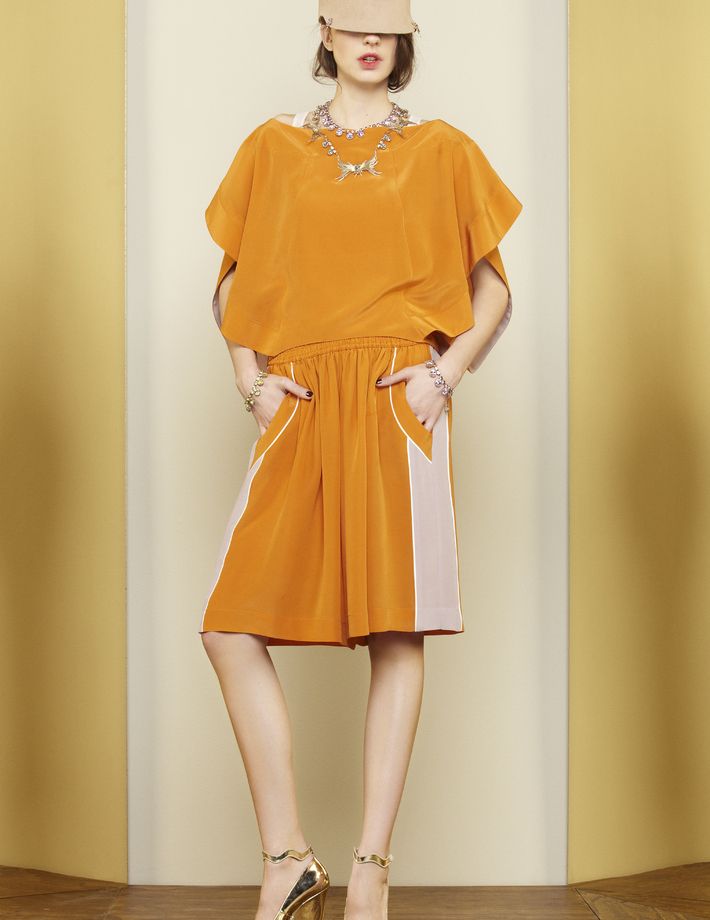The lines is composed by egg tunic dresses, shorts, pleated skirts, jackets, printed t-shirts, jogging pants and fluid maxi dresses. Every outfit is completed with strong accessories: triple chain necklaces, bracelets, beautiful ankle-strap heels, everything gold. In fact gold is one of the colours which compose the palette, with orange, bordeaux, beige, soft yellow and powder.