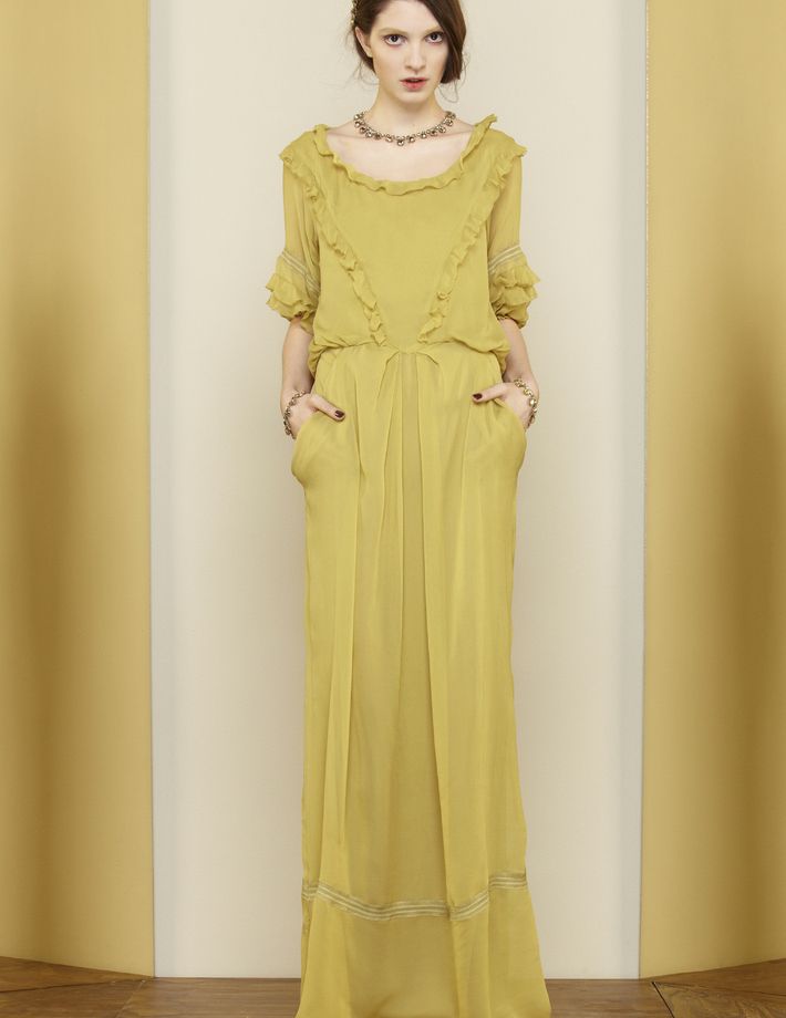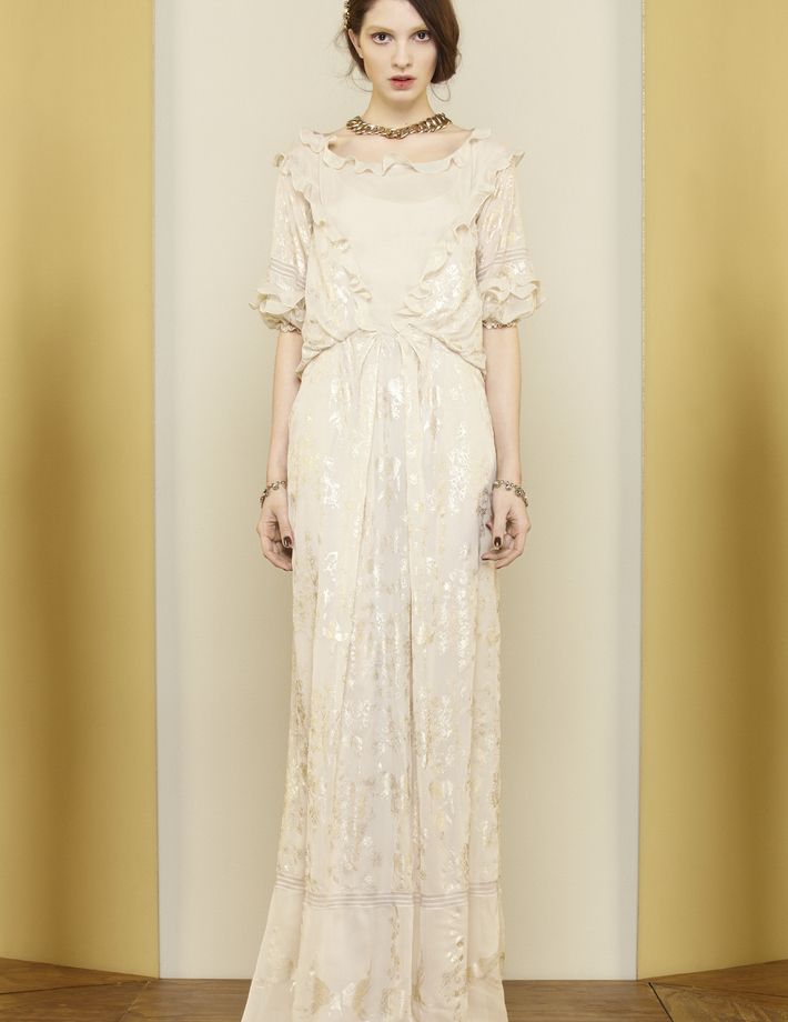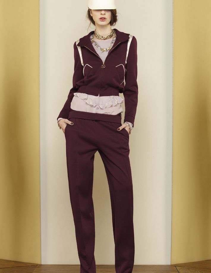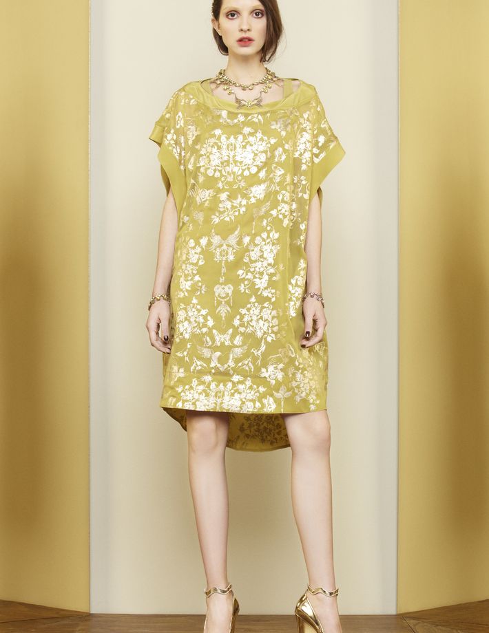 La linea è composta da abiti tunica a uovo, shorts, gonnelline a pieghe, giubbini, t-shirts stampate, pantaloni da jogging e ricercati maxi dresses. Ogni outfit è completato con accessori forti: triple collane a catena, braccialetti, meravigliose scarpe con tacco e cinturino alla caviglia, tutto oro. Infatti l’oro è uno dei colori che compone la palette, assieme ad arancio, bordeaux, beige, giallo tenue e cipria.