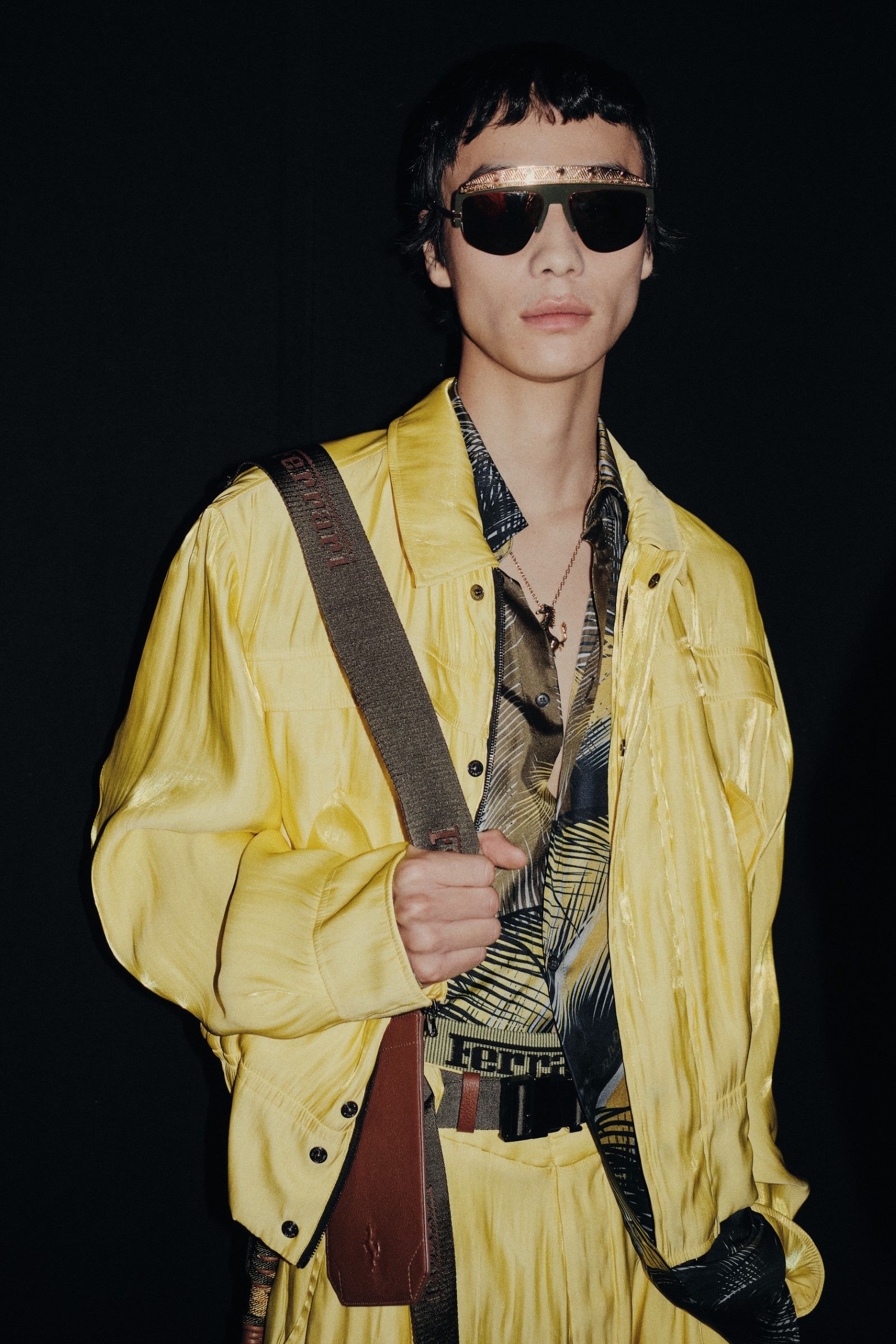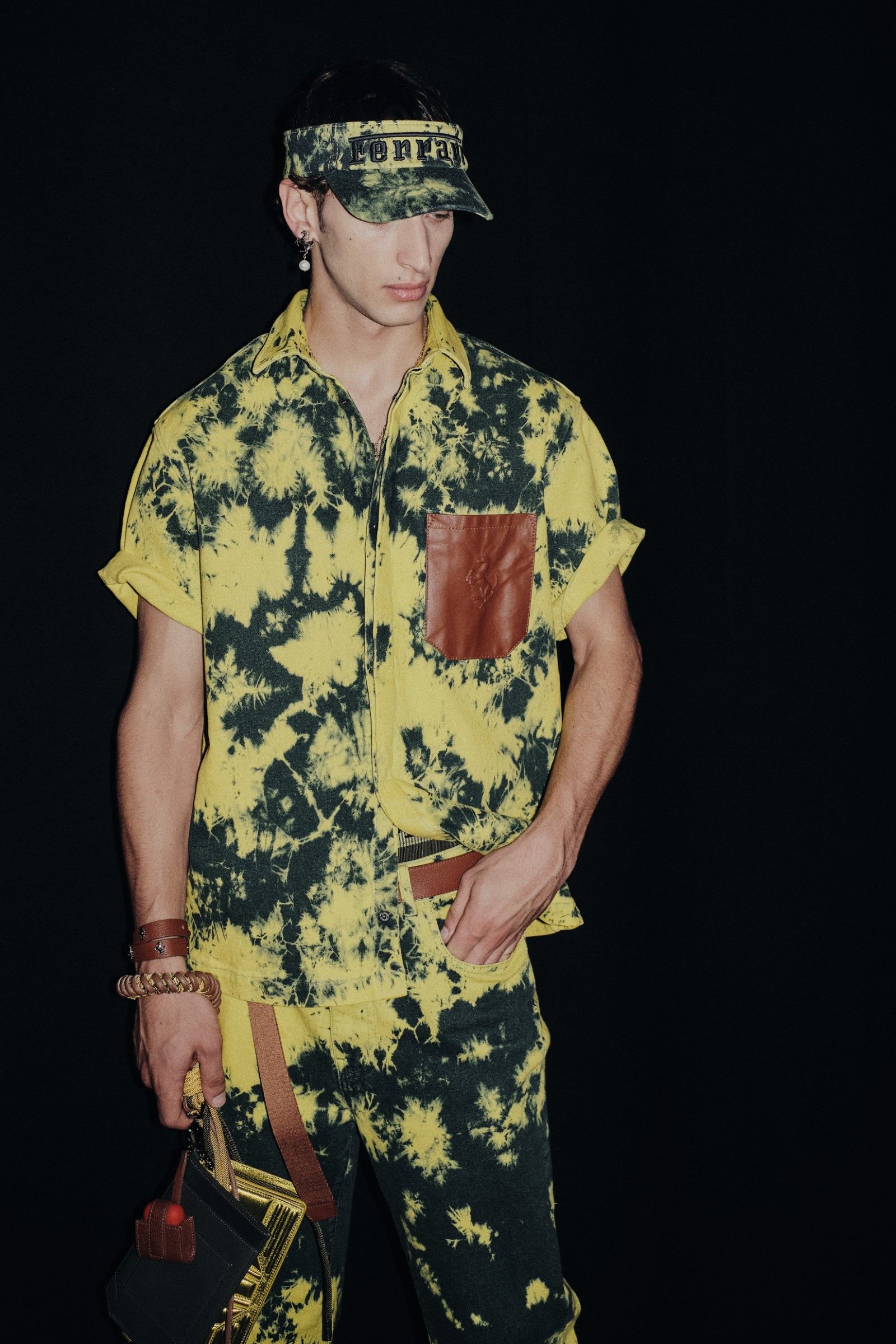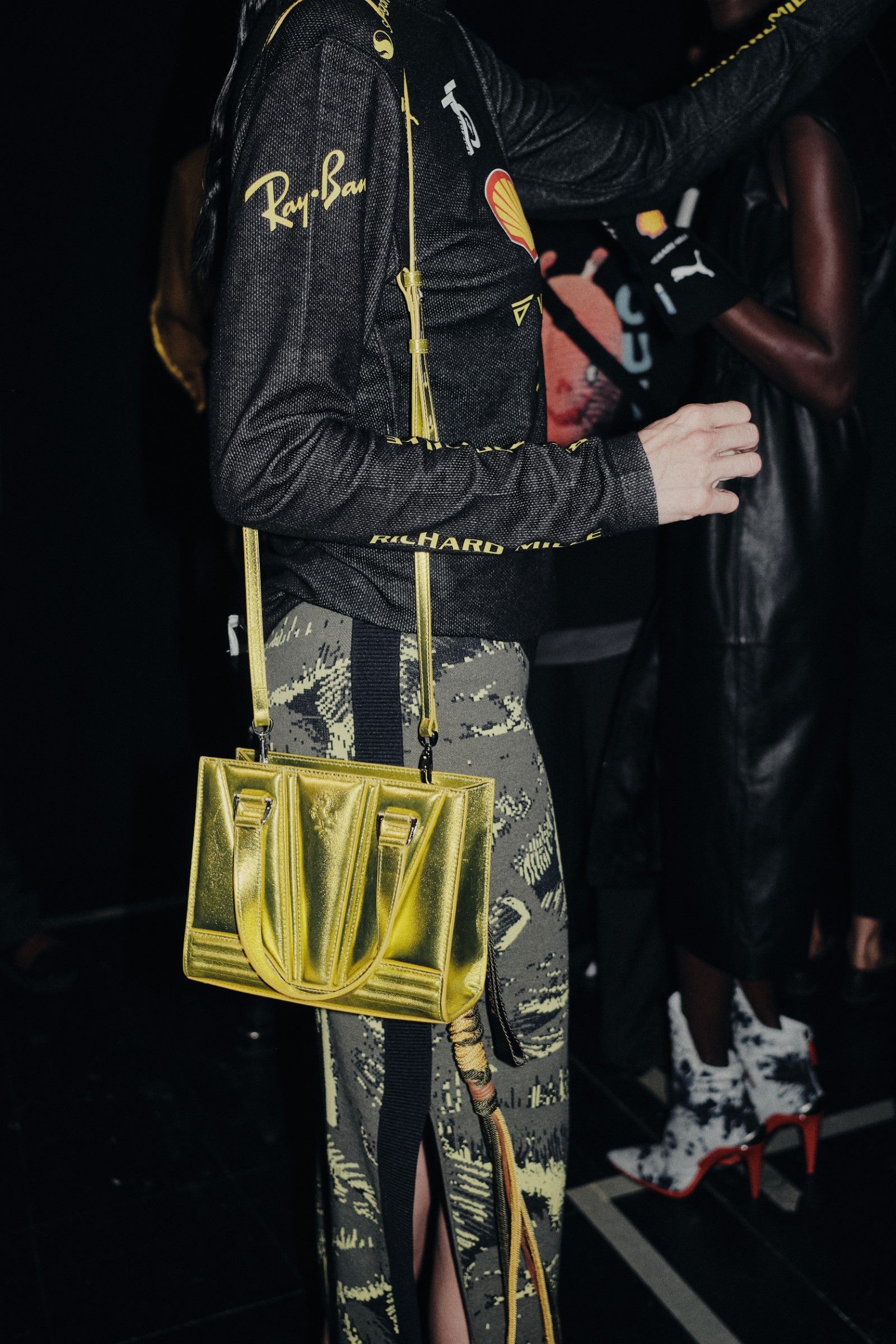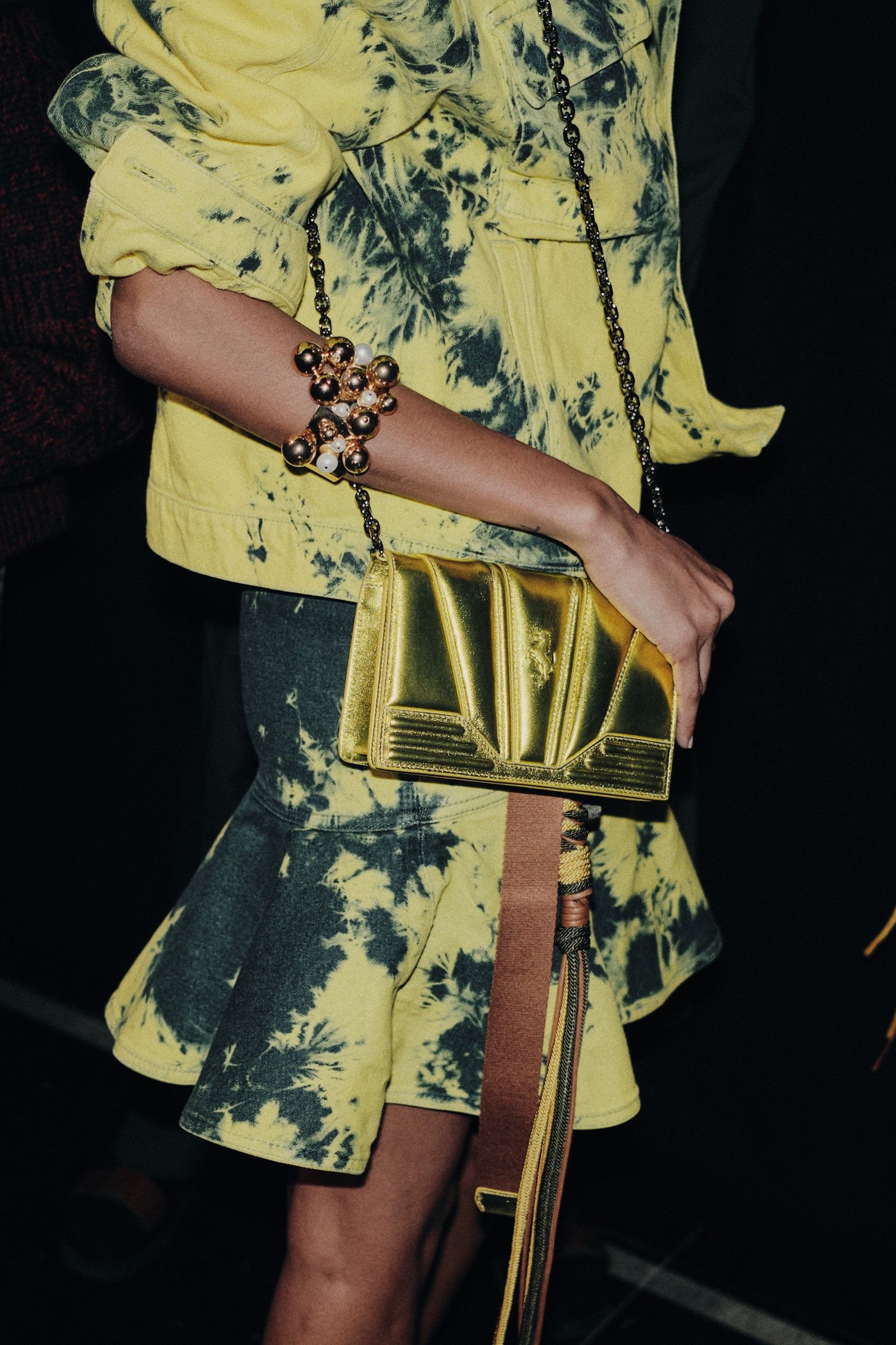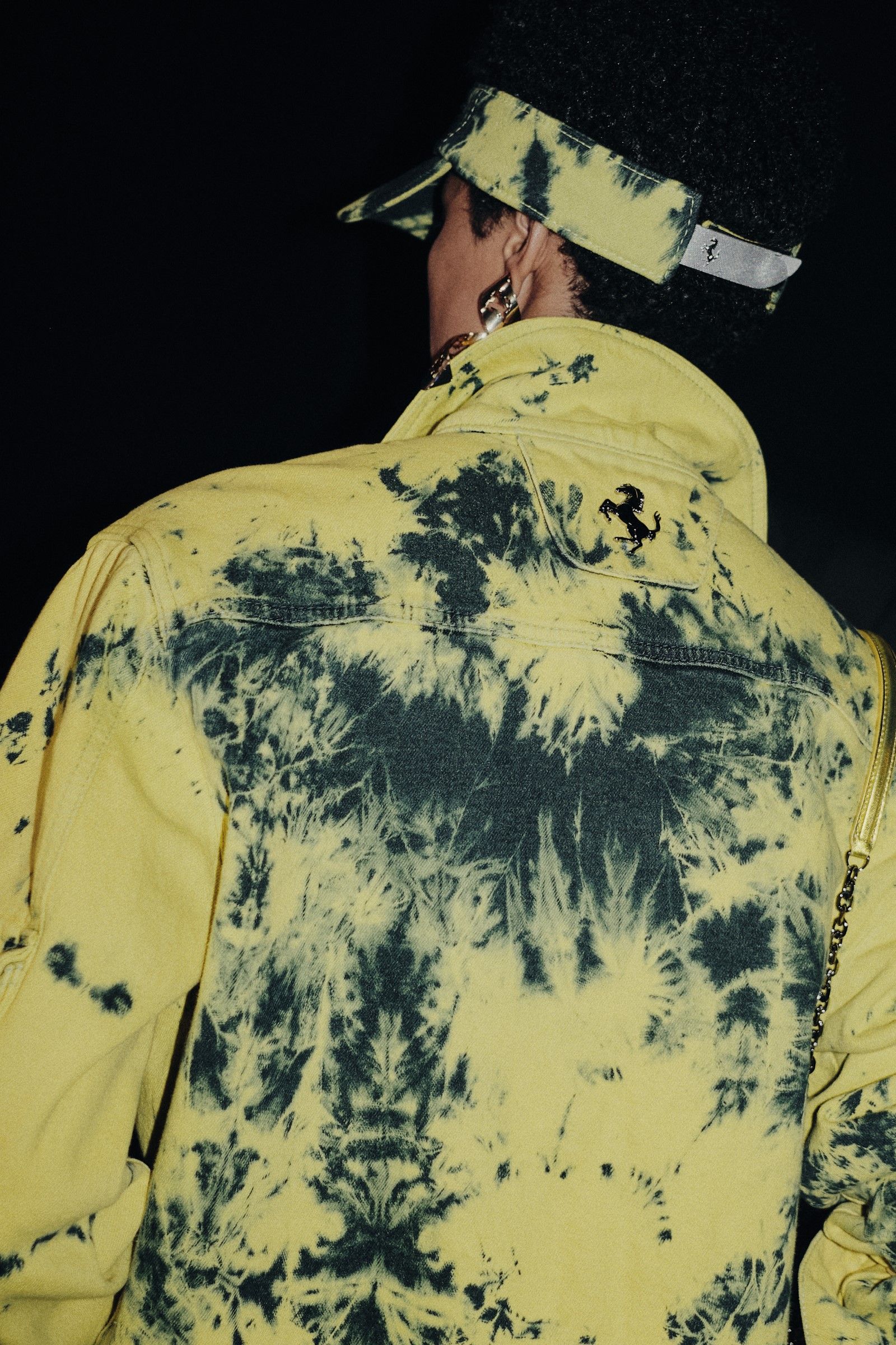 Precisely in homage to Los Angeles, the camouflage motif so dear to Iannone, which had previously been reinterpreted through remixed prints of the Ferrari Horse, is now replaced by a motif of palm leaves, the main connotation of the California landscape, as well as by the idea of light (Southern California's is one of the best in the world according to Iannone) that was translated in terms of the collection in a series of dresses that appeared on the finale to which the photos do not do justice: it was an incredibly bright fabric in which sequins were joined by crystal-covered bolts and minute metal parts of cars. «There is no tailoring, there is no sportswear, there is no label. It is a collection in which the wardrobe is perfectly contaminated and responds to today's look, to our way of approaching fashion-which is not a sectorial fashion, not manifested in occasions of use, but a fashion where everything is mixed», Iannone explains. In other looks in the collection, denim (one of the collection's four core material elements, in addition to cotton, leather, and silk) had been finished and polished by employing a sustainable ozone treatment that only one manufactory in all of Italy could provide, while some of the small leather goods were made from excess leather scraps left over from car seat processing.