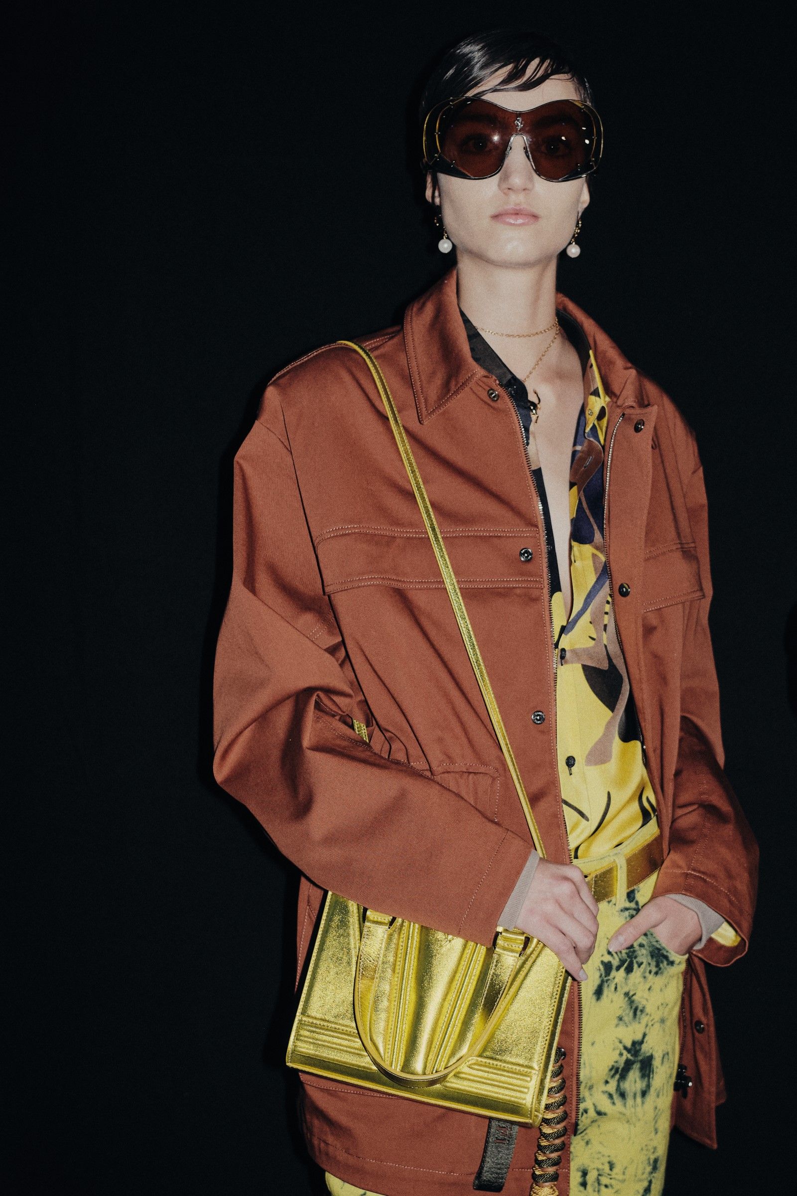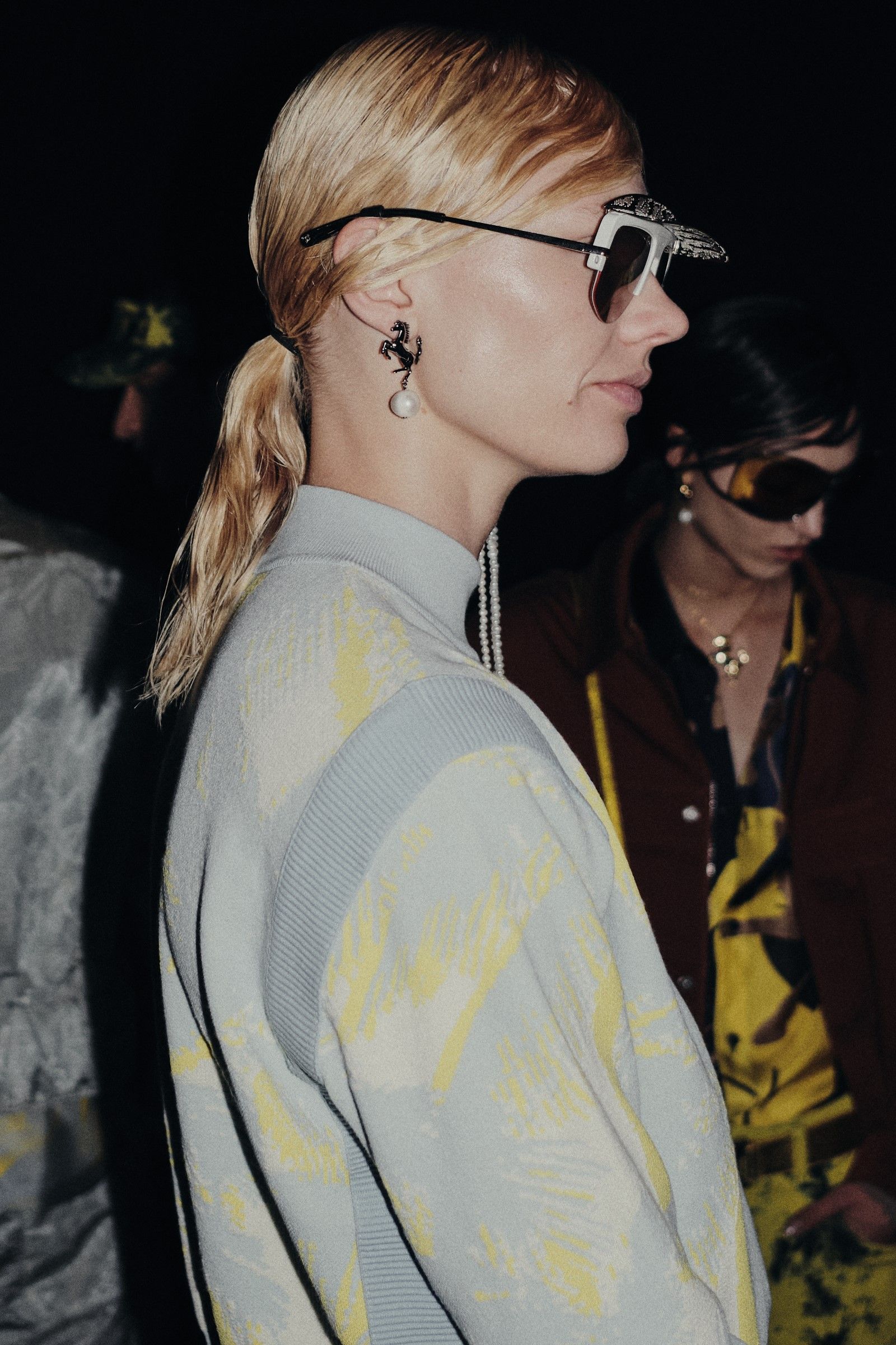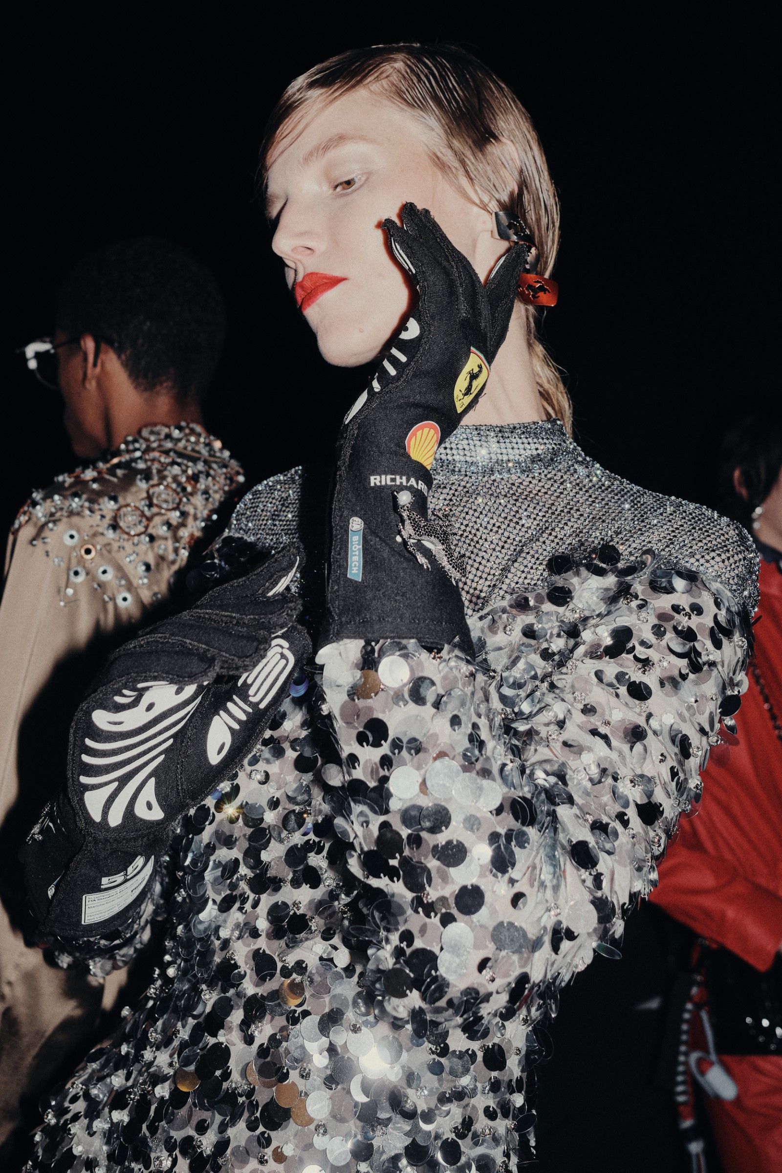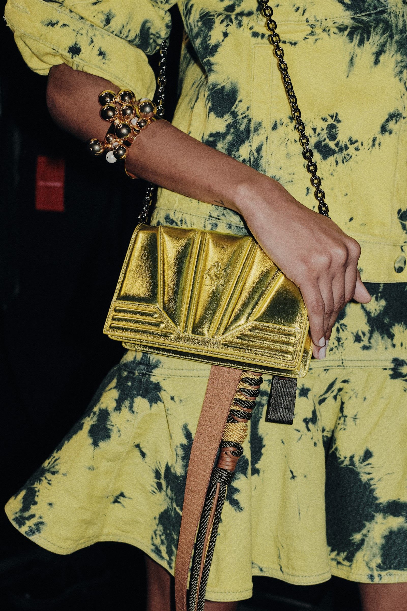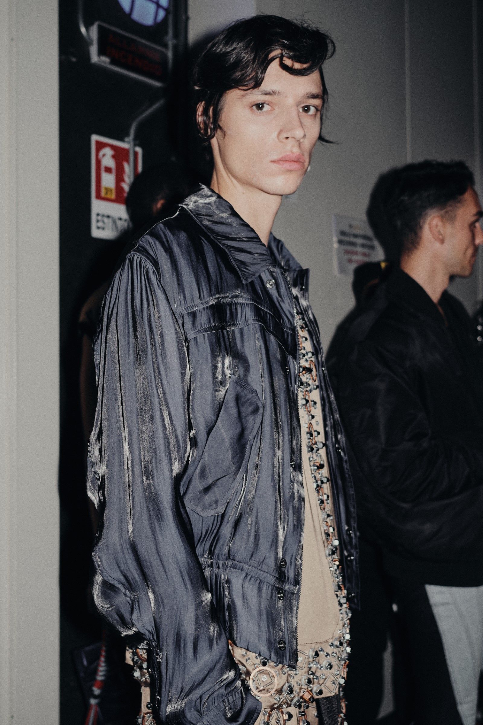 Precisely in homage to Los Angeles, the camouflage motif so dear to Iannone, which had previously been reinterpreted through remixed prints of the Ferrari Horse, is now replaced by a motif of palm leaves, the main connotation of the California landscape, as well as by the idea of light (Southern California's is one of the best in the world according to Iannone) that was translated in terms of the collection in a series of dresses that appeared on the finale to which the photos do not do justice: it was an incredibly bright fabric in which sequins were joined by crystal-covered bolts and minute metal parts of cars. «There is no tailoring, there is no sportswear, there is no label. It is a collection in which the wardrobe is perfectly contaminated and responds to today's look, to our way of approaching fashion-which is not a sectorial fashion, not manifested in occasions of use, but a fashion where everything is mixed», Iannone explains. In other looks in the collection, denim (one of the collection's four core material elements, in addition to cotton, leather, and silk) had been finished and polished by employing a sustainable ozone treatment that only one manufactory in all of Italy could provide, while some of the small leather goods were made from excess leather scraps left over from car seat processing.