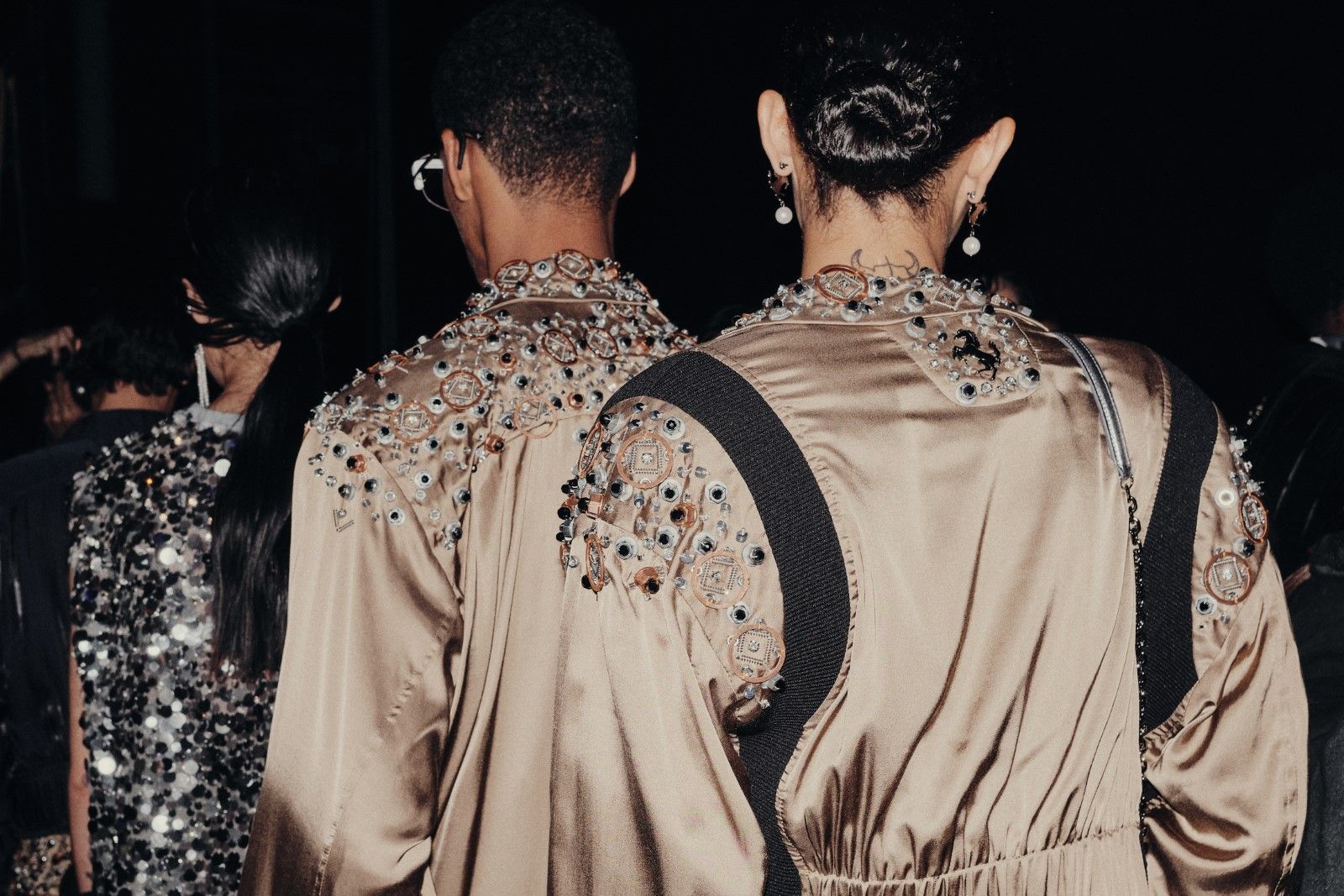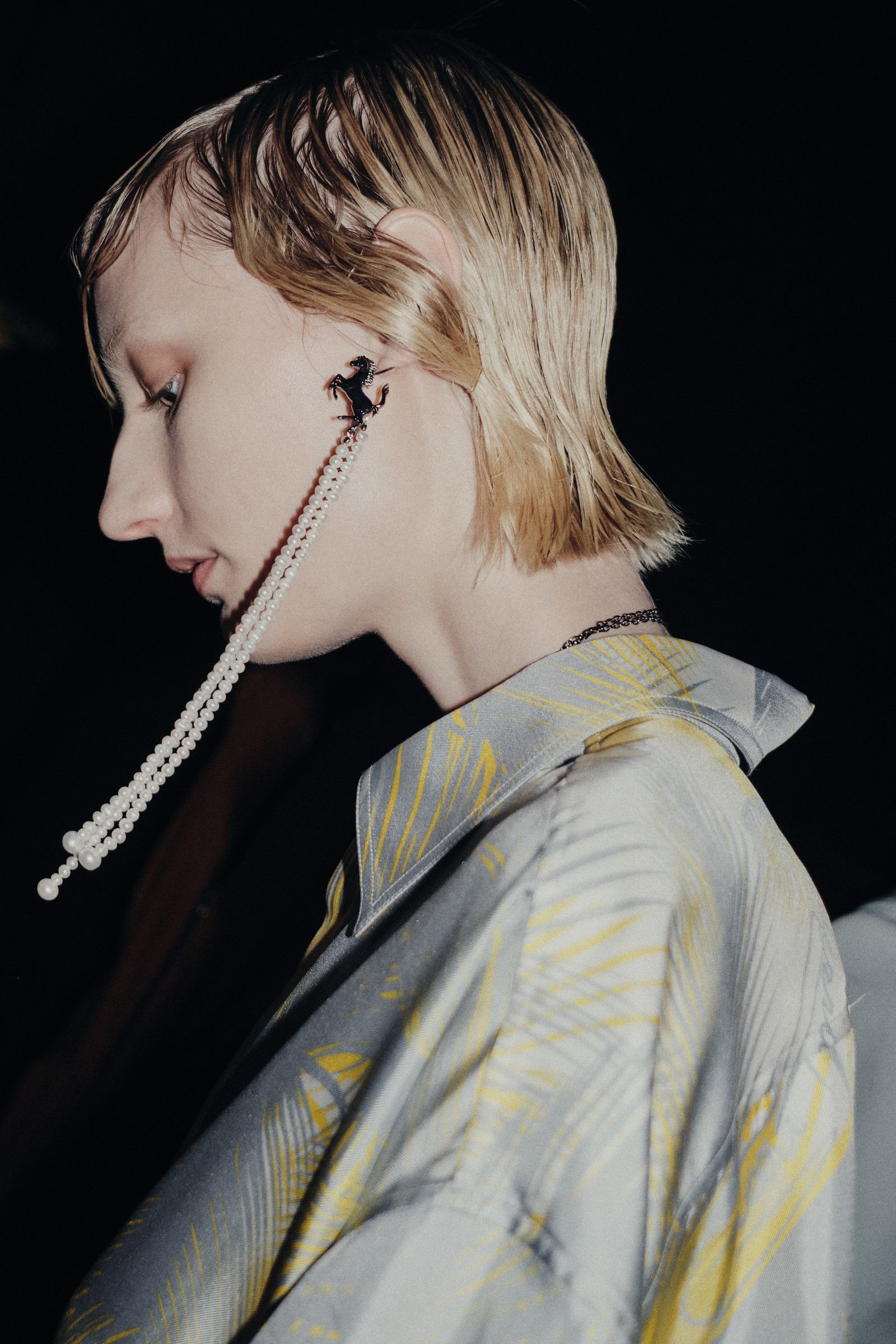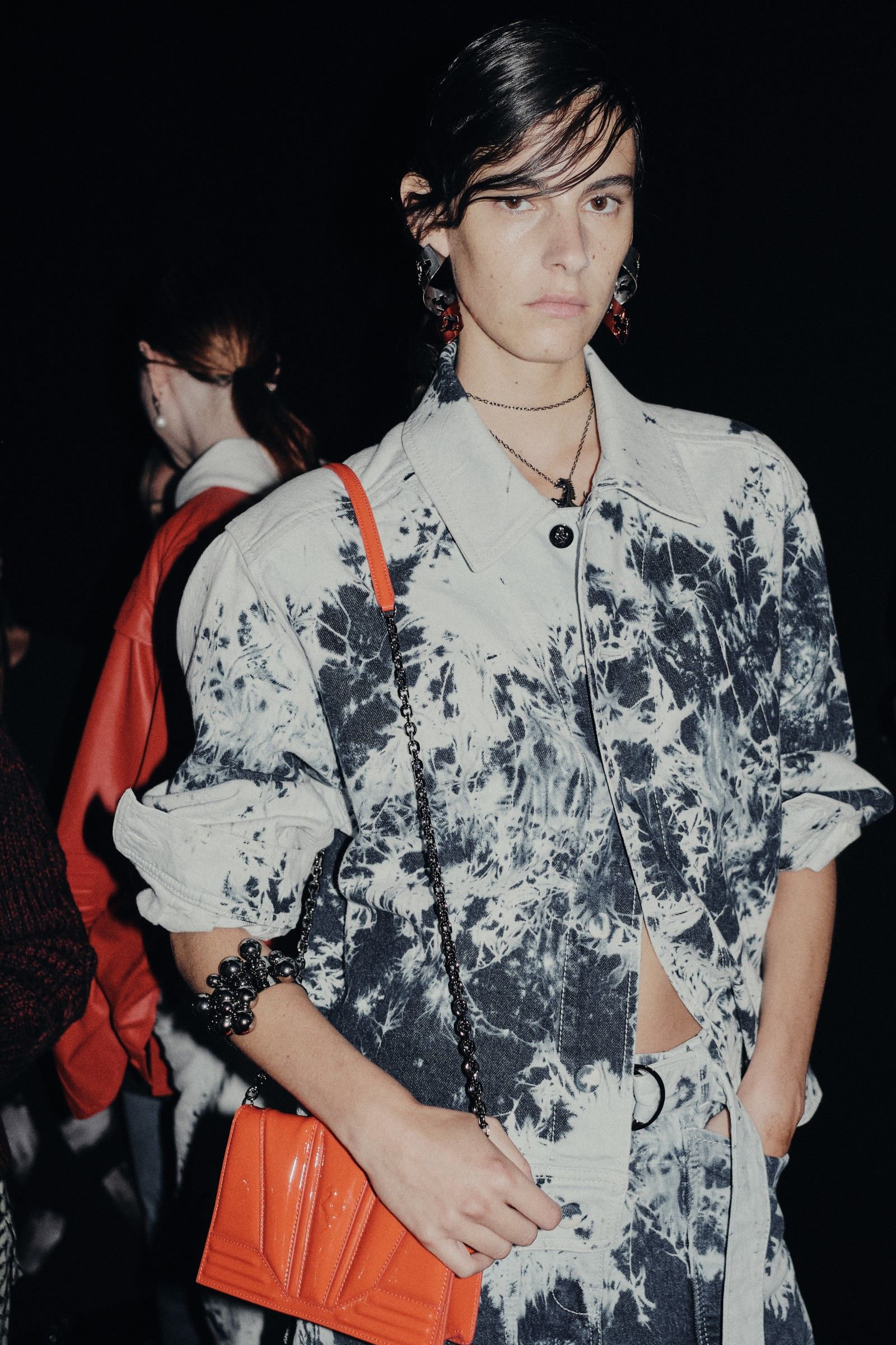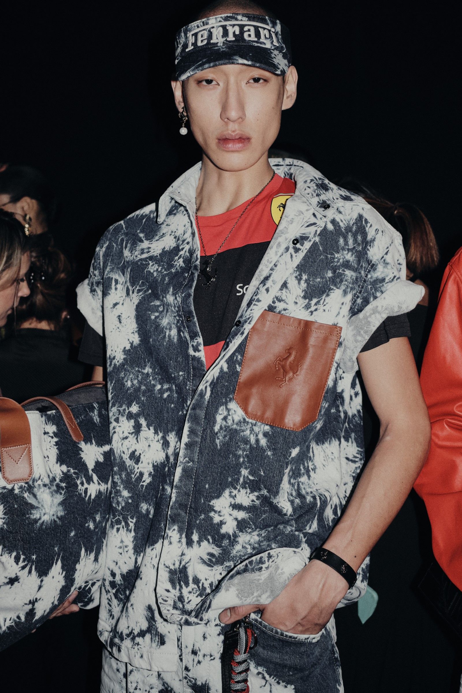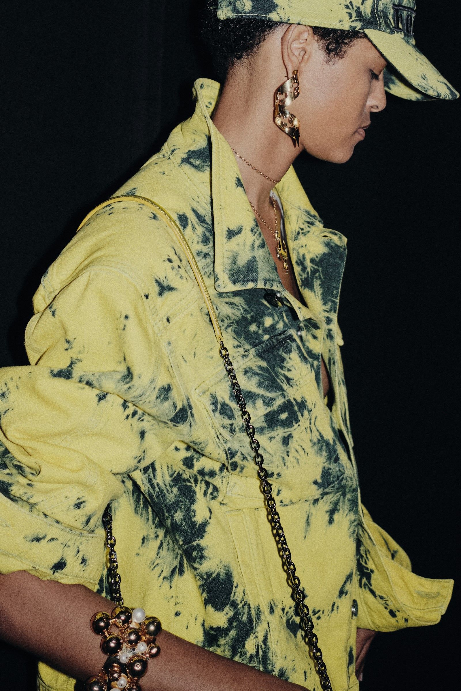 Precisely in homage to Los Angeles, the camouflage motif so dear to Iannone, which had previously been reinterpreted through remixed prints of the Ferrari Horse, is now replaced by a motif of palm leaves, the main connotation of the California landscape, as well as by the idea of light (Southern California's is one of the best in the world according to Iannone) that was translated in terms of the collection in a series of dresses that appeared on the finale to which the photos do not do justice: it was an incredibly bright fabric in which sequins were joined by crystal-covered bolts and minute metal parts of cars. «There is no tailoring, there is no sportswear, there is no label. It is a collection in which the wardrobe is perfectly contaminated and responds to today's look, to our way of approaching fashion-which is not a sectorial fashion, not manifested in occasions of use, but a fashion where everything is mixed», Iannone explains. In other looks in the collection, denim (one of the collection's four core material elements, in addition to cotton, leather, and silk) had been finished and polished by employing a sustainable ozone treatment that only one manufactory in all of Italy could provide, while some of the small leather goods were made from excess leather scraps left over from car seat processing.