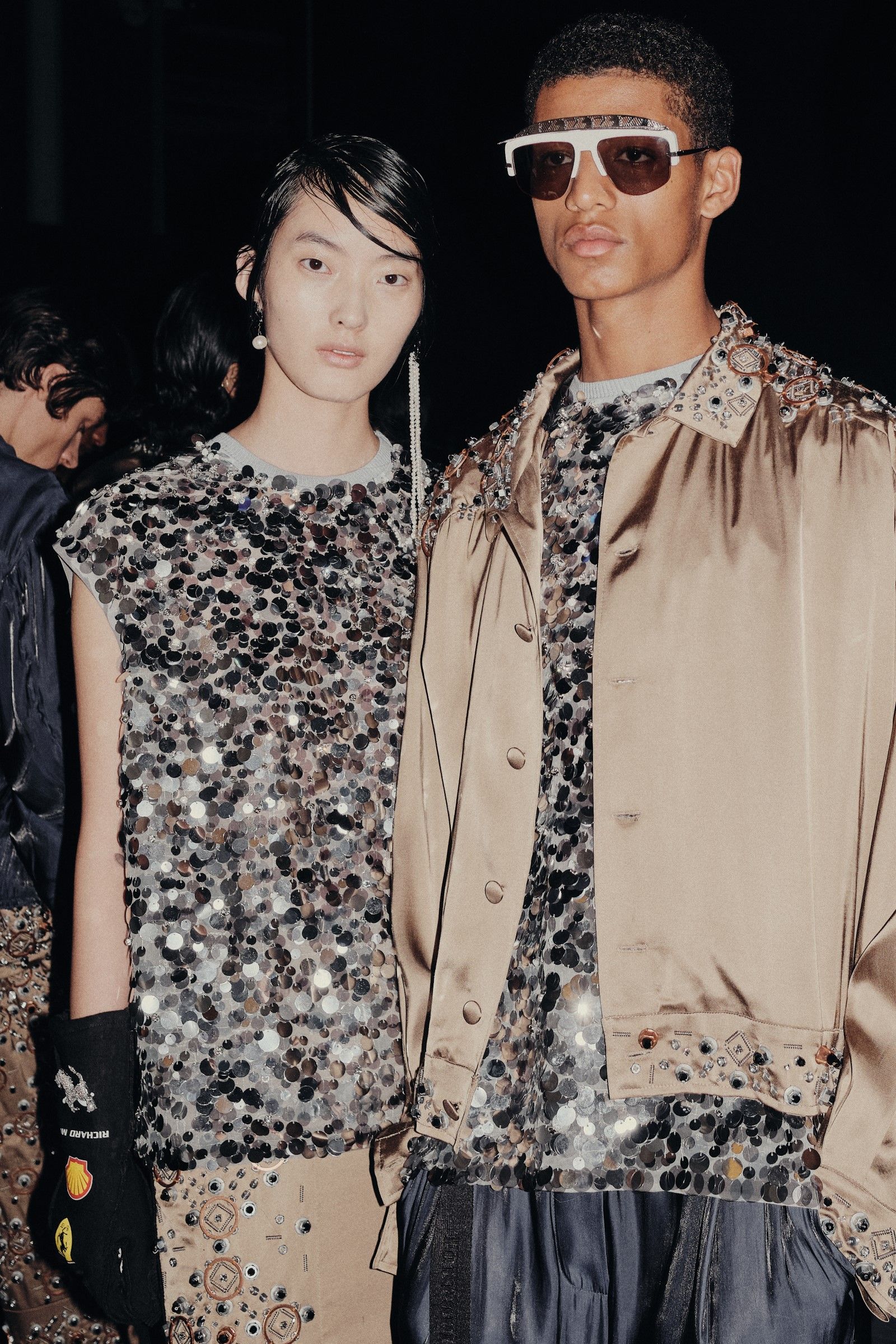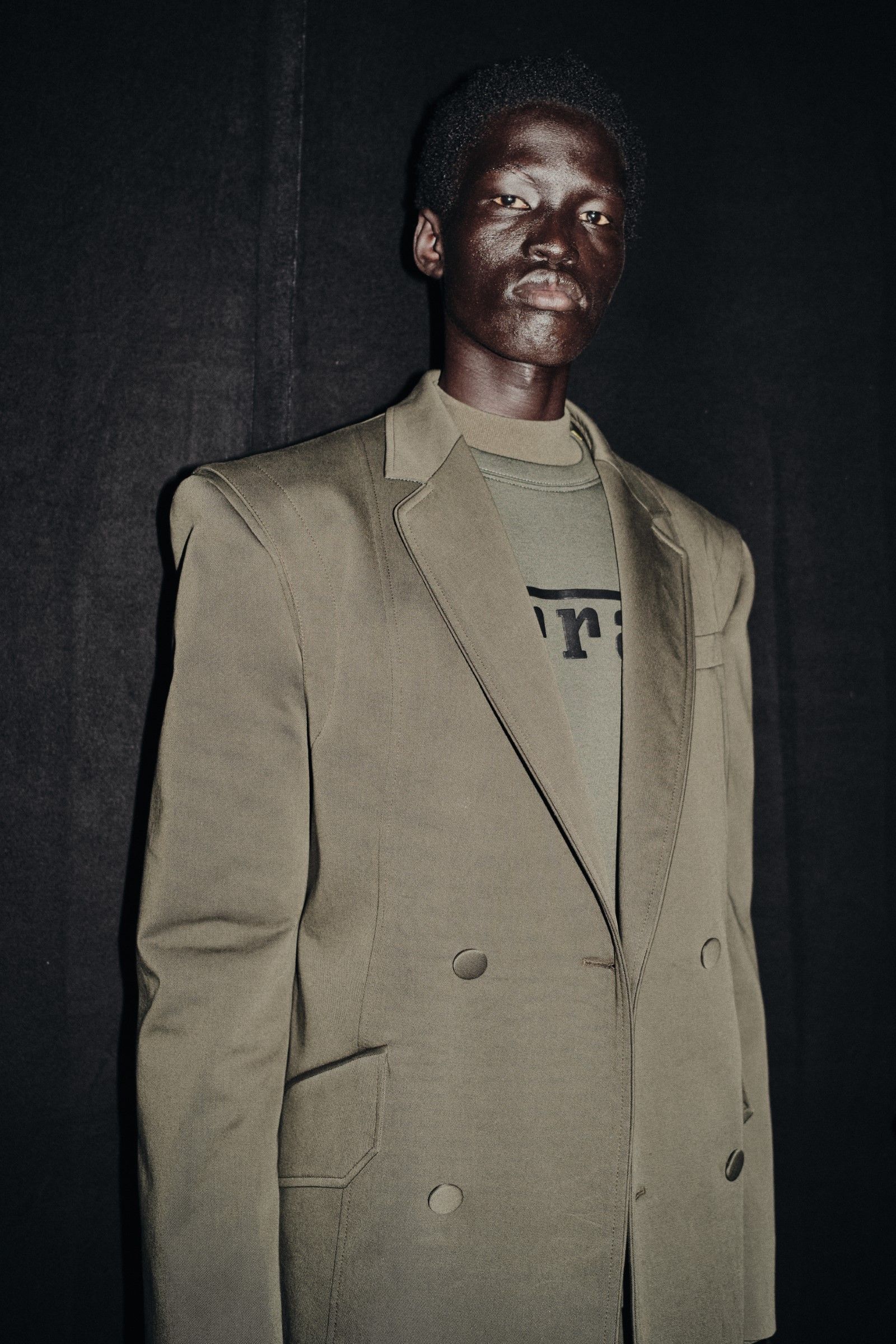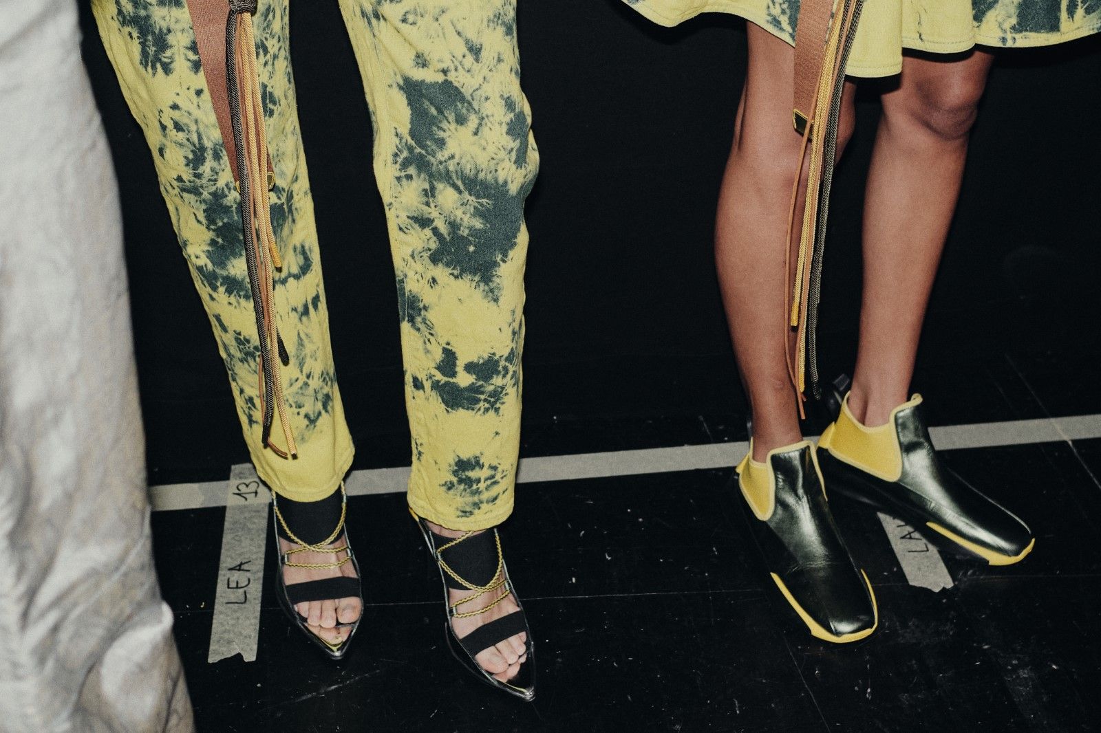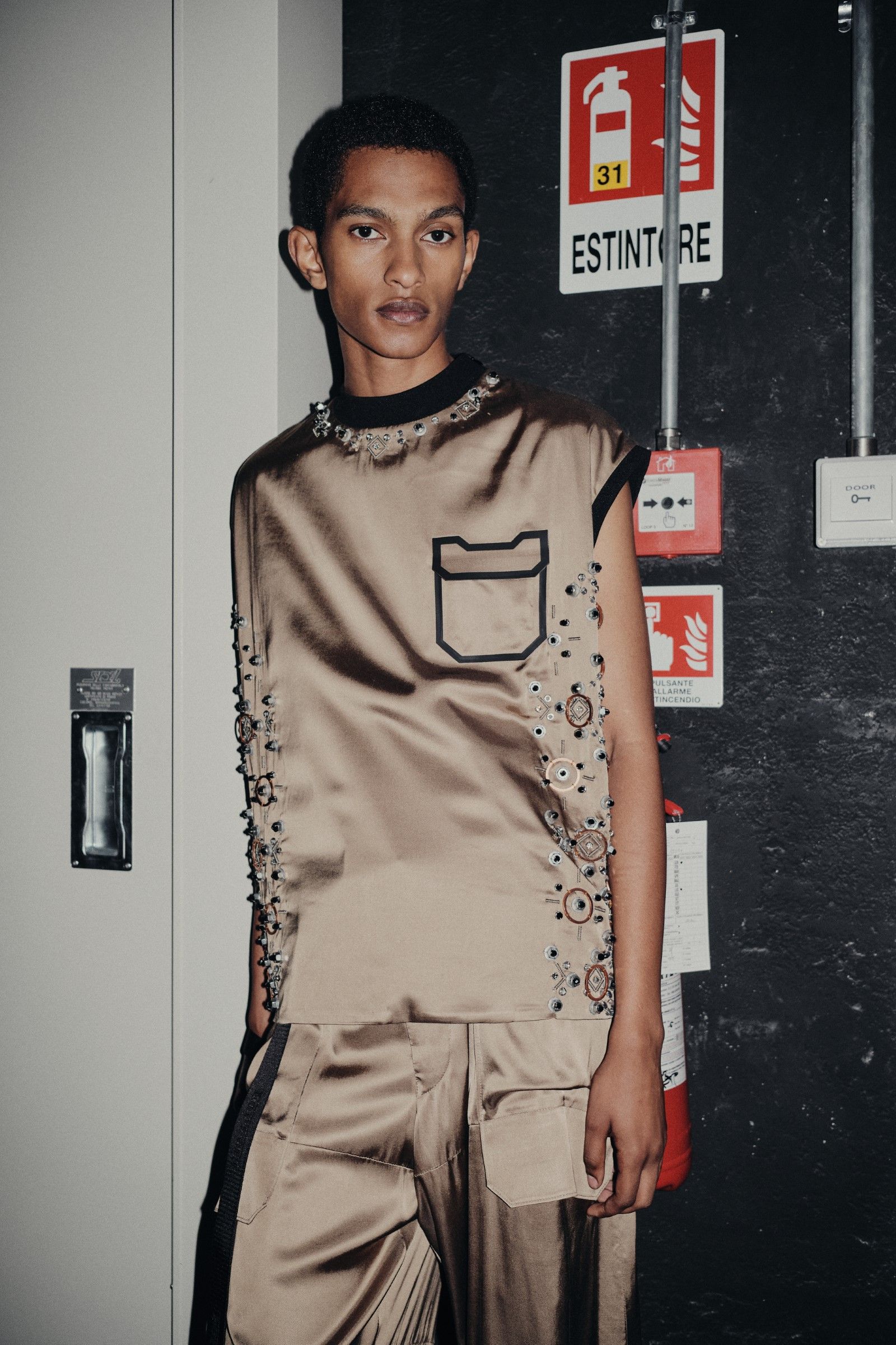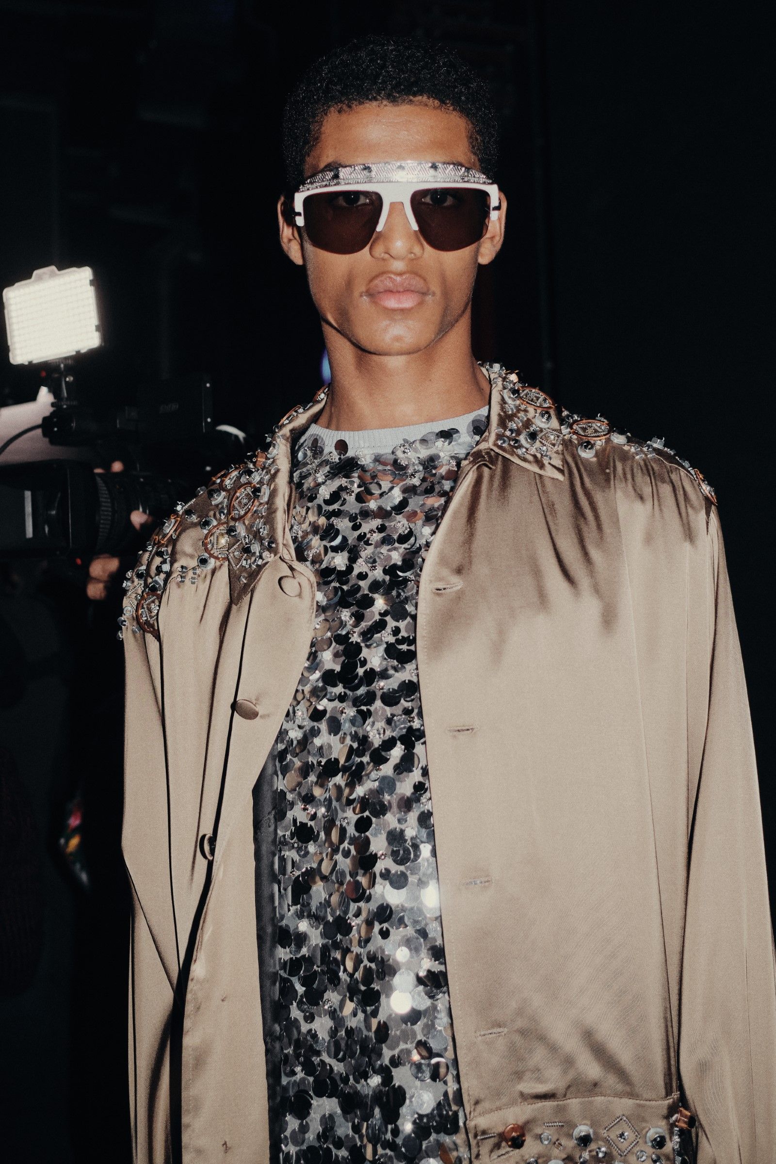 Precisely in homage to Los Angeles, the camouflage motif so dear to Iannone, which had previously been reinterpreted through remixed prints of the Ferrari Horse, is now replaced by a motif of palm leaves, the main connotation of the California landscape, as well as by the idea of light (Southern California's is one of the best in the world according to Iannone) that was translated in terms of the collection in a series of dresses that appeared on the finale to which the photos do not do justice: it was an incredibly bright fabric in which sequins were joined by crystal-covered bolts and minute metal parts of cars. «There is no tailoring, there is no sportswear, there is no label. It is a collection in which the wardrobe is perfectly contaminated and responds to today's look, to our way of approaching fashion-which is not a sectorial fashion, not manifested in occasions of use, but a fashion where everything is mixed», Iannone explains. In other looks in the collection, denim (one of the collection's four core material elements, in addition to cotton, leather, and silk) had been finished and polished by employing a sustainable ozone treatment that only one manufactory in all of Italy could provide, while some of the small leather goods were made from excess leather scraps left over from car seat processing.