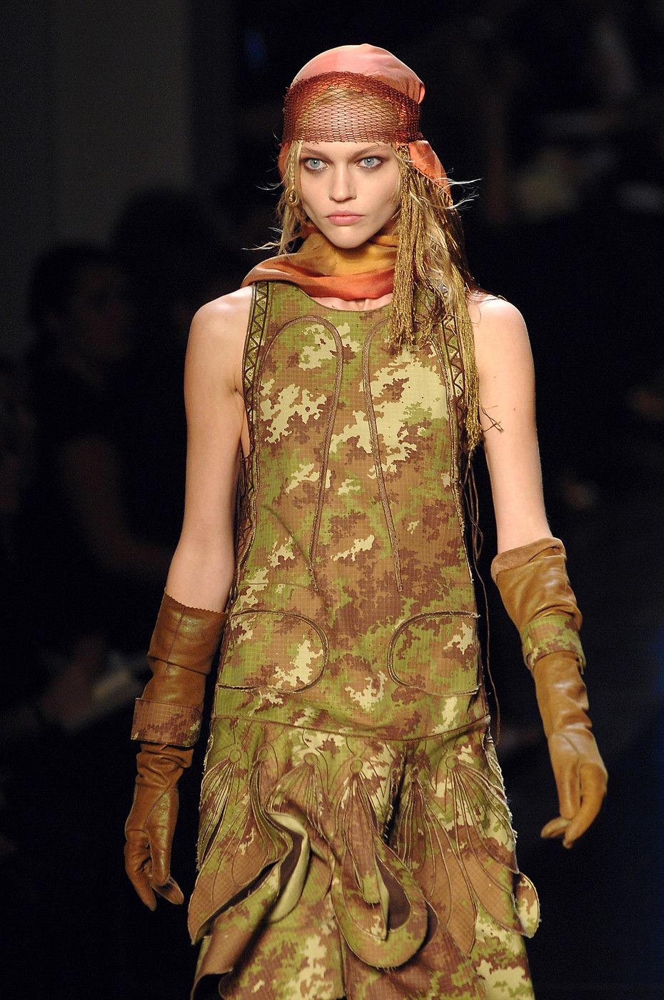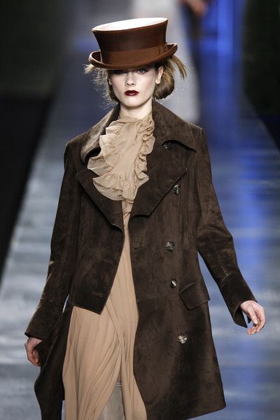 Topical characters from 19th century literature - explorers, soldiers, lords, countesses and prostitutes - but with a punk, burlesque, dark or fetish twist, sub-genres that can include mohawk hairstyles, a massive use of piercings, shredded petticoats, Gothic styles such as the Gothic Aristocrat or Gothic Lolita. In 2005, Kate Lambert, known as 'Kato', founded the first steampunk clothing company, Steampunk Couture, mixing Victorian, cyber punk and tribal influences as well as science fiction and shabby chic. Among the first to resort to Victorian sci-fi imagery and bring one of the pivotal subcultures of the 1910s into vogue was Jean-Paul Gaultier, who for SS08 proposed pirate-style garments in earthy colours and in 2012 explored the men's suit paired with structured bodices and David Copperfield-style cylinders. In 2003 Alexander McQueen presented a collection with dark brown leather boots, vaporous jackets and shirts worn with leather and chuncky belts with buckles, and in 2006 Domenico Dolce and Stefano Gabbana gave their own interpretation of the trend with double-breasted financiers and high-waisted trousers in matching dandy taste. Vivienne Westwood's pirate imagery, on the other hand, dates back much earlier, to AW 1981, an exquisitely undone aesthetic that has accompanied the queen of punk for more than forty years.