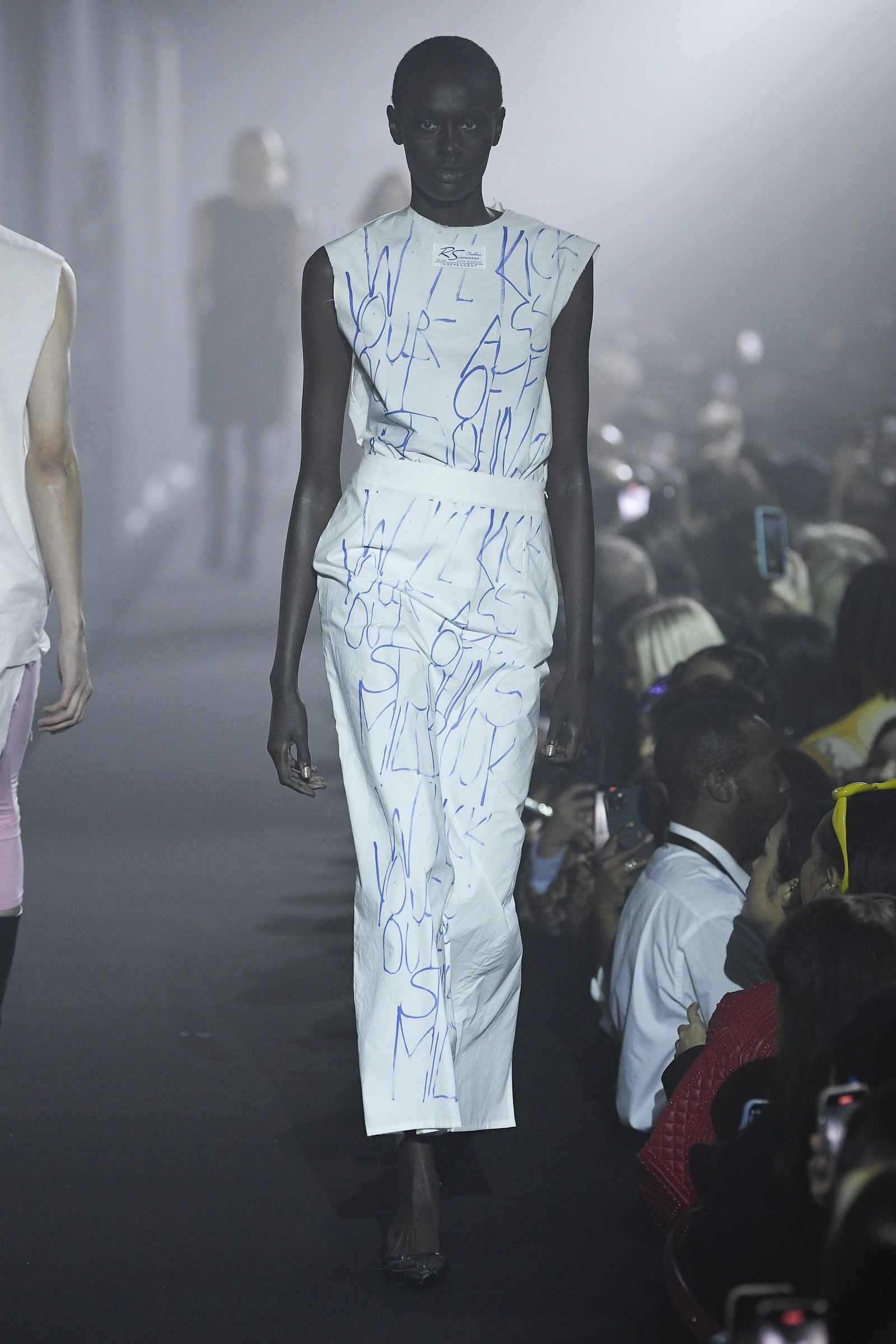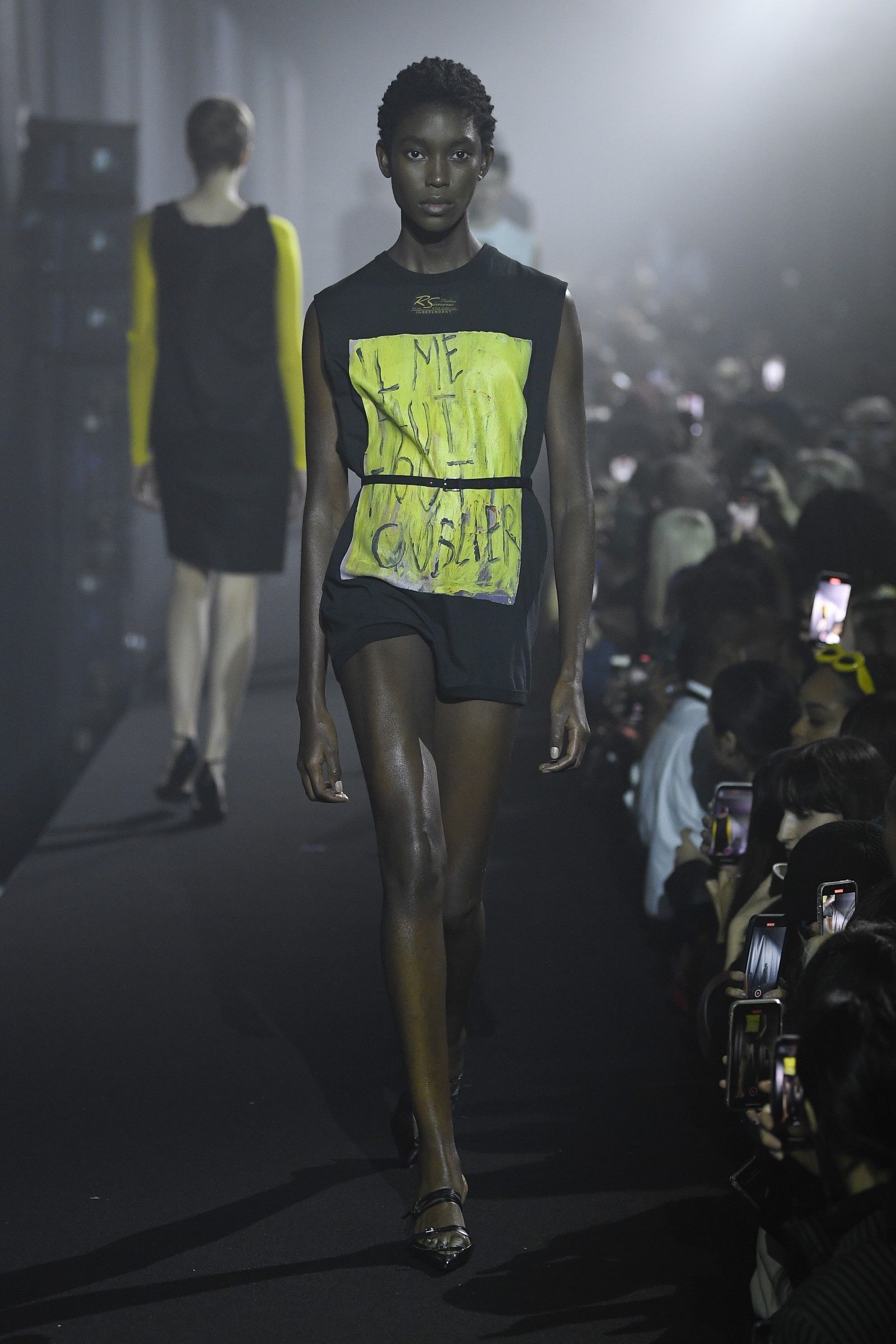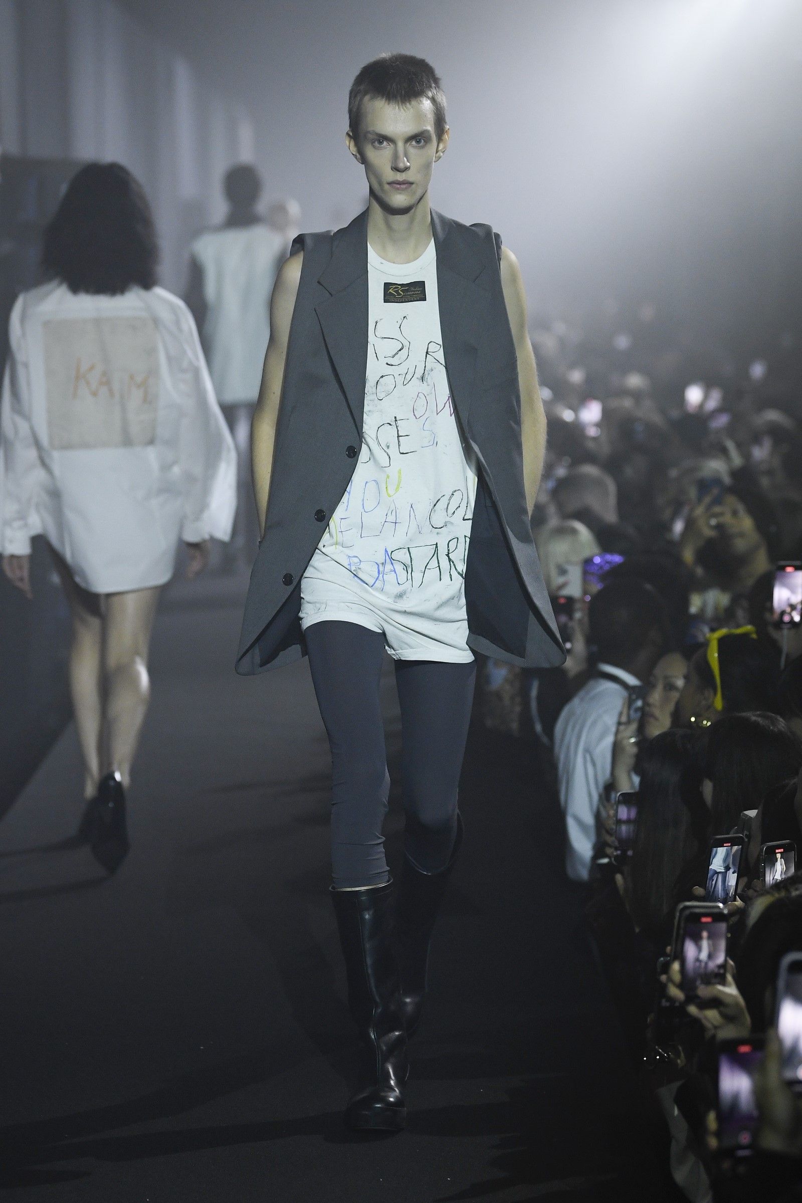 For his return to the catwalks after last February's FW22 digital show, Raf Simons chose London's famous Printworks club where the audience, left standing, watched as models plowed a very narrow catwalk to the ominous rhythm of pounding techno music. The catwalk, so cramped that in the finale the models' shoulders brushed against each other moving in opposite directions, seemed to be a metaphor for a collection that has dried and shrunk the brand's aesthetic to the point of improbability, eliminating its layered, studiously chaotic citationism and replacing it with a work of simplification whose final outcomes, on the clothes, became almost surreal. The theme of reduction was most overtly manifested in the way blazers and shirts were cut down, transforming into sleeveless, undershirts or tank tops with sharp hems - all elements of a hyper-thin layering that preferred to fit the body rather than covering it or changing its silhouette as, for example, the monumental sweaters and coats of past collections did. Elsewhere, tops decorated by the hand lettering of Belgian artist Philippe Vandenberg, the author of rough and tortured works that tell of the human condition with dry brutality, were like crude panels of cloth transformed into tops and long dresses with pure lines.